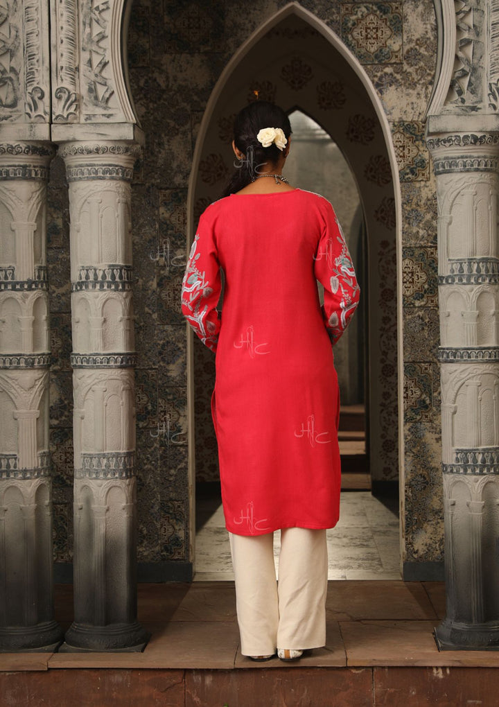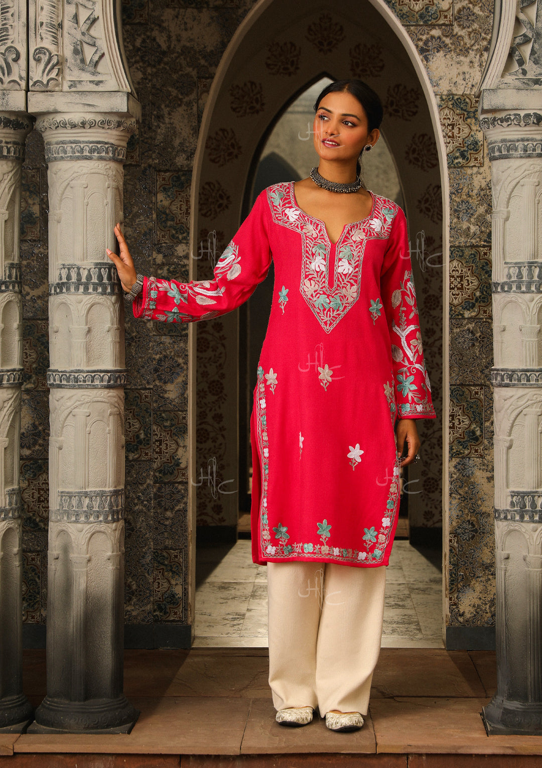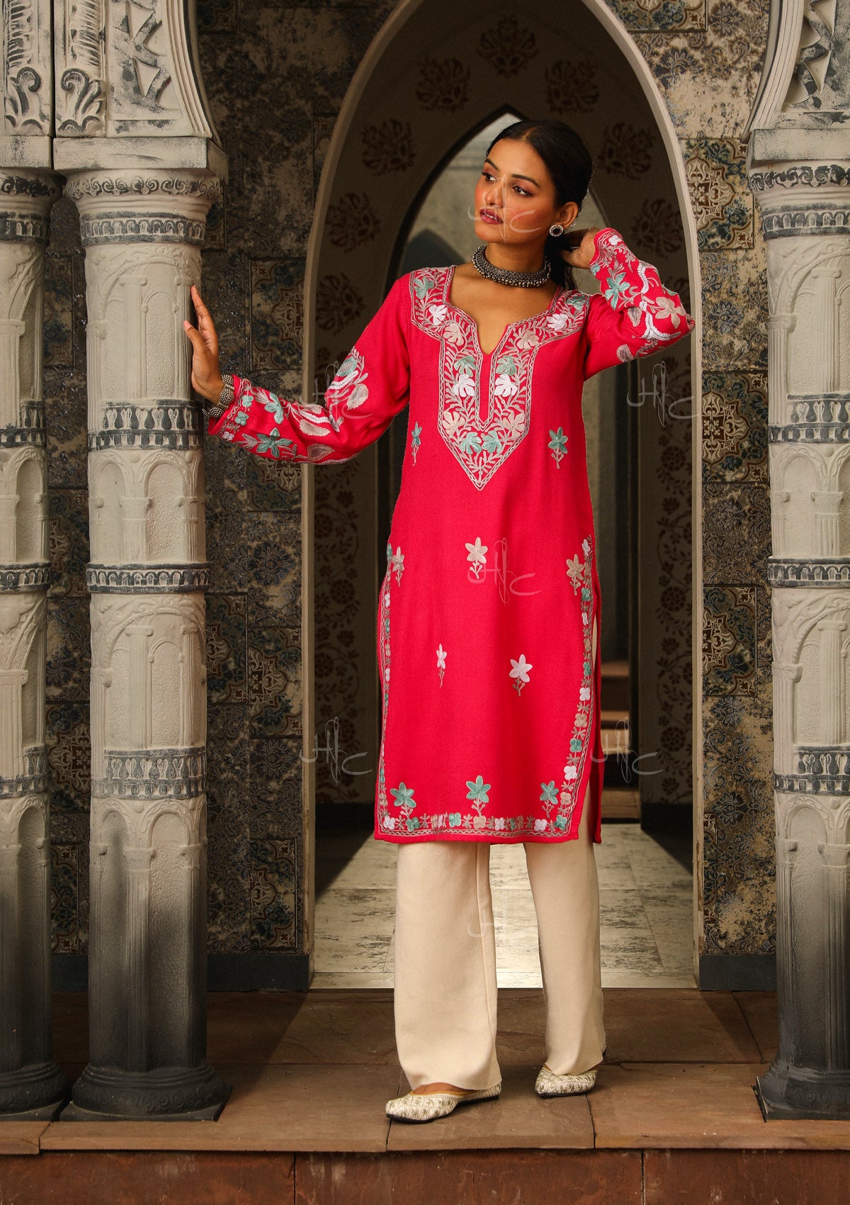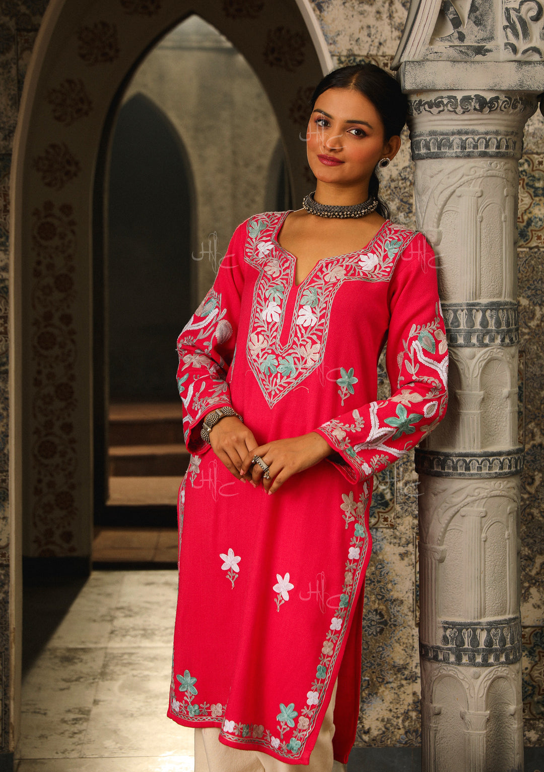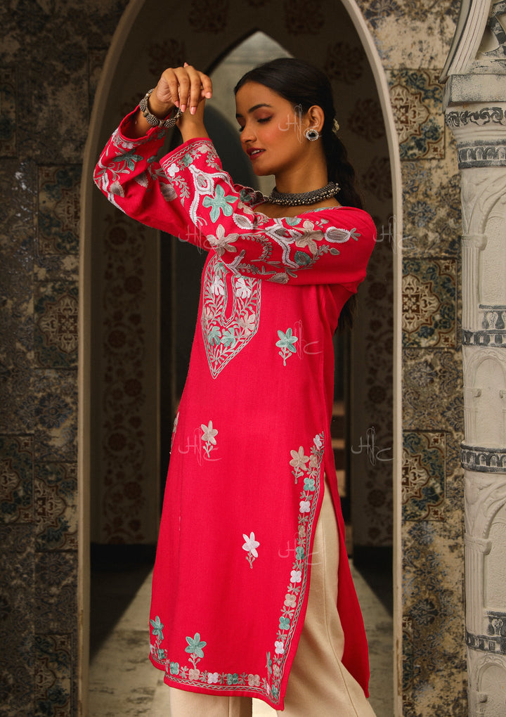 HOC Kasmira Aari Embroidered Wool Straight Kurta-Pink
