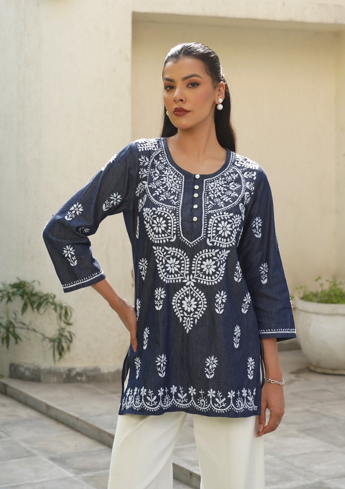 HOC Chambray Denim Chikankari Solid Straight Women's Short Kurta-Dark Blue