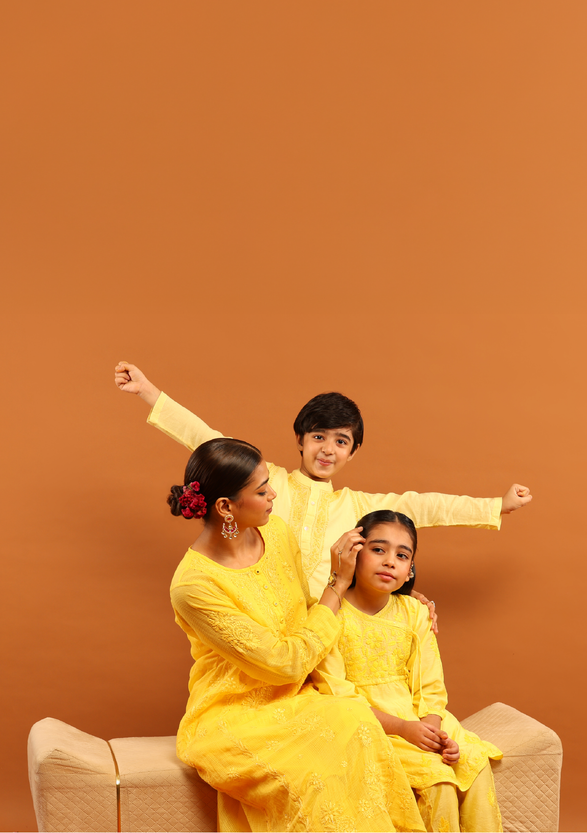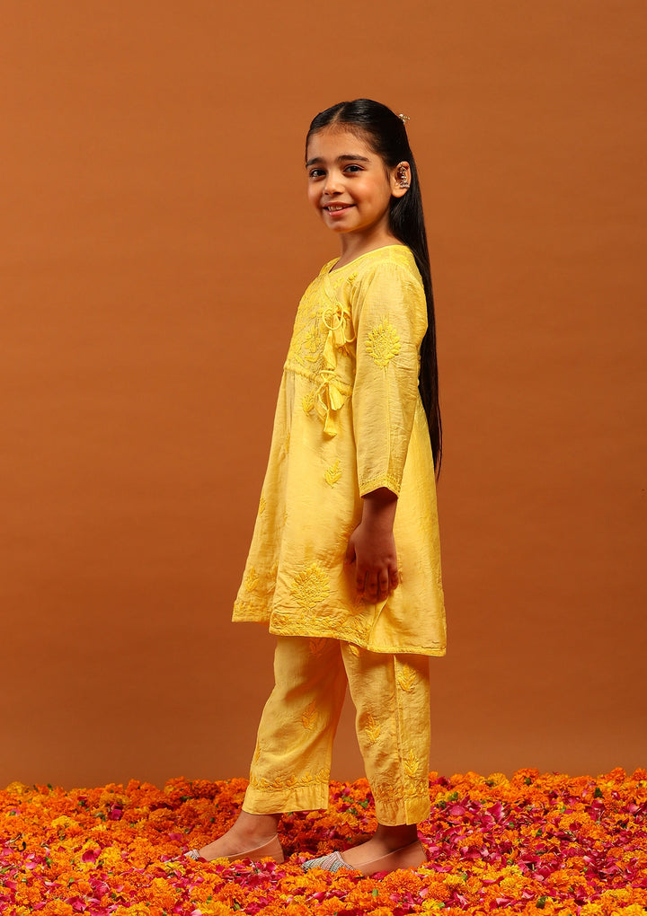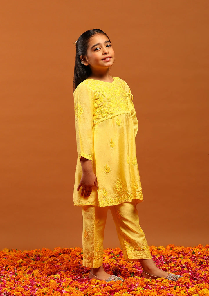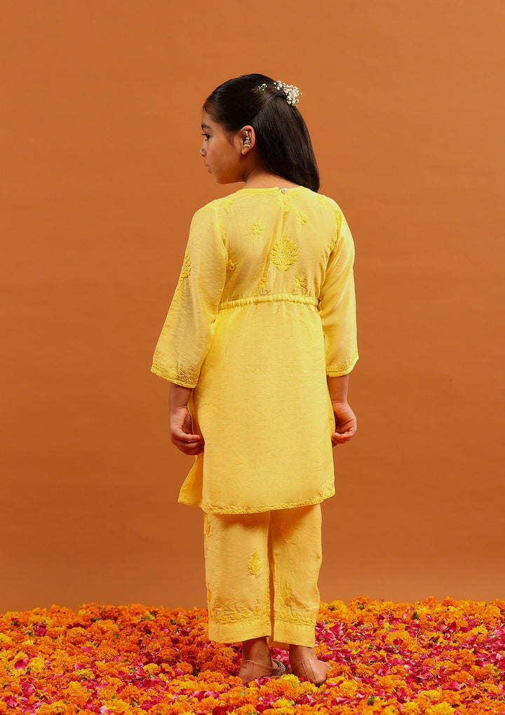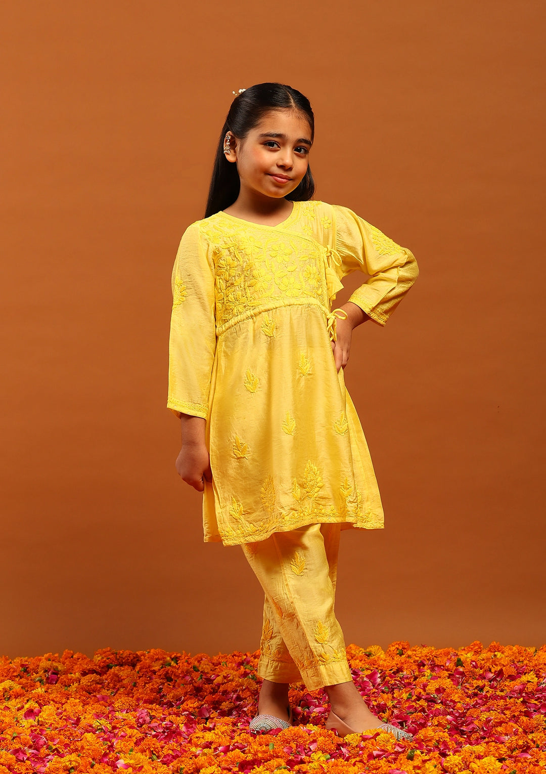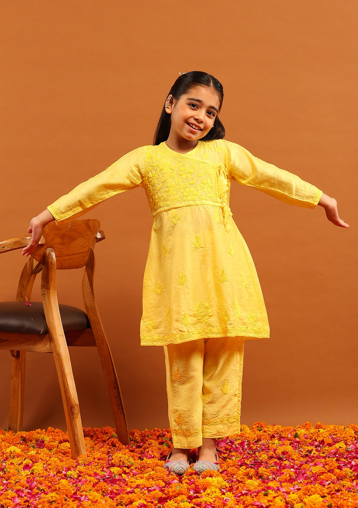 HOC Chanderi Chikankari Solid Girl's 2 PC Kurta Set Angrakha-Yellow