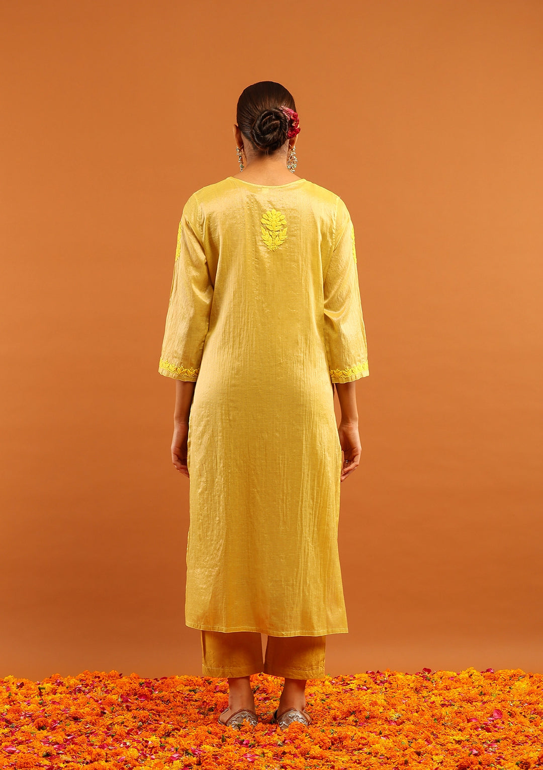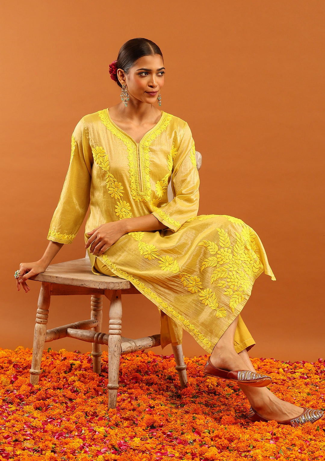 HOC Tissue Silk Chikankari Solid Women's Long Kurta With Inner-Yellow