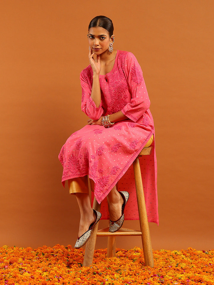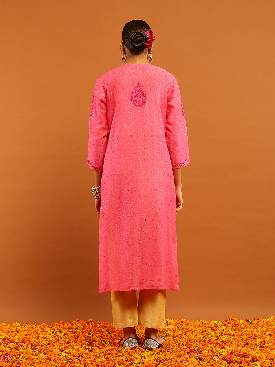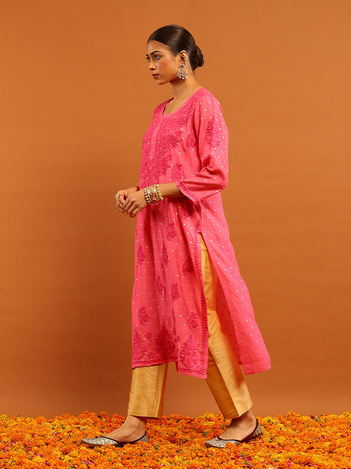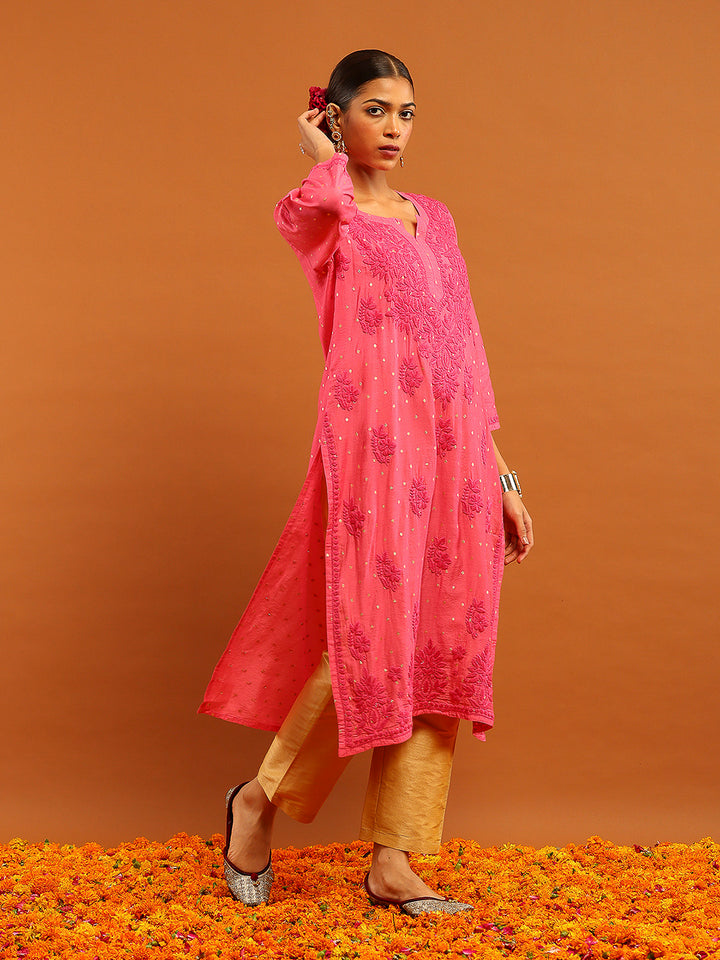 HOC Banarasi Chanderi Chikankari Solid Women's Long Kurta- Dark Pink