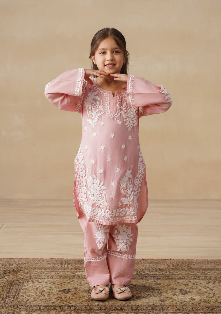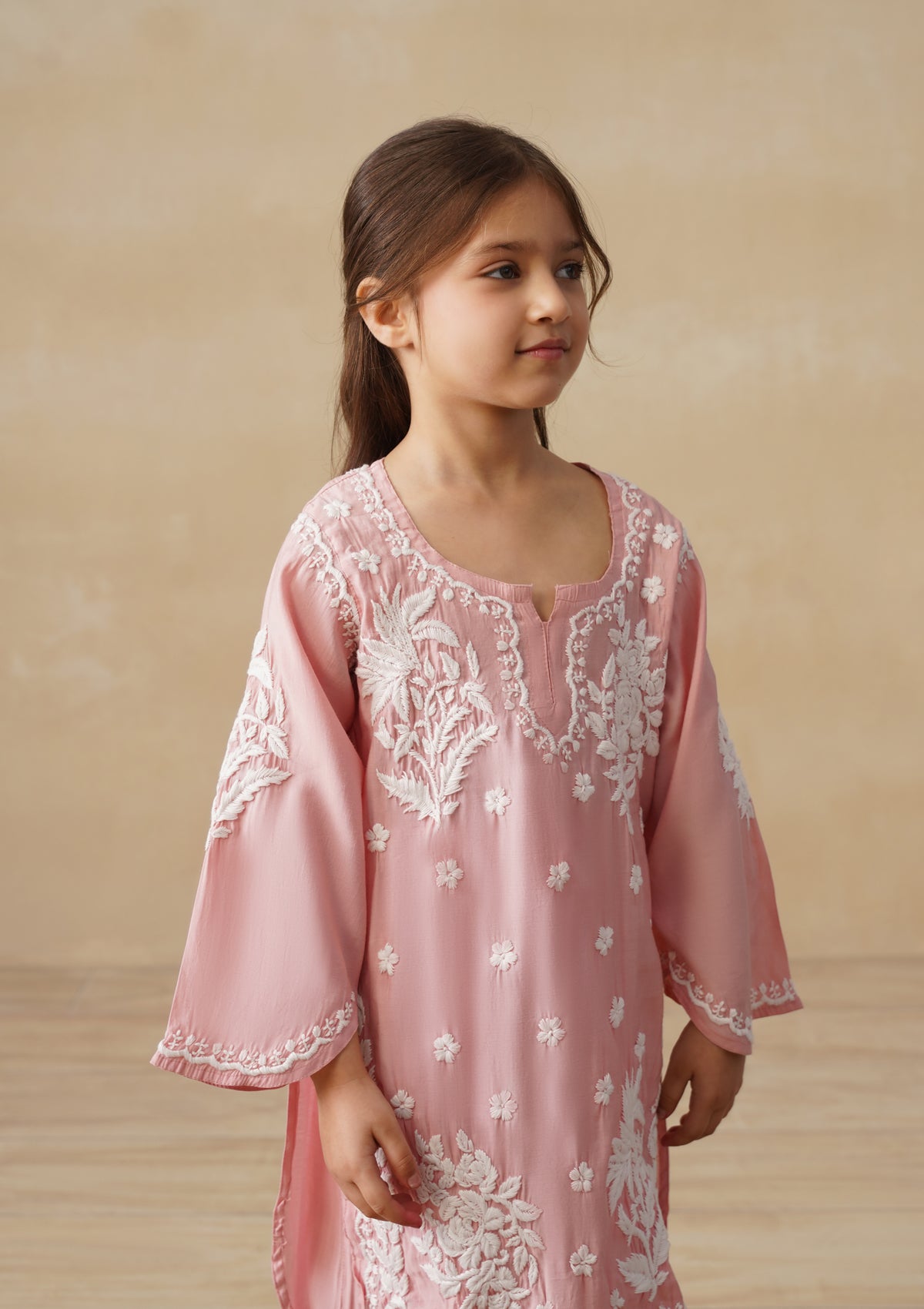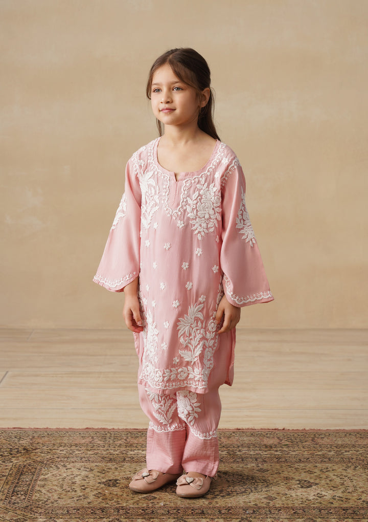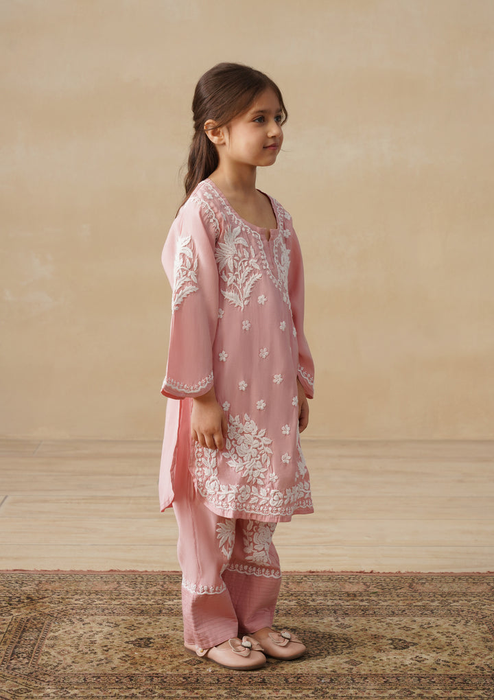 HOC Chanderi Chikankari Solid Girls 2 PC Long Kurta Set - Pink