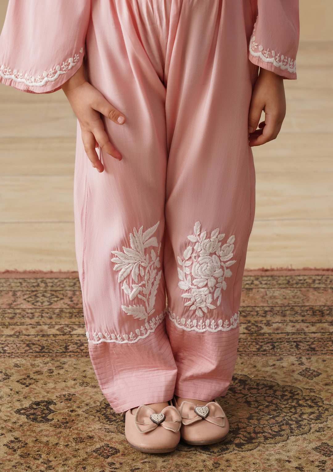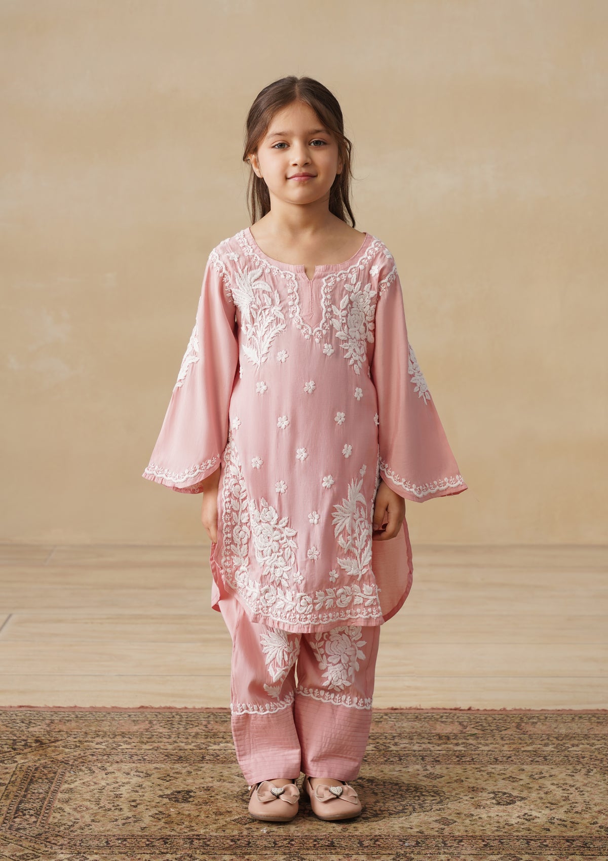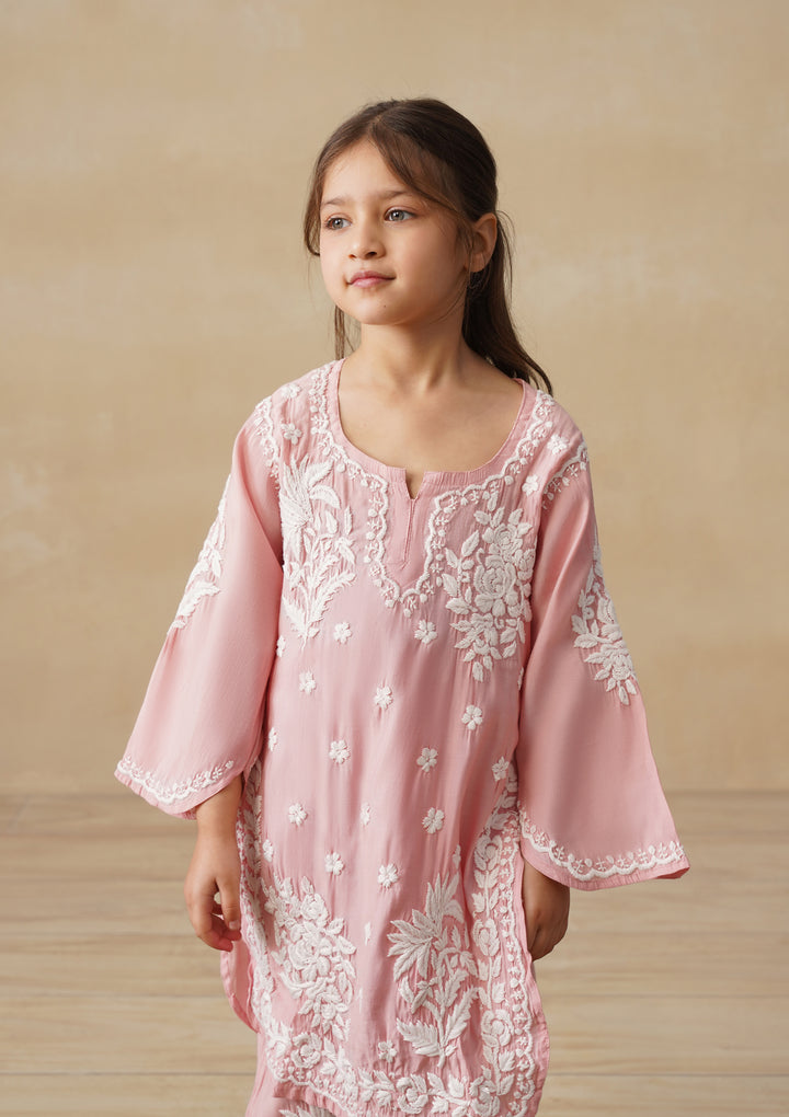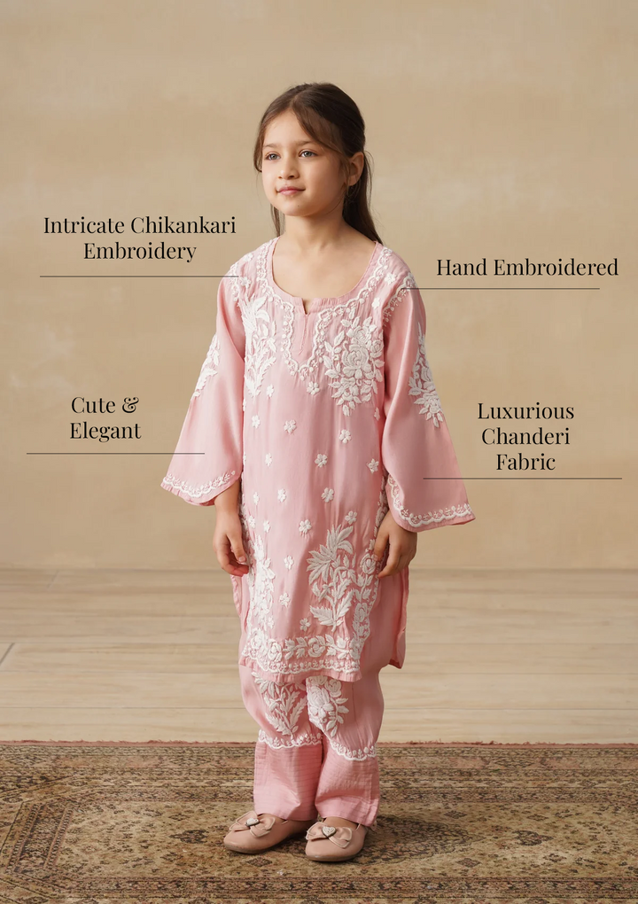 HOC Chanderi Chikankari Solid Girls 2 PC Long Kurta Set - Pink