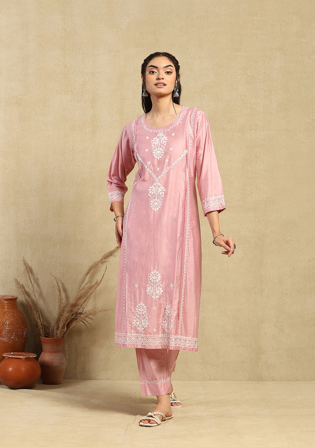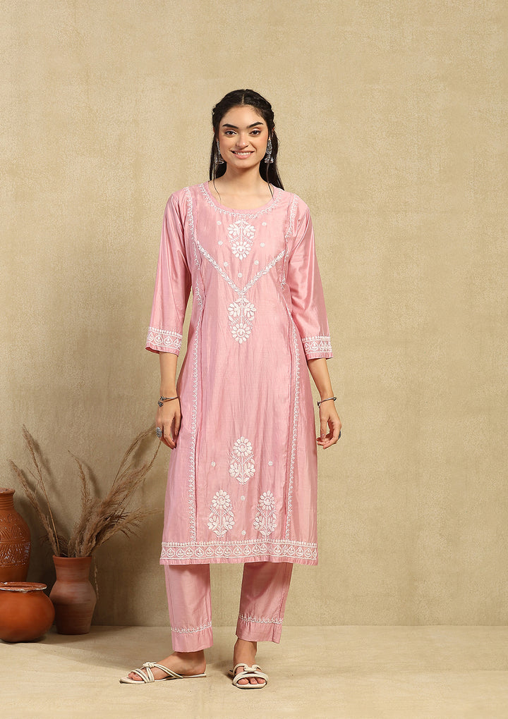 HOC Chanderi Chikankari Solid Women's 2PC Long Kurta Set -Pink
