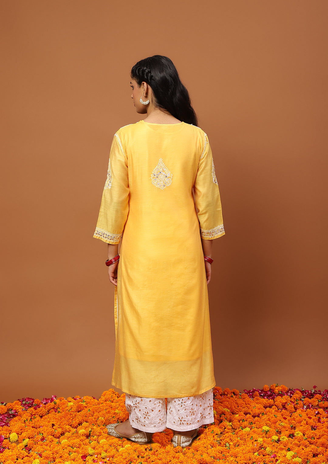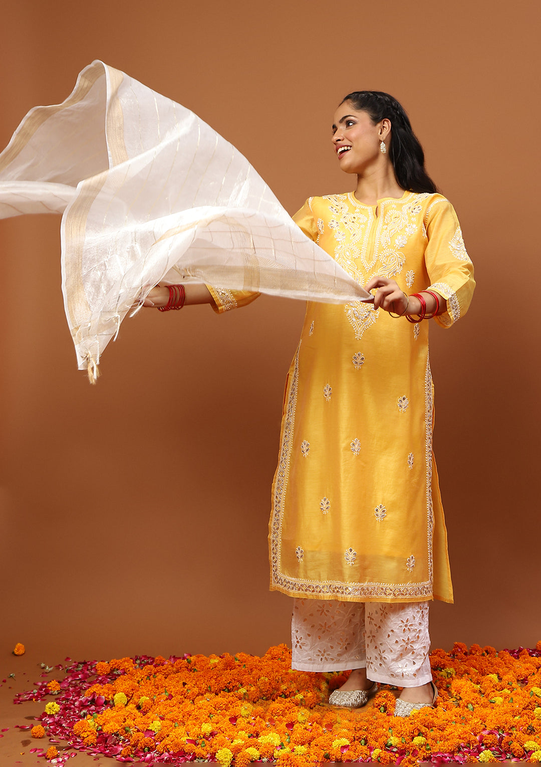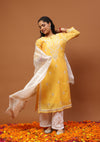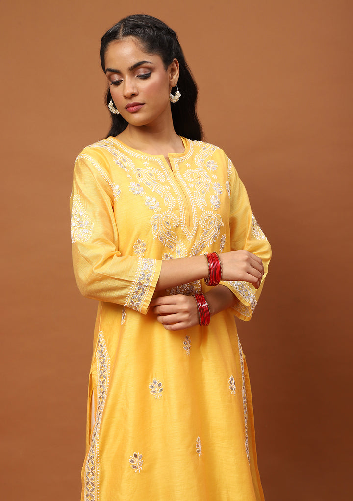 HOC Chanderi Chikankari Gota Work Solid Women's 4 PC Long Kurta Set -Mustard