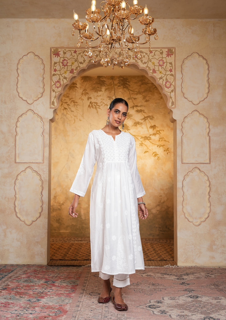 HOC Chanderi Chikankari Solid Women's Long Kurta - White