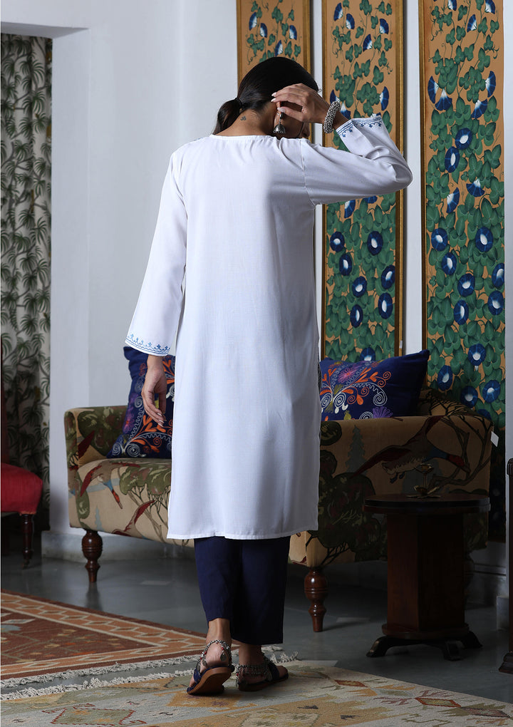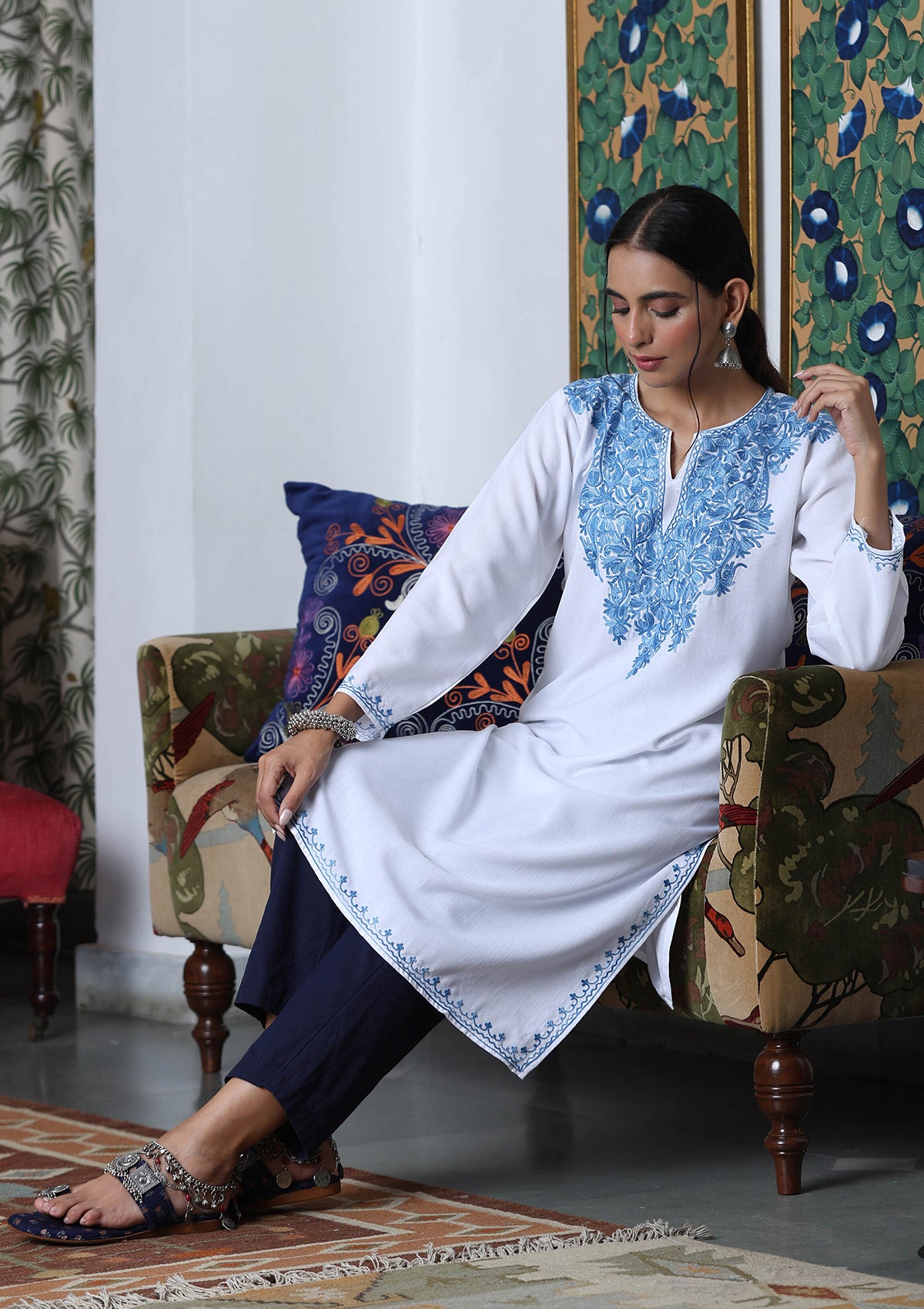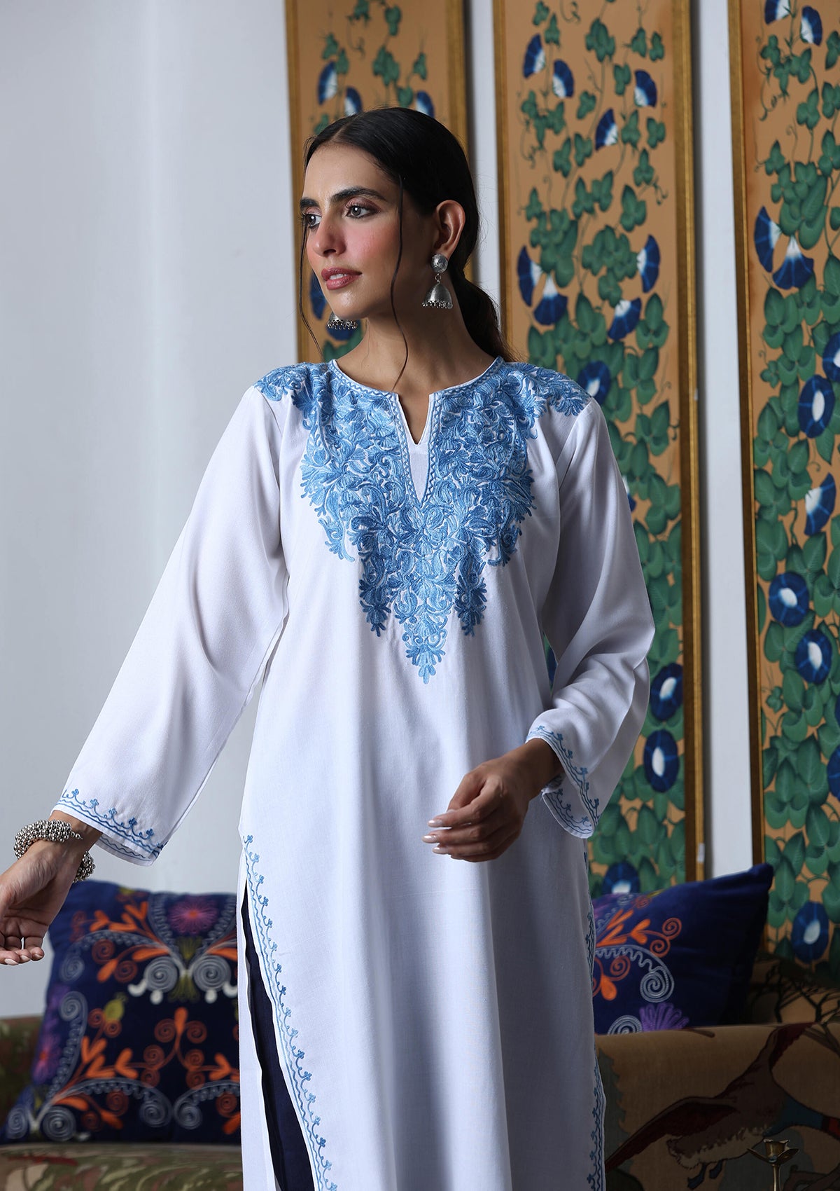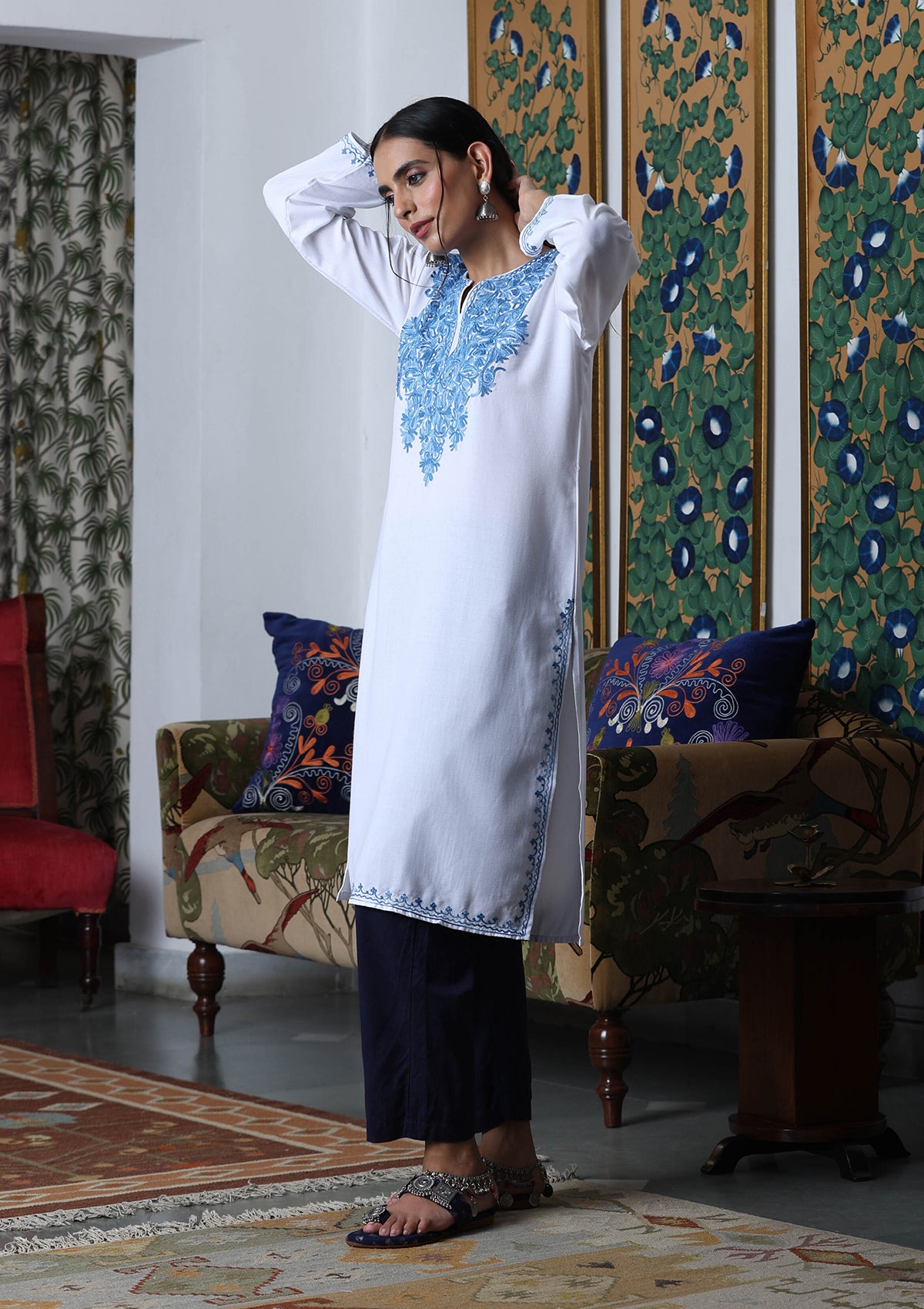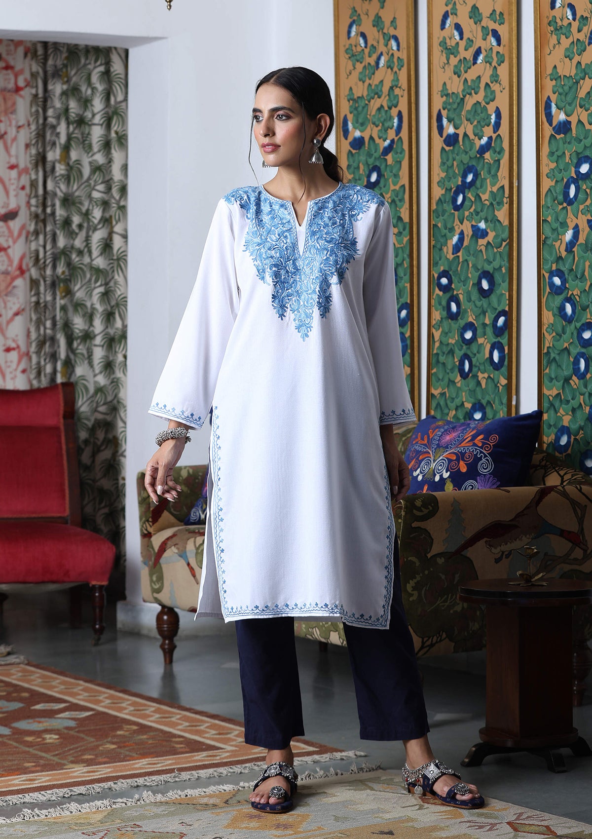 HOC Crafts Aari Embroidered Cotton Solid Women's Long Kurta - White