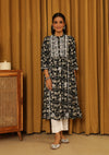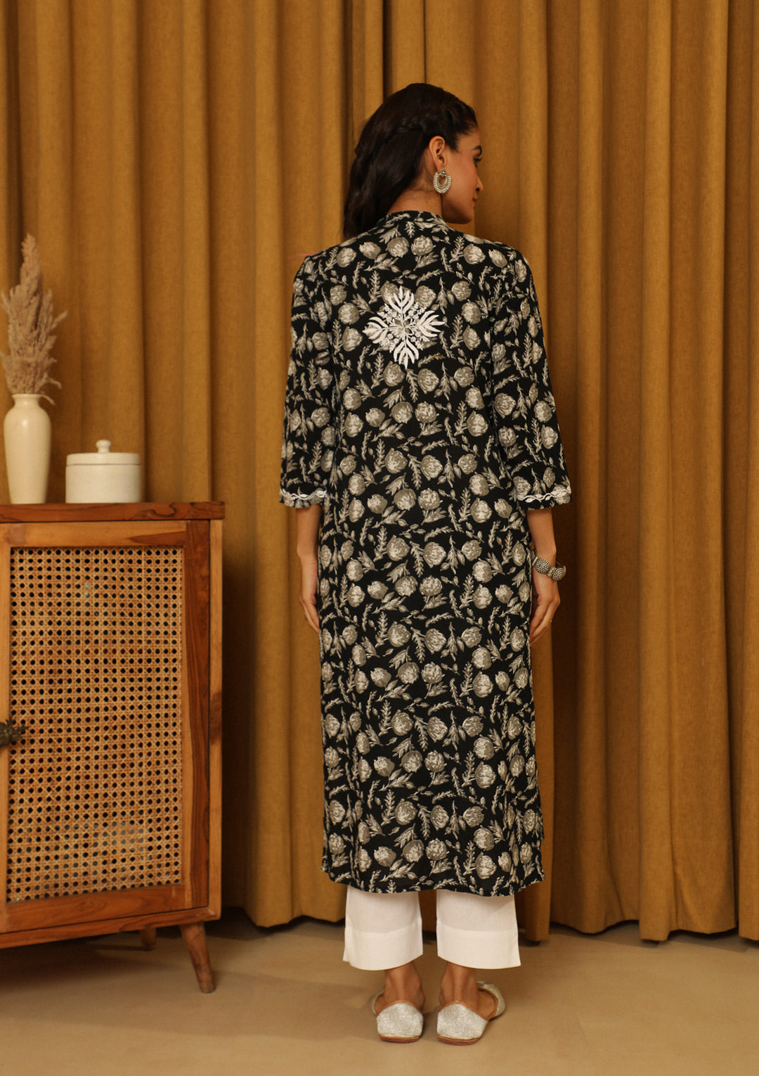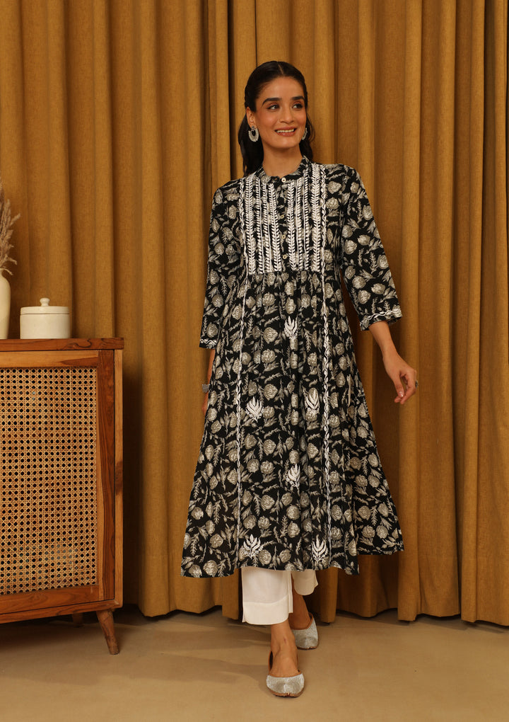 HOC Cotton Chikankari Printed Women's Long Kurta - Black