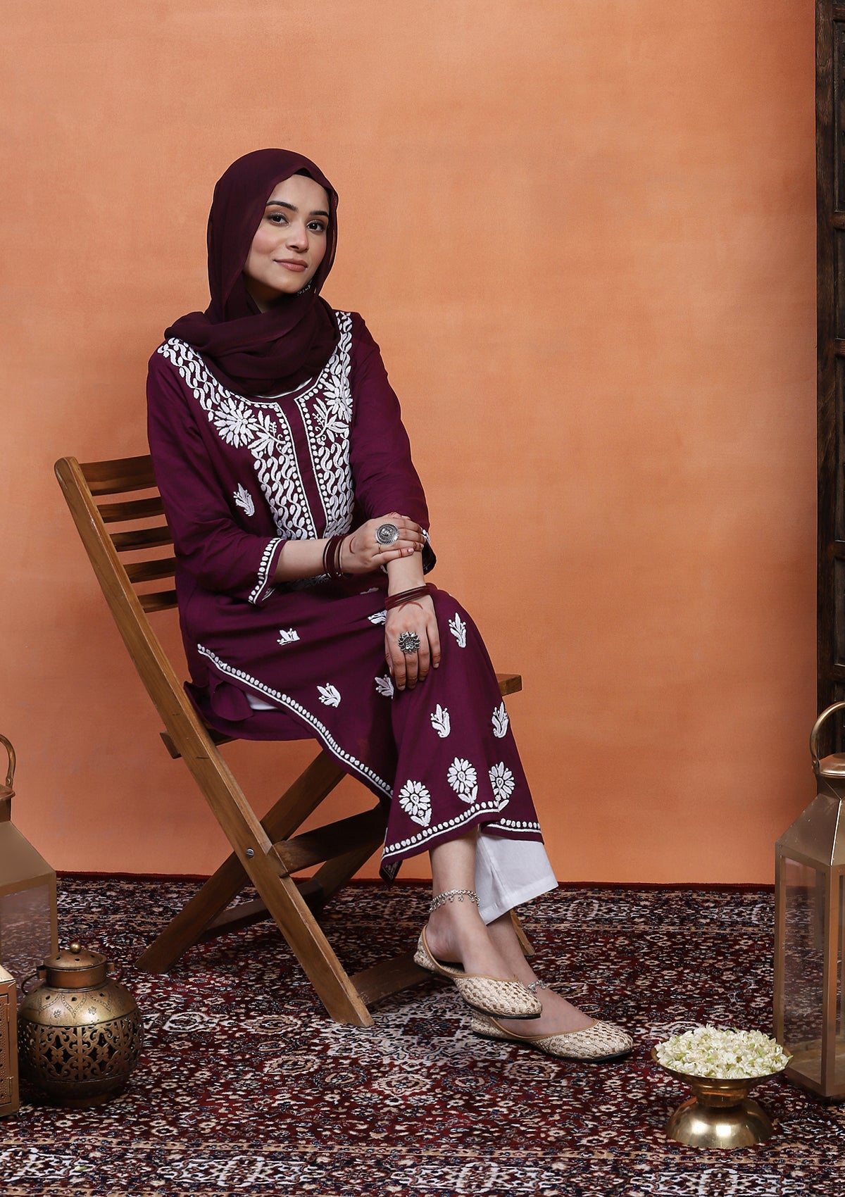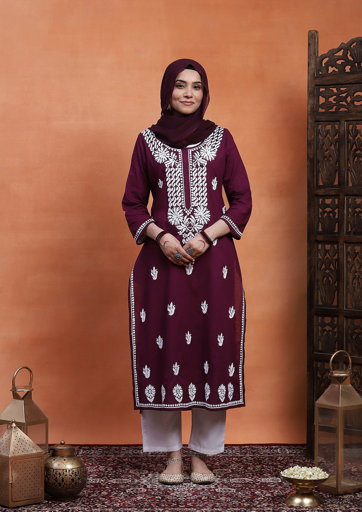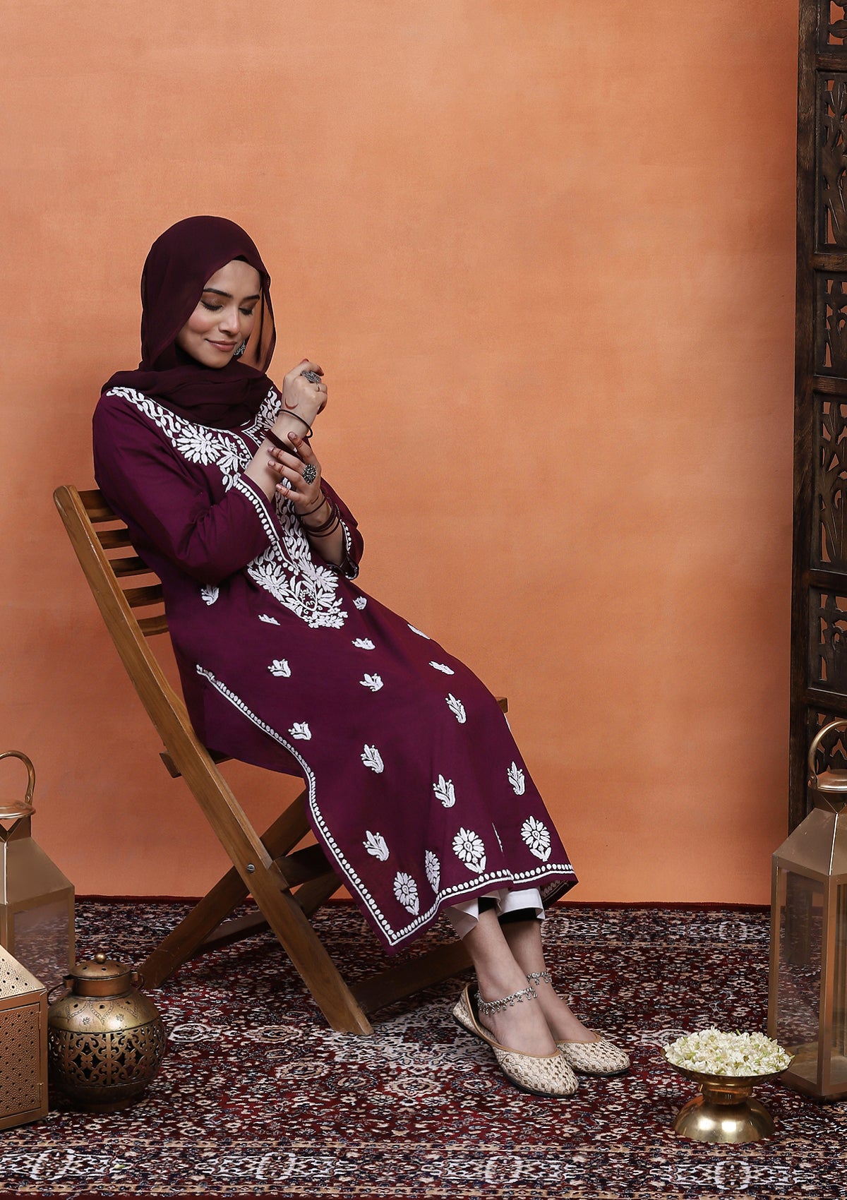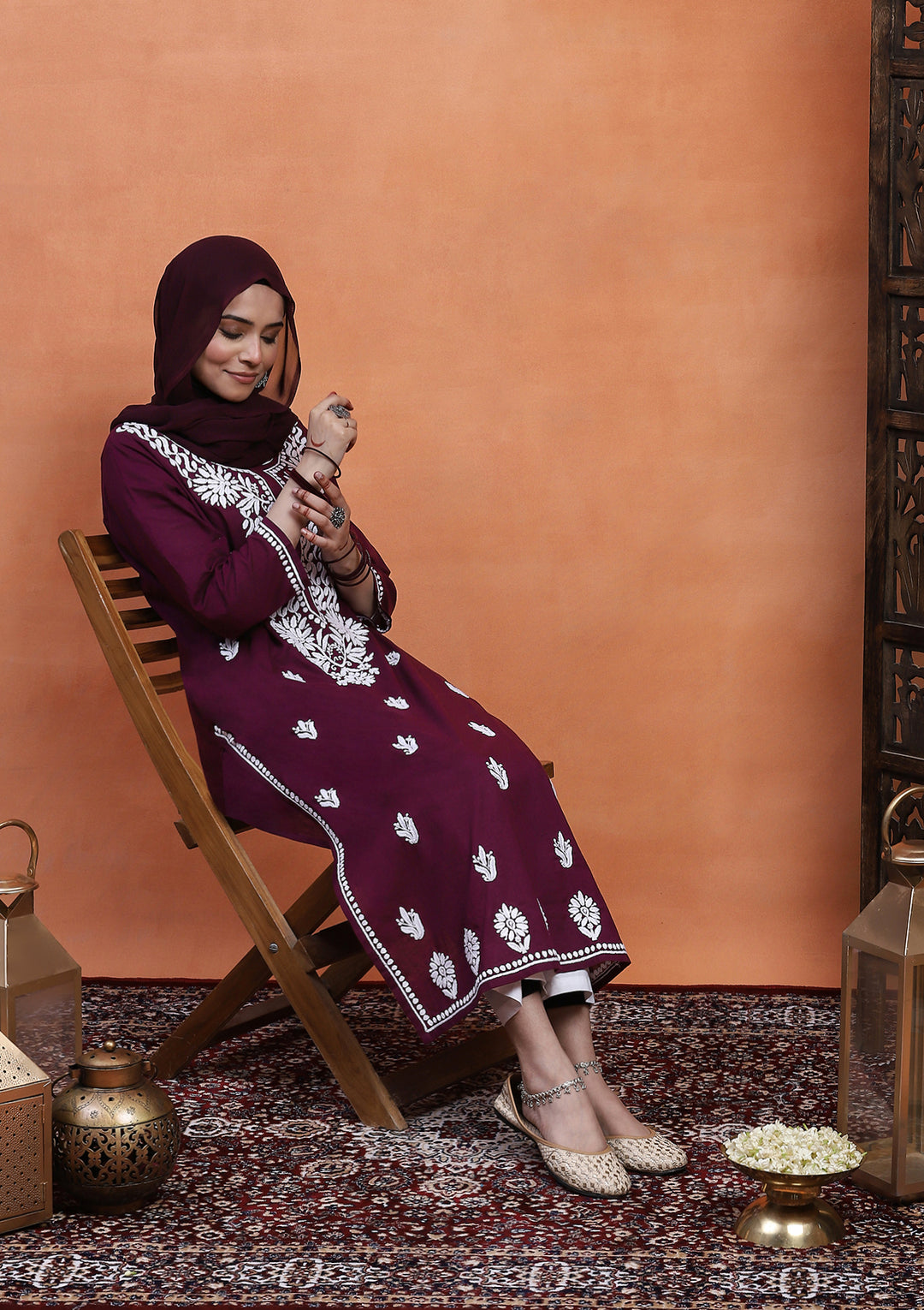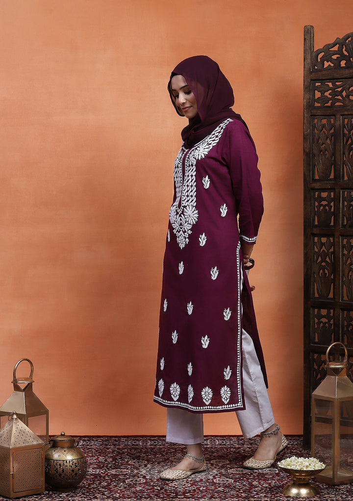 HOC Cotton Chikankari Solid Women's Long Kurta - Dark Purple