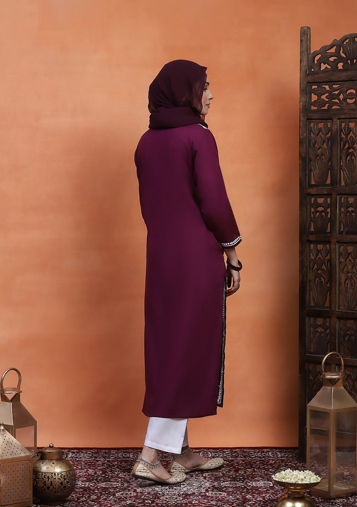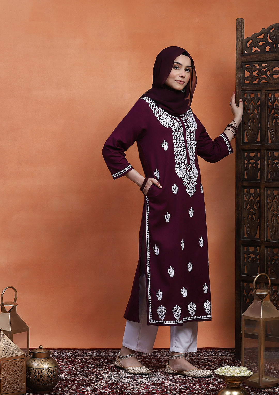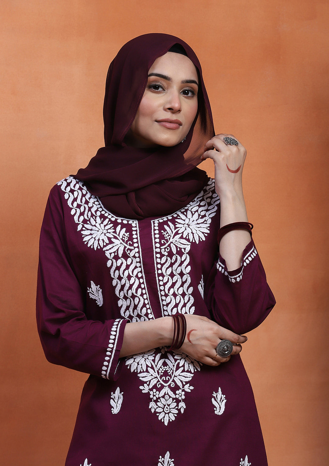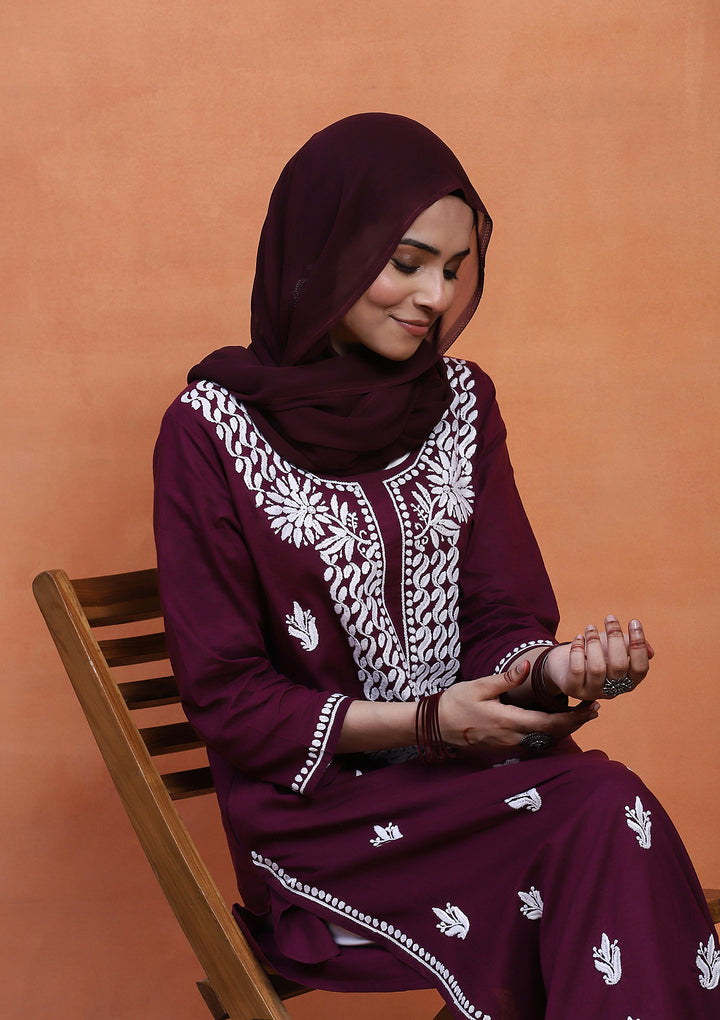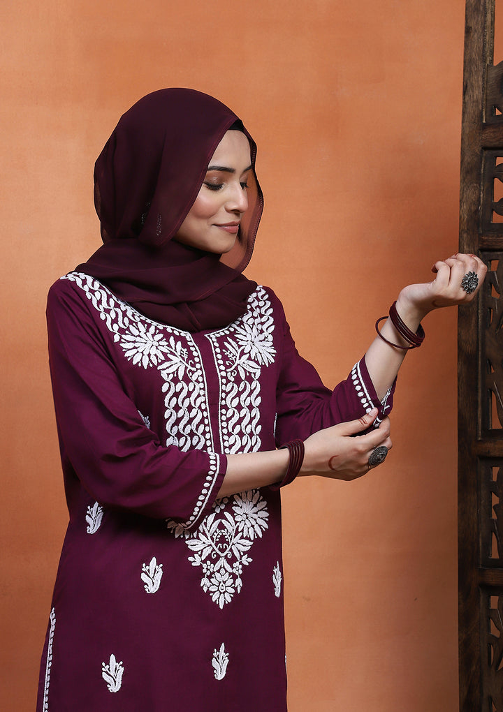HOC Cotton Chikankari Solid Women's Long Kurta - Dark Purple