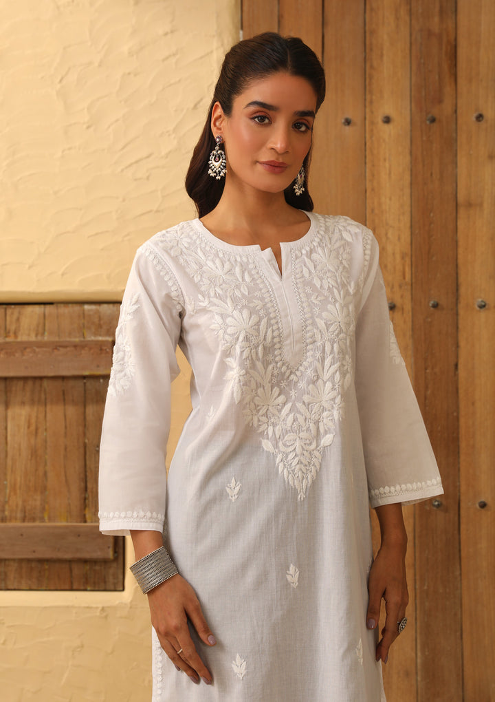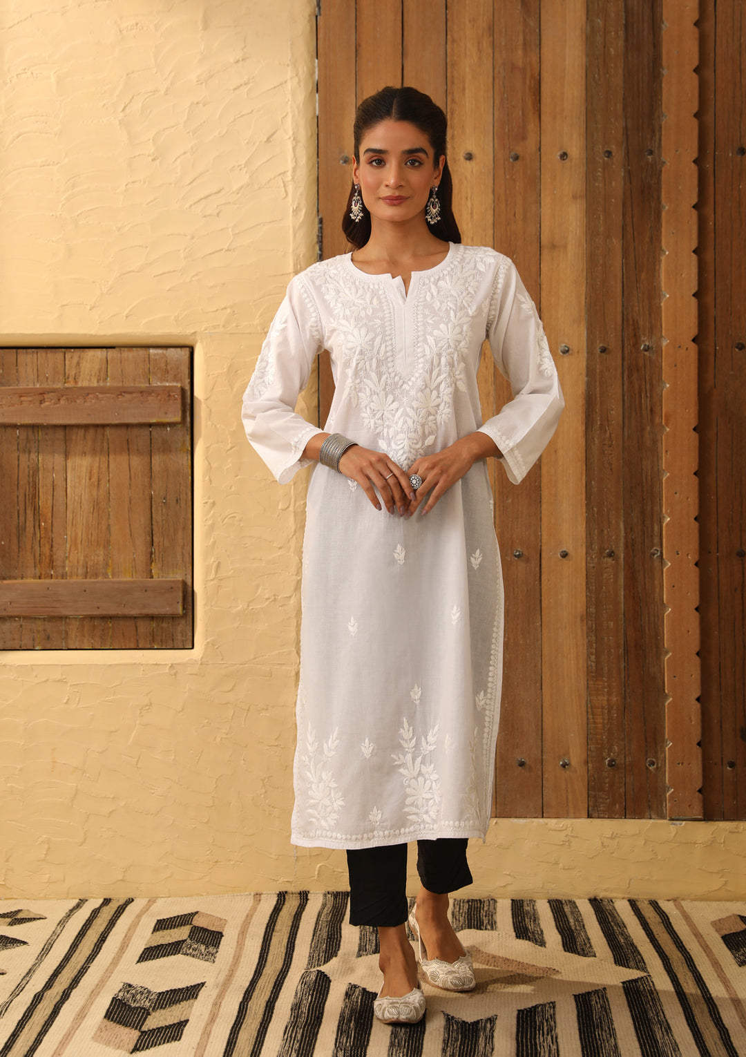 HOC Cotton Chikankari Solid Women's Long Kurta - White