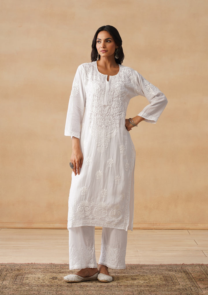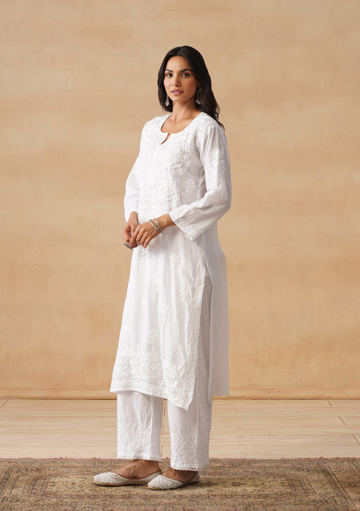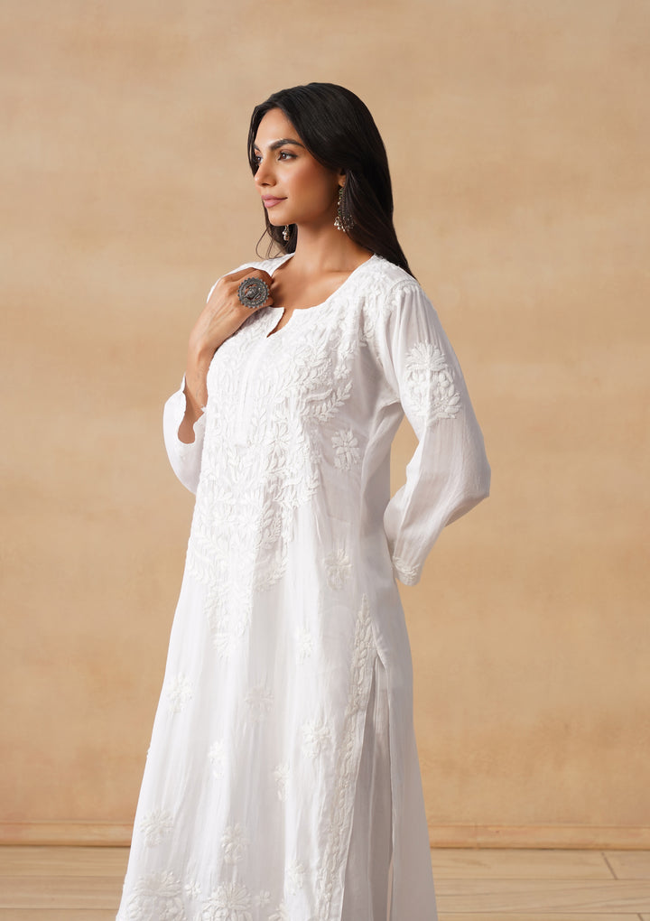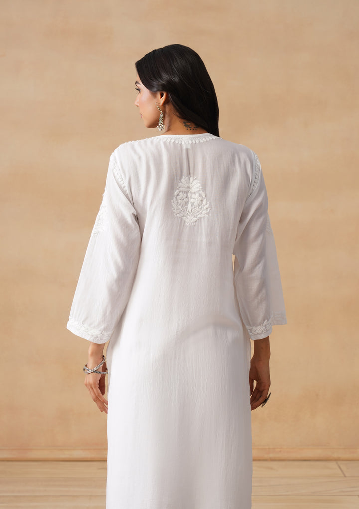 HOC Cotton Chikankari Solid Women's Long Kurta - White