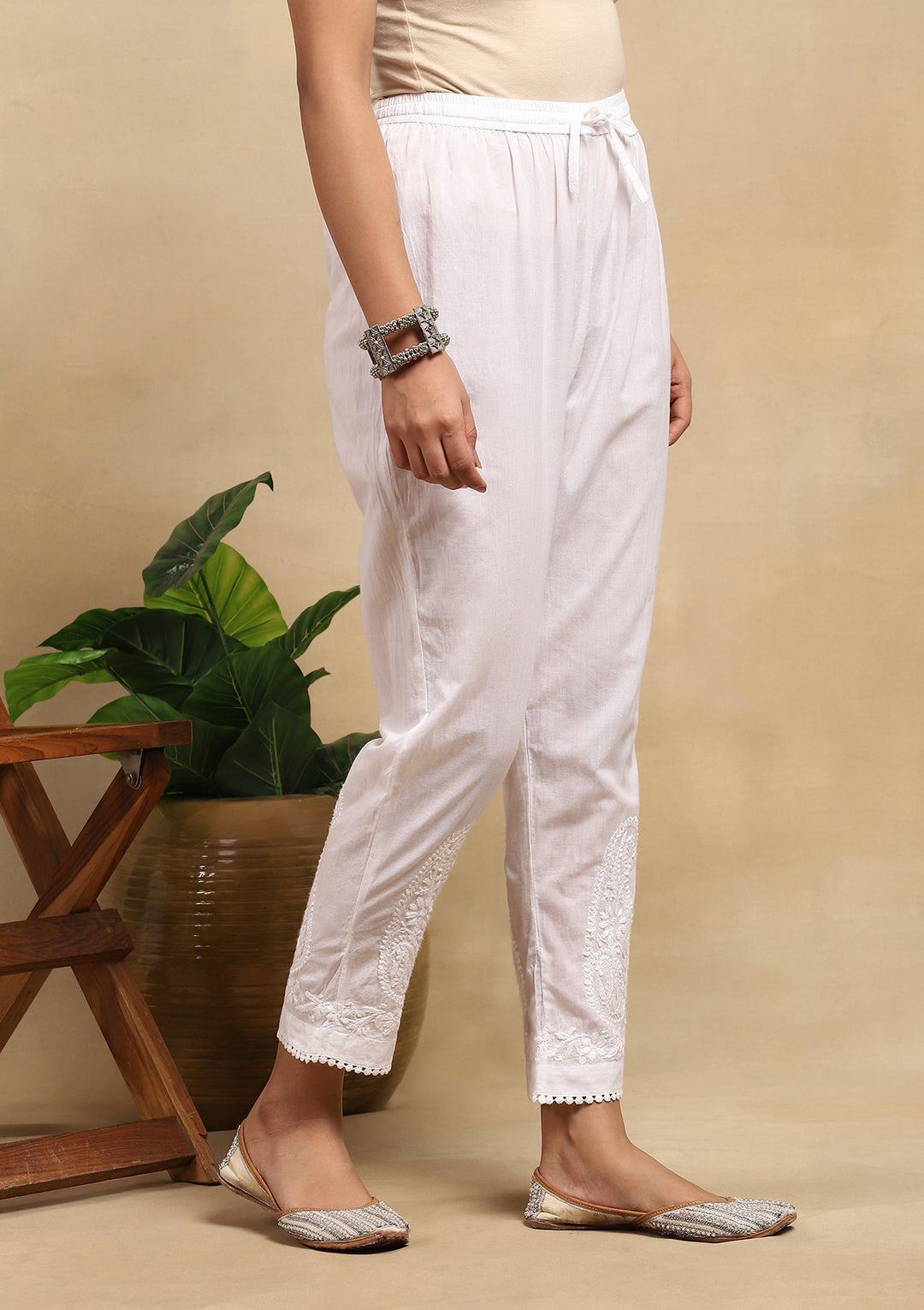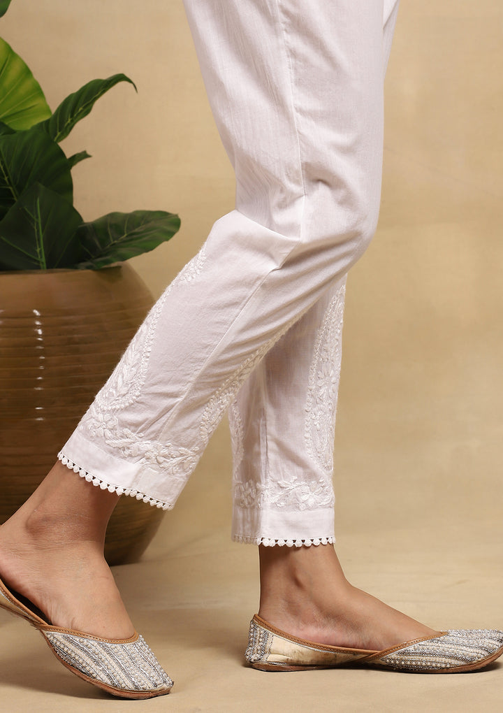 HOC Cotton Chikankari Solid Women's Pants With Lace - White