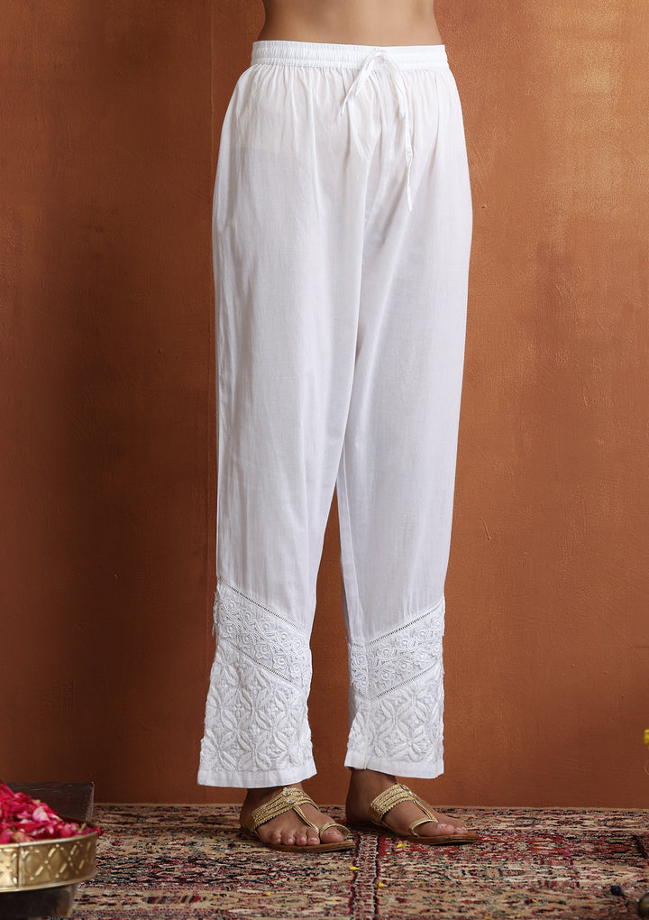 HOC Cotton Chikankari Solid Women's Pants With Lace - White