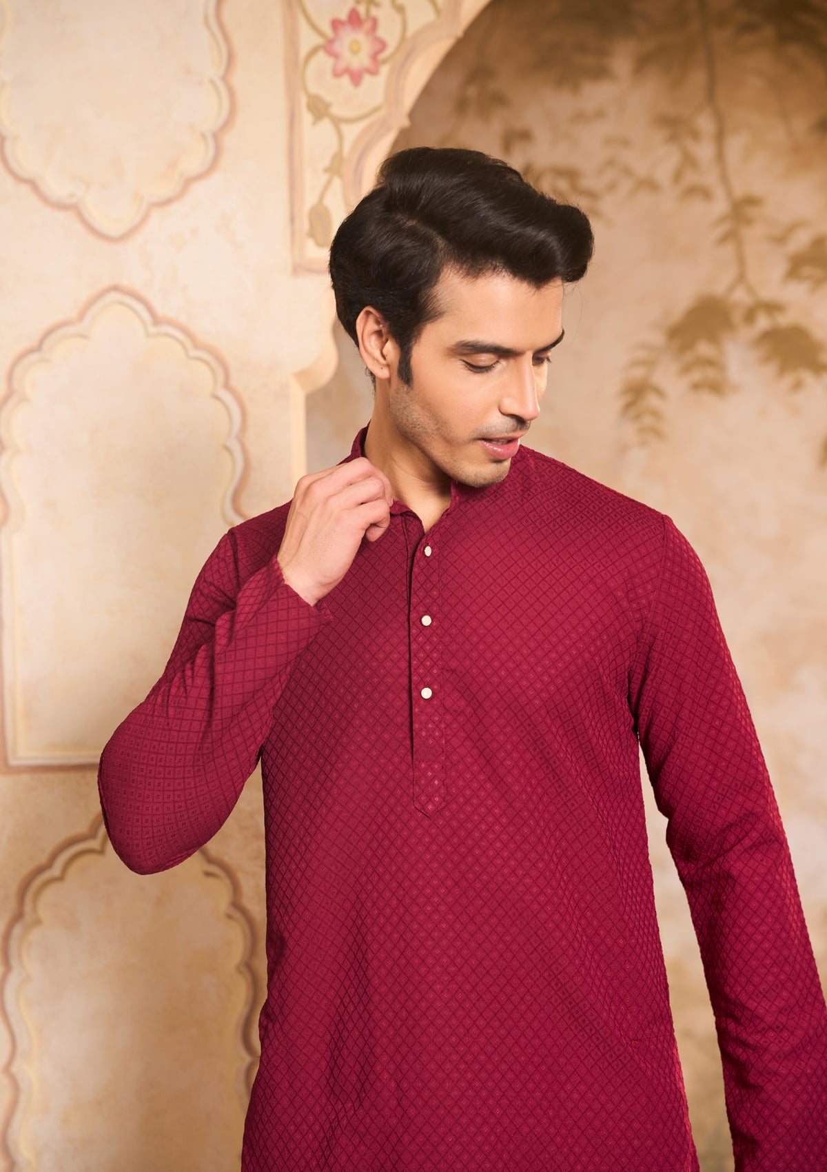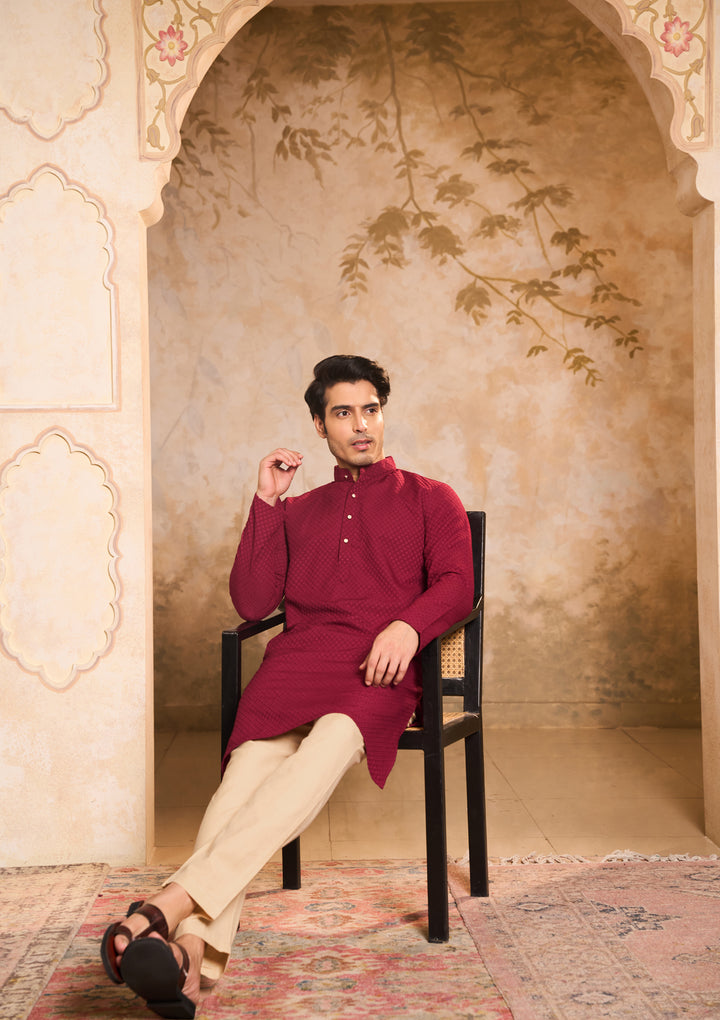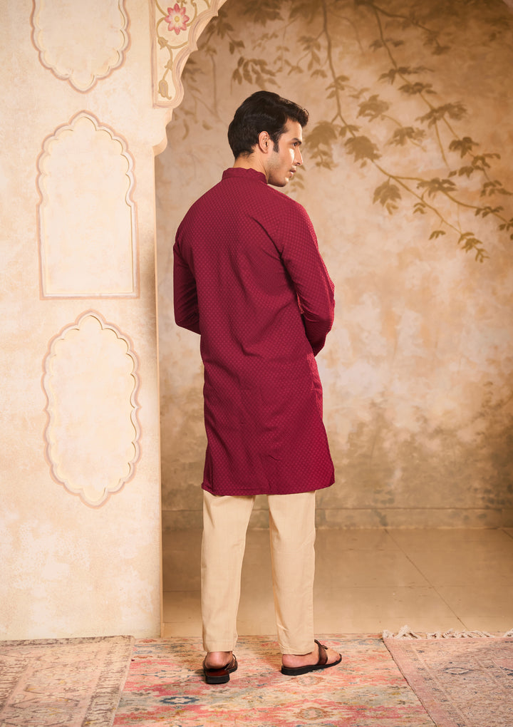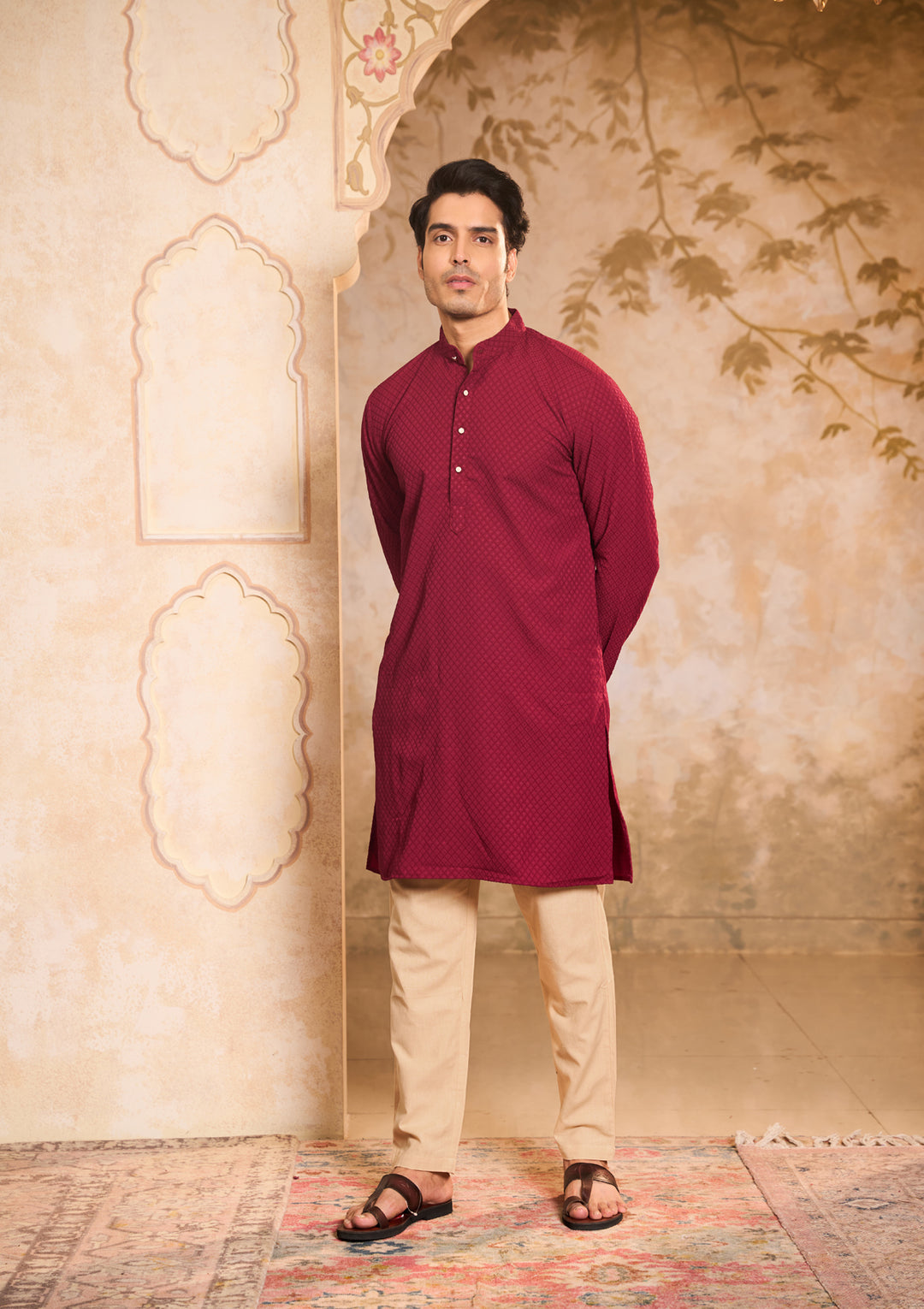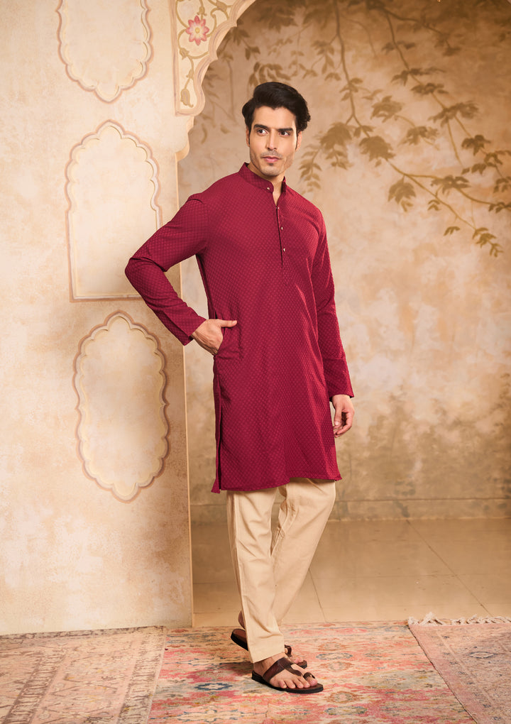 HOC Dobby Textured Solid Men's Long Kurta - Maroon