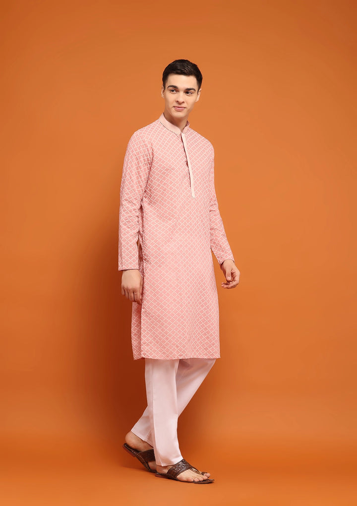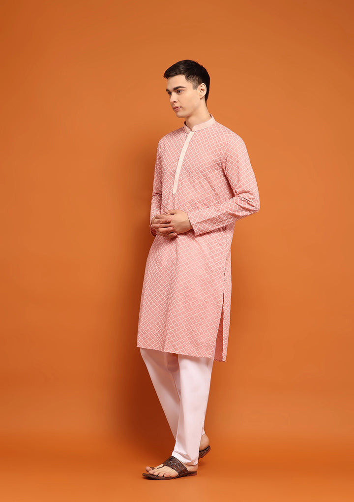 HOC Dobby Textured Solid Men's Long Kurta - Peach