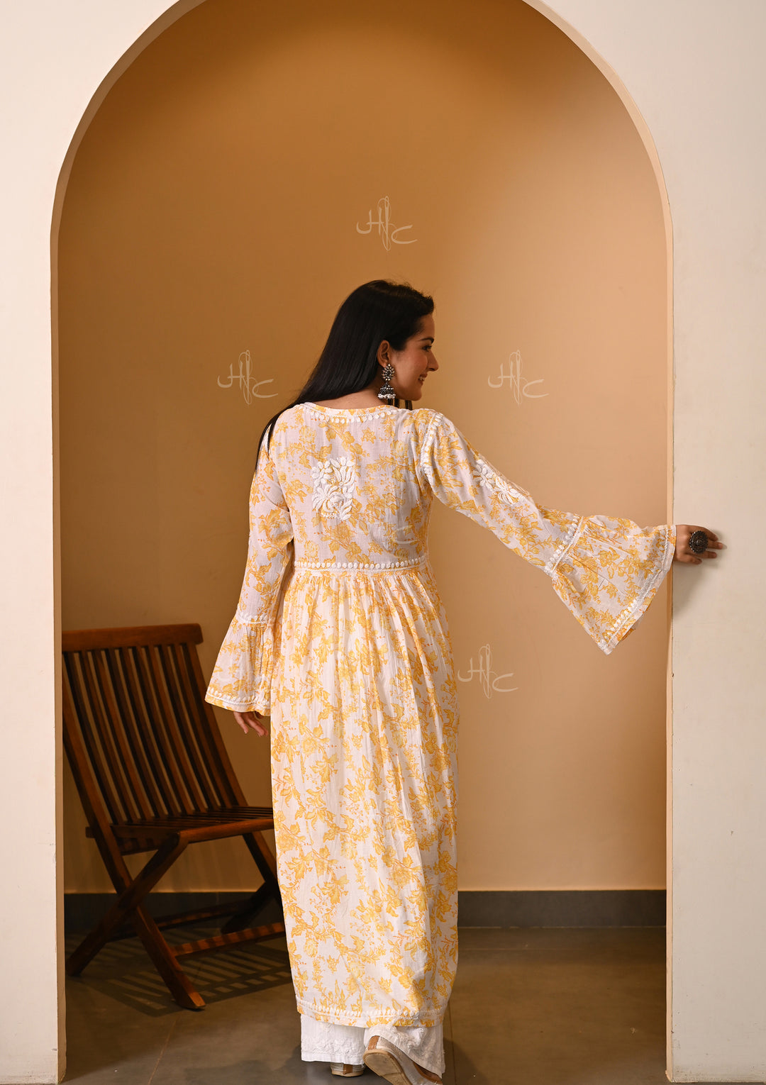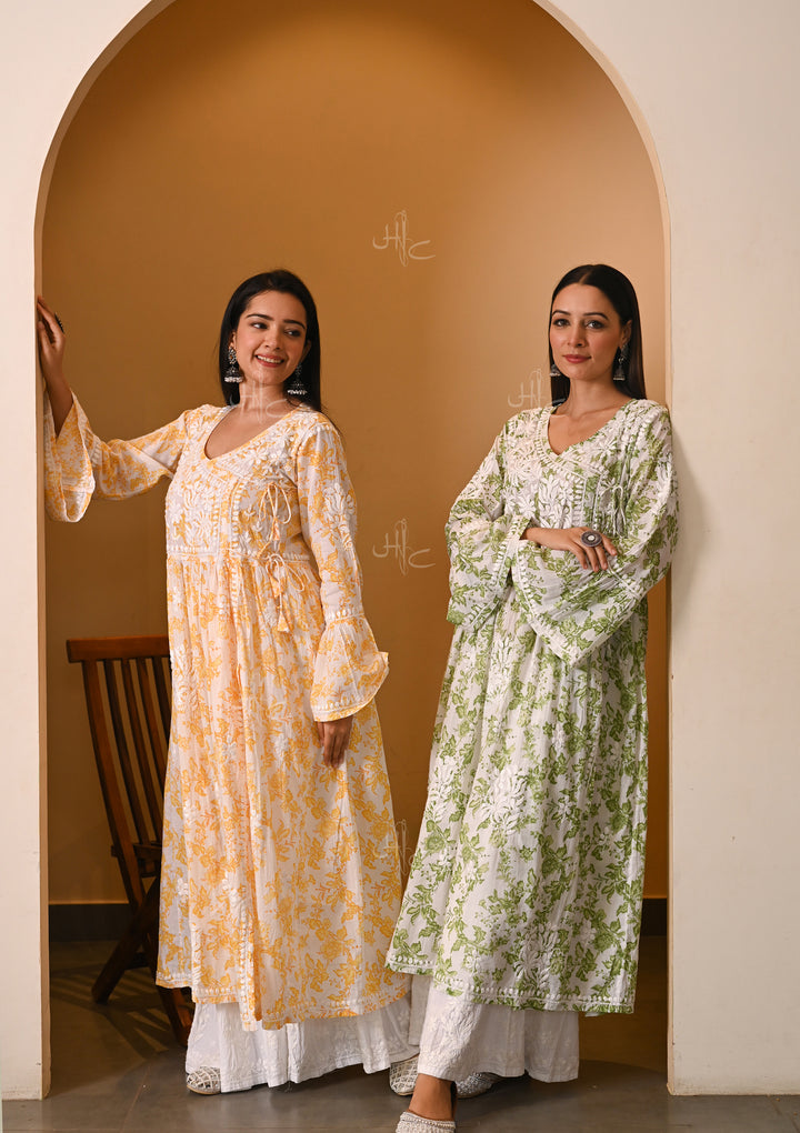 If you are thinking of styling Angrakha kurtis for festive occasions, then look out for a long angrakha kurti with chikankari embroidery on sleeves, front and back from House of Chikankari.