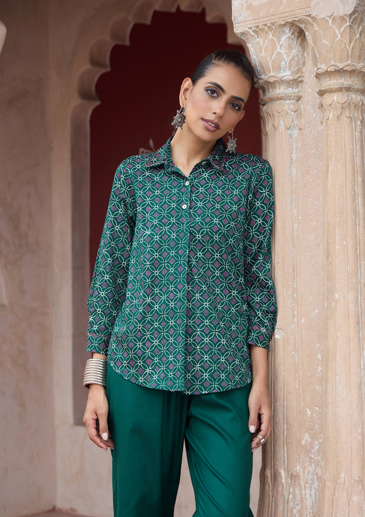 HOC Glazed Cotton Hand Block Printed with Hand Embroidery Women's 2 PC Co-ord Set - Dark Green