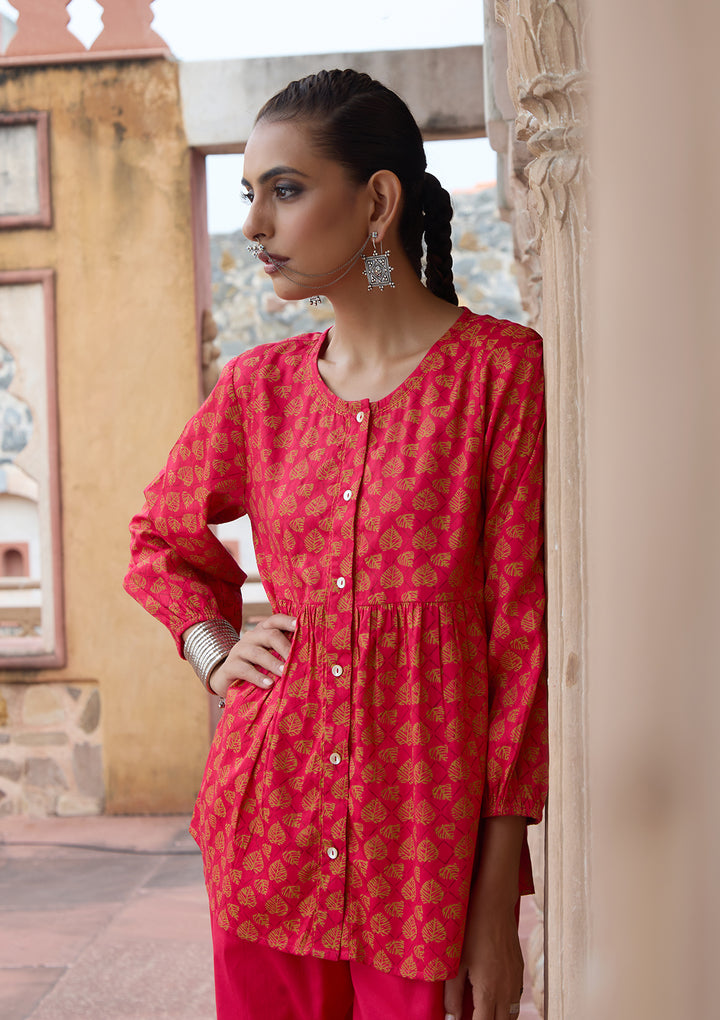 HOC Glazed Cotton Hand Block Printed with Hand Embroidery Women's 2 PC Co-ord Set - Pink