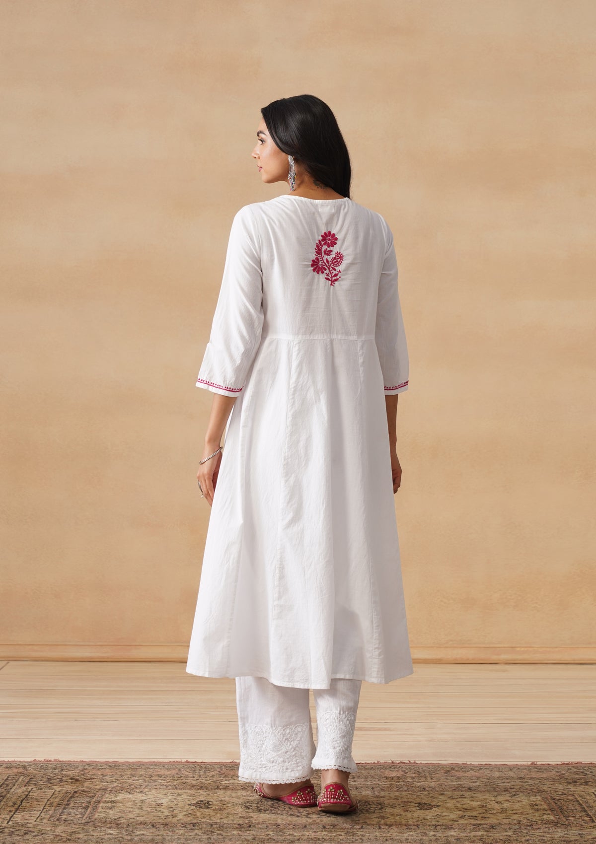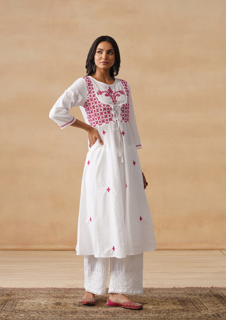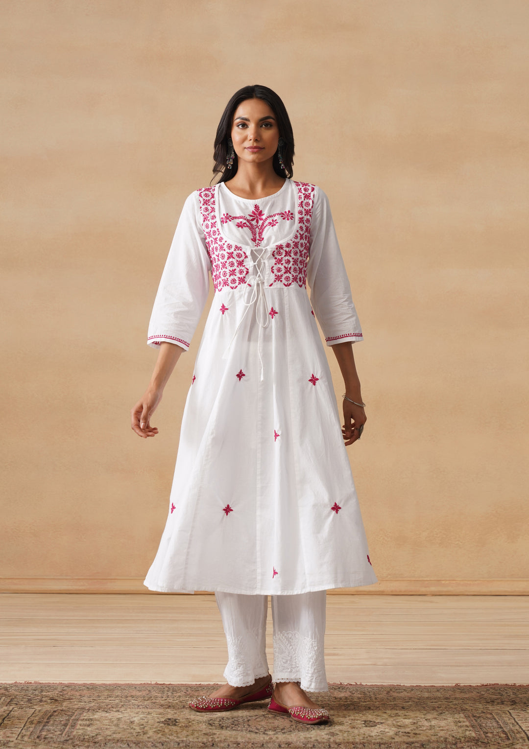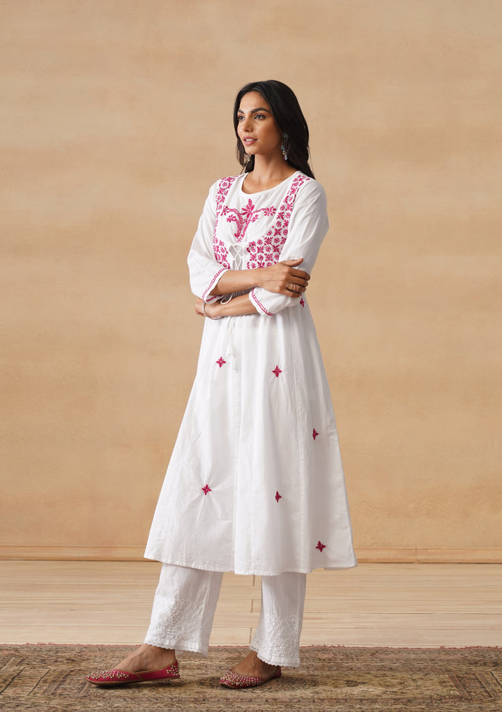 HOC Cotton Chikankari Mughal Solid Flared Women's Long Kurta - White