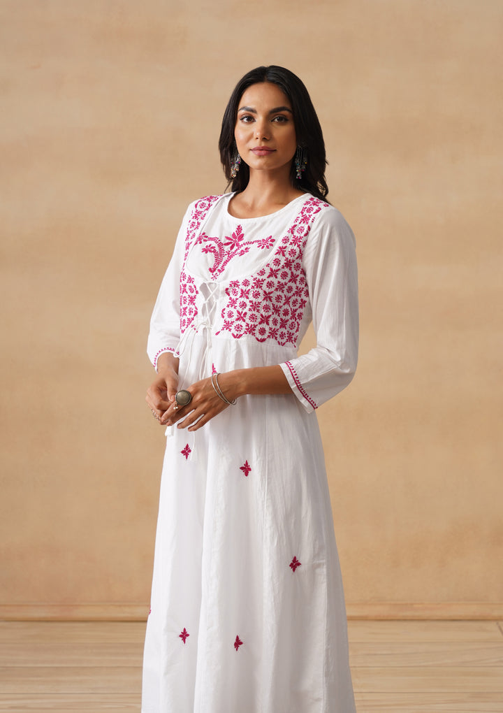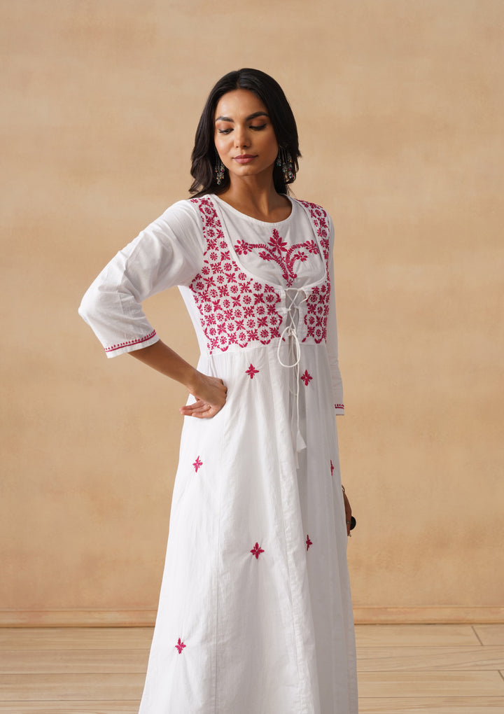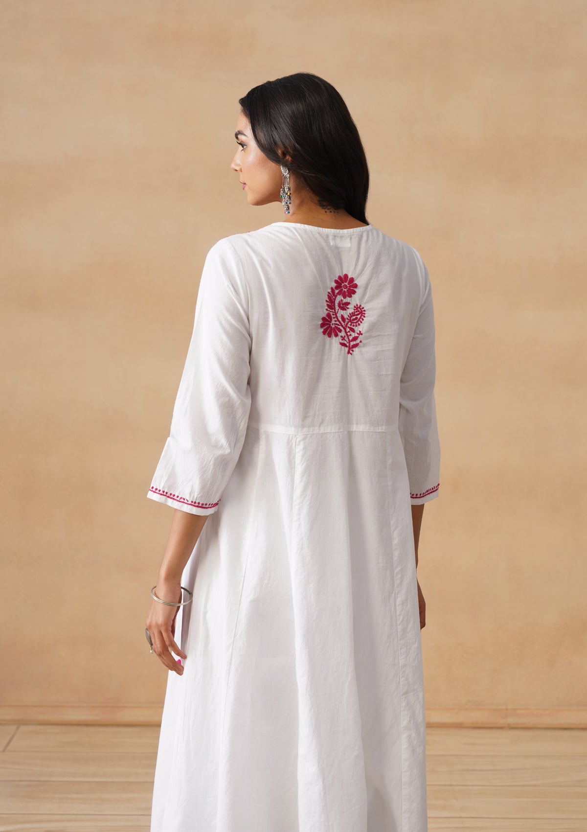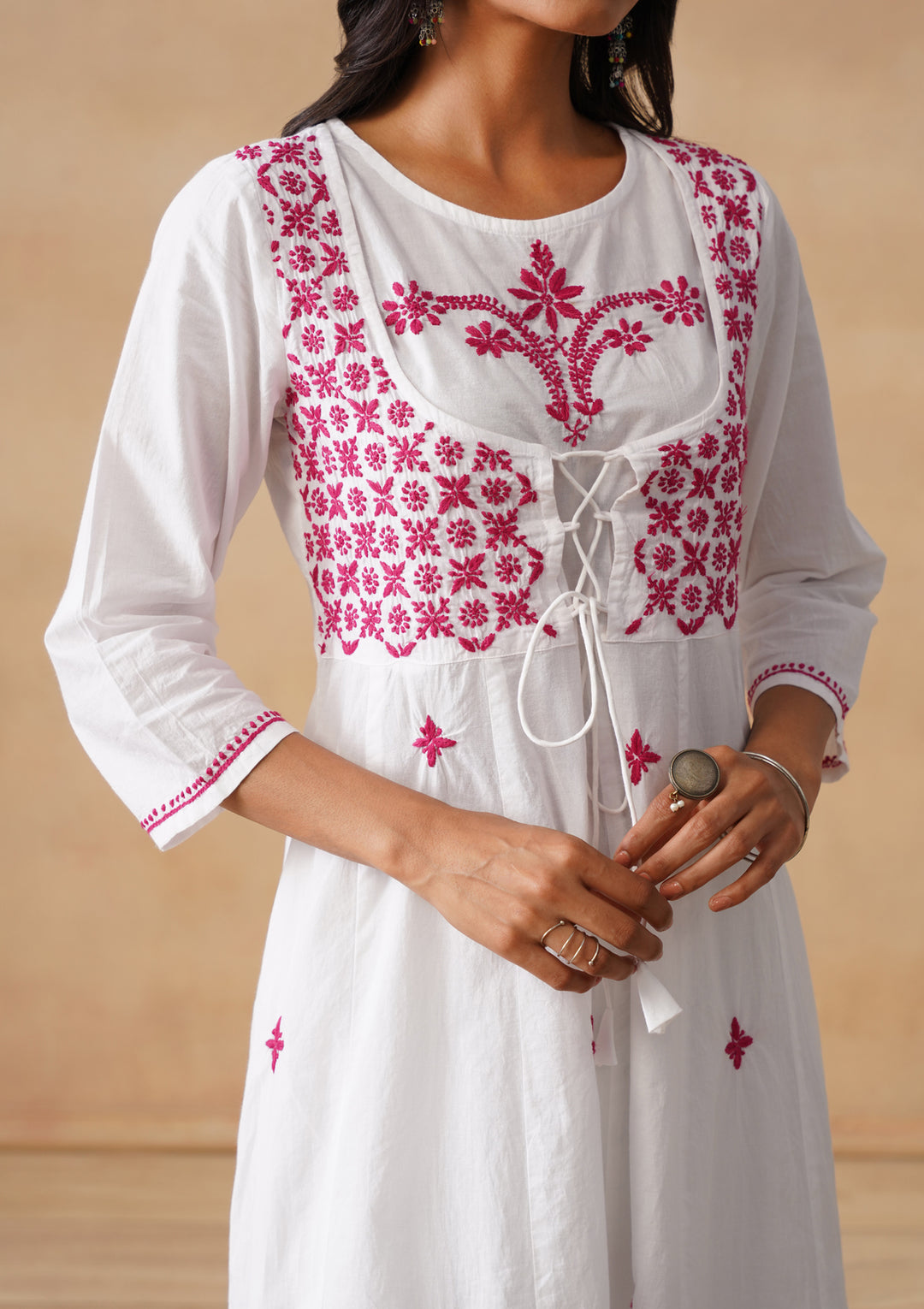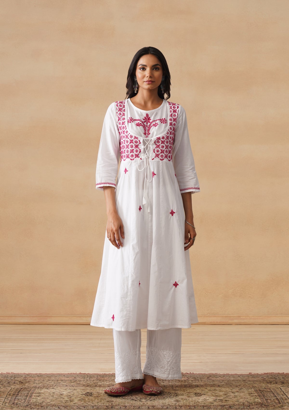 HOC Cotton Chikankari Mughal Solid Flared Women's Long Kurta - White