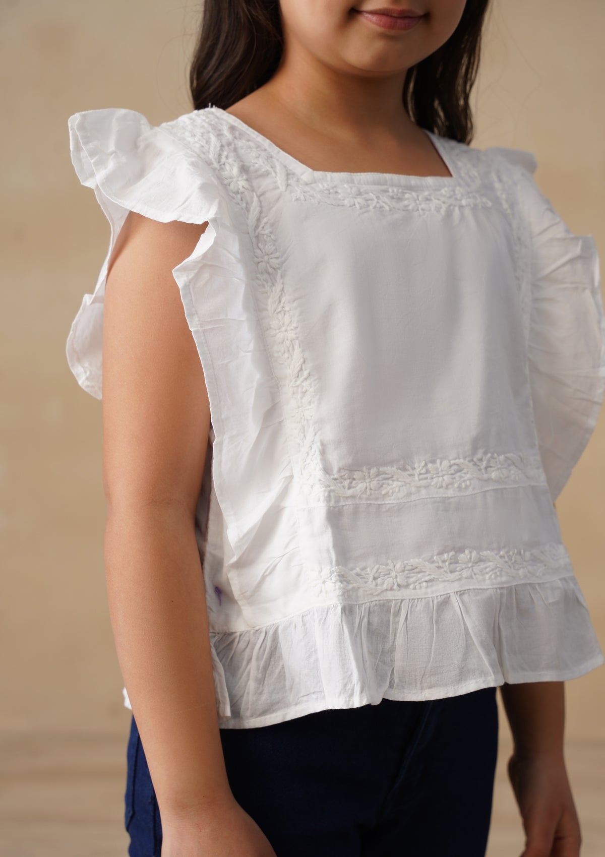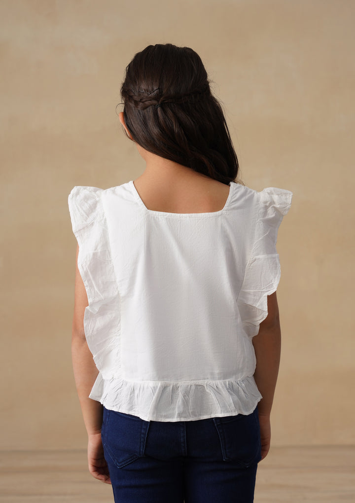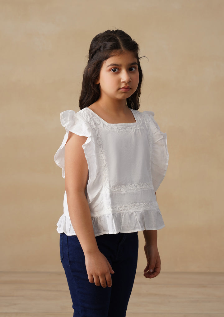 HOC Cotton Chikankari Solid Girls Short Top - White