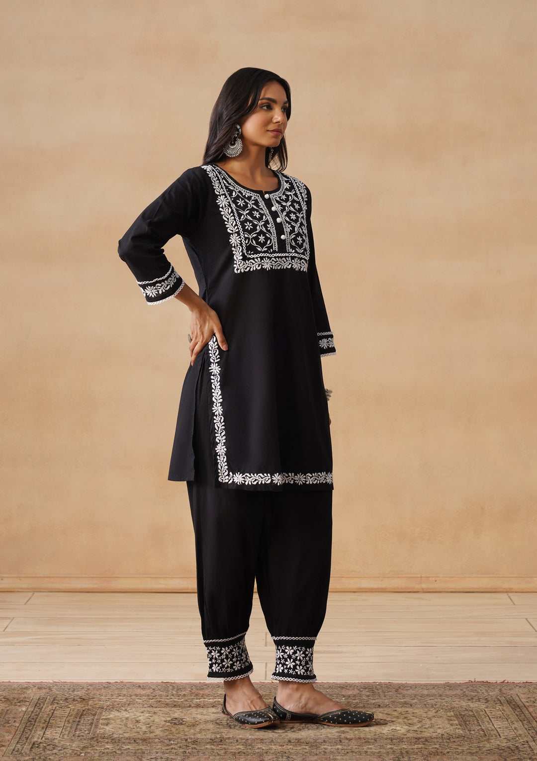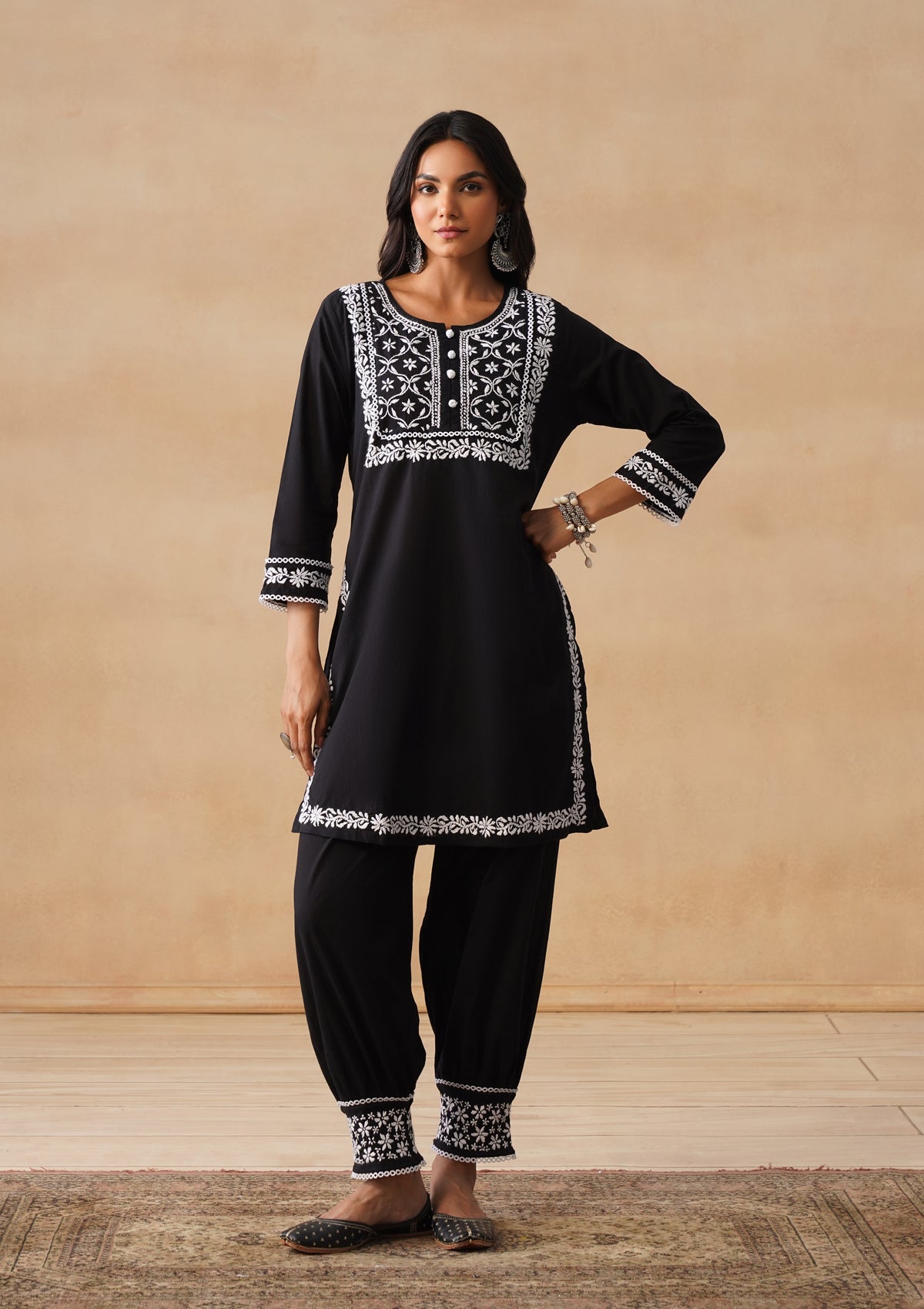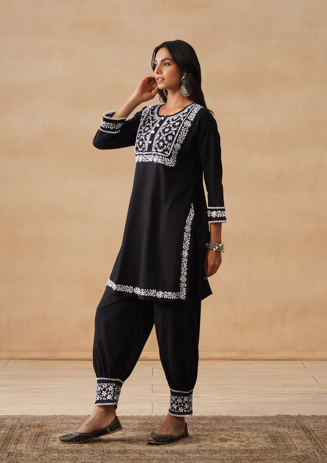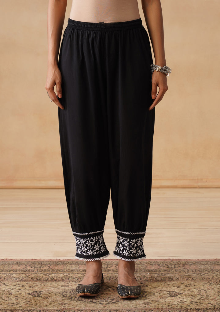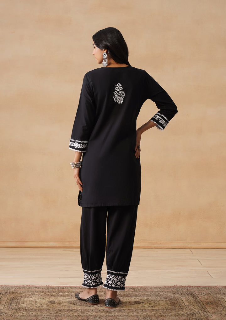 HOC Cotton Chikankari Solid Straight Women's Long Kurta Set With Afgani Pant -Black