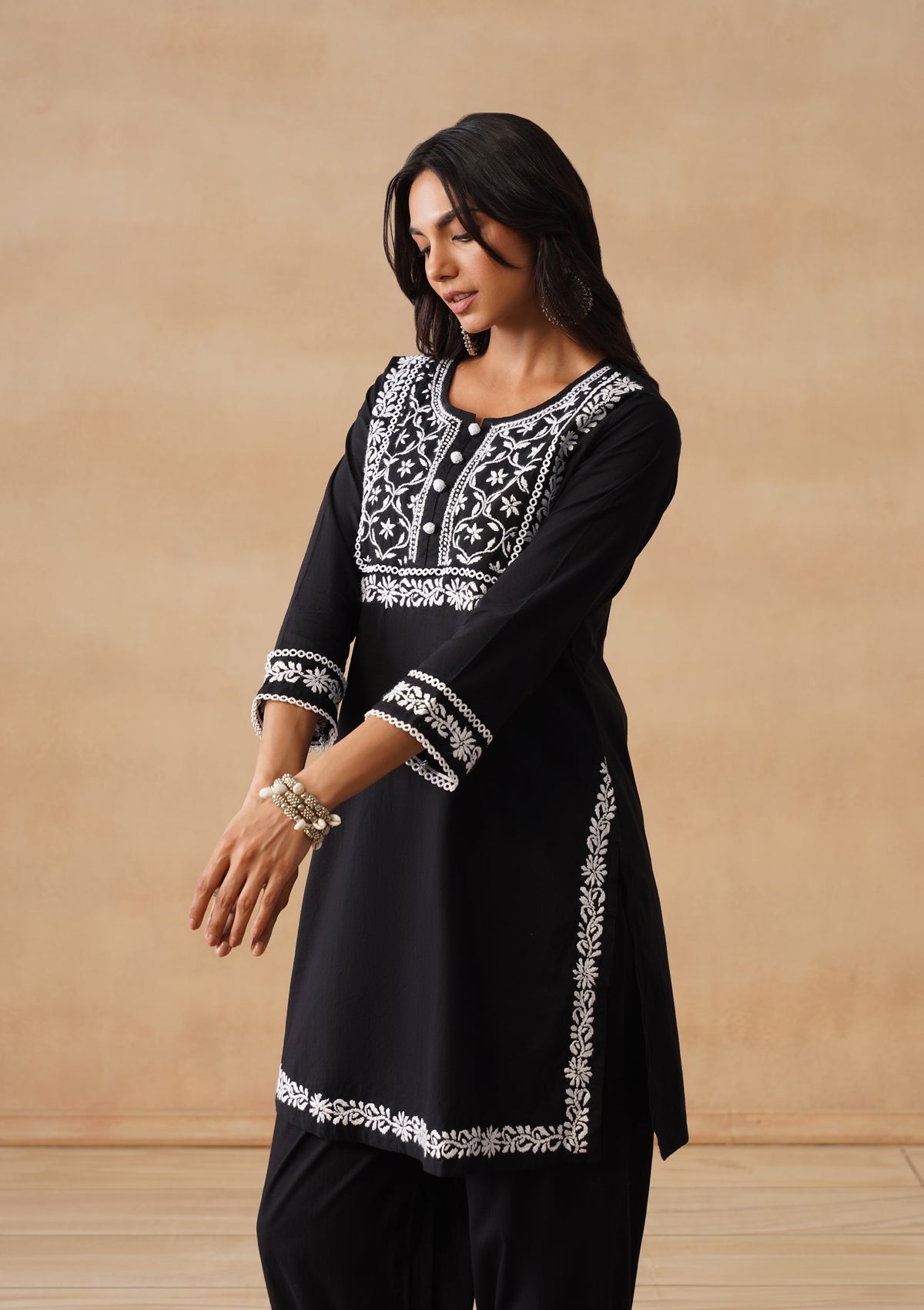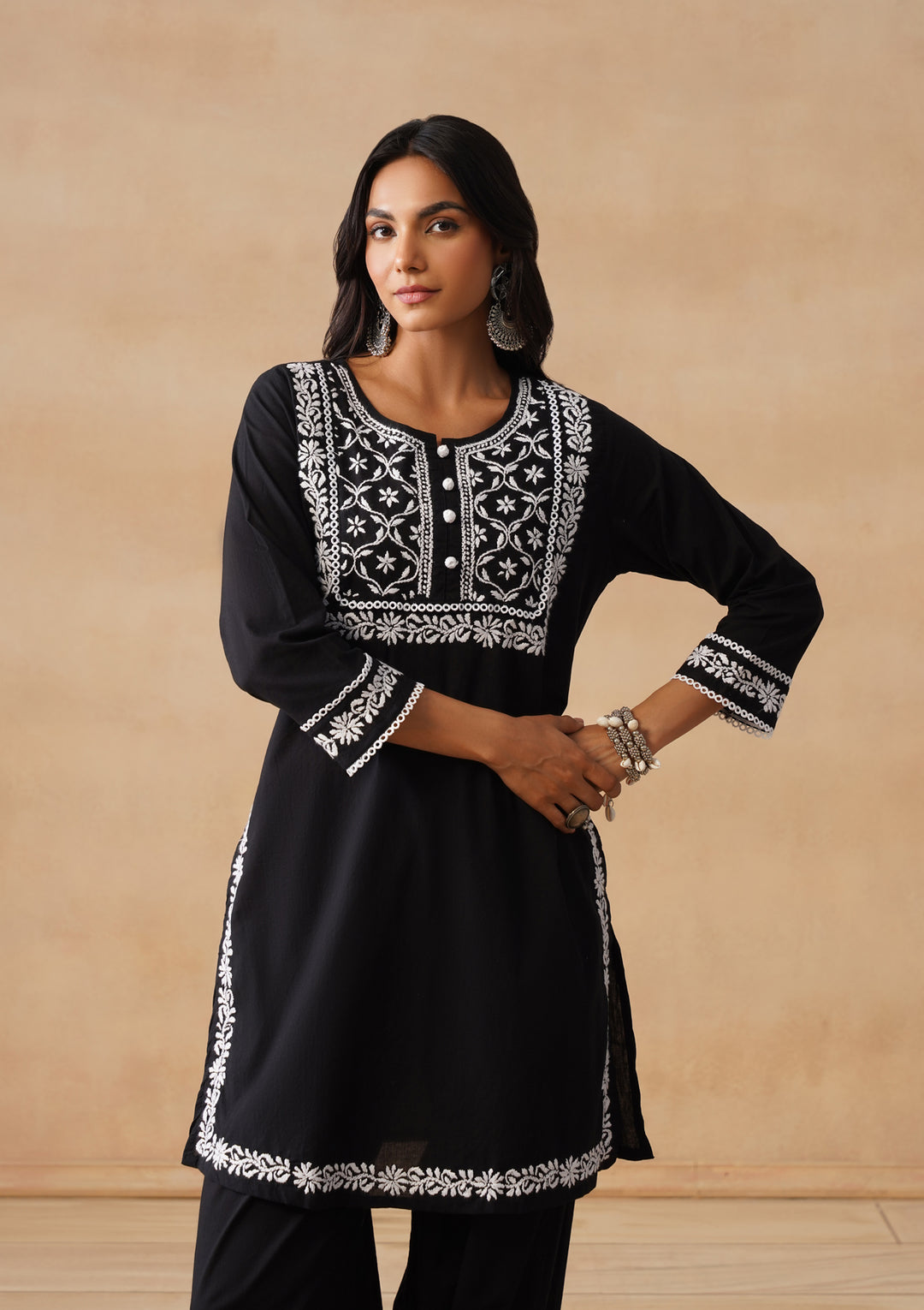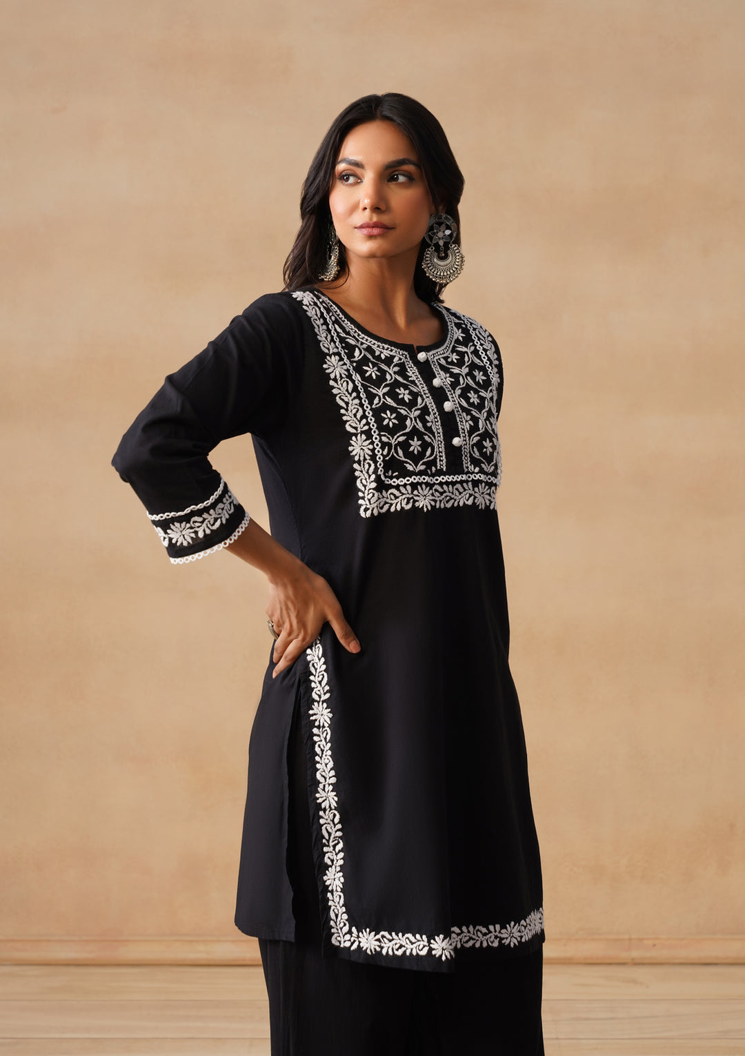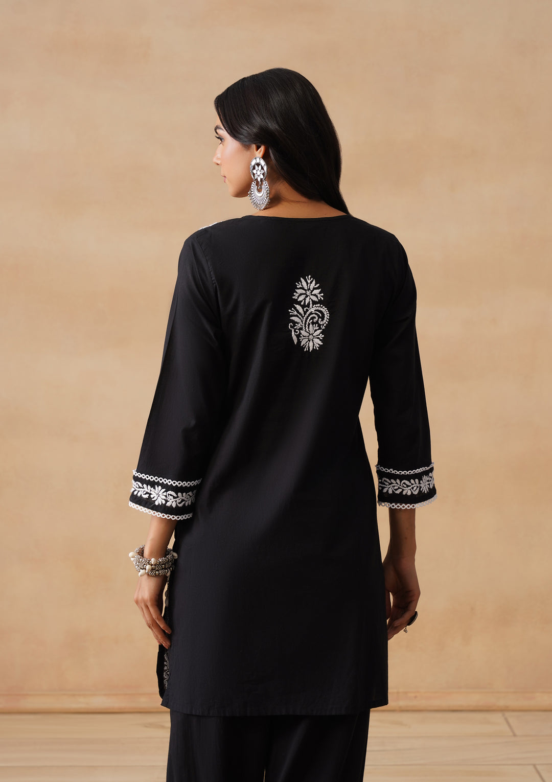 HOC Cotton Chikankari Solid Straight Women's Long Kurta Set With Afgani Pant -Black