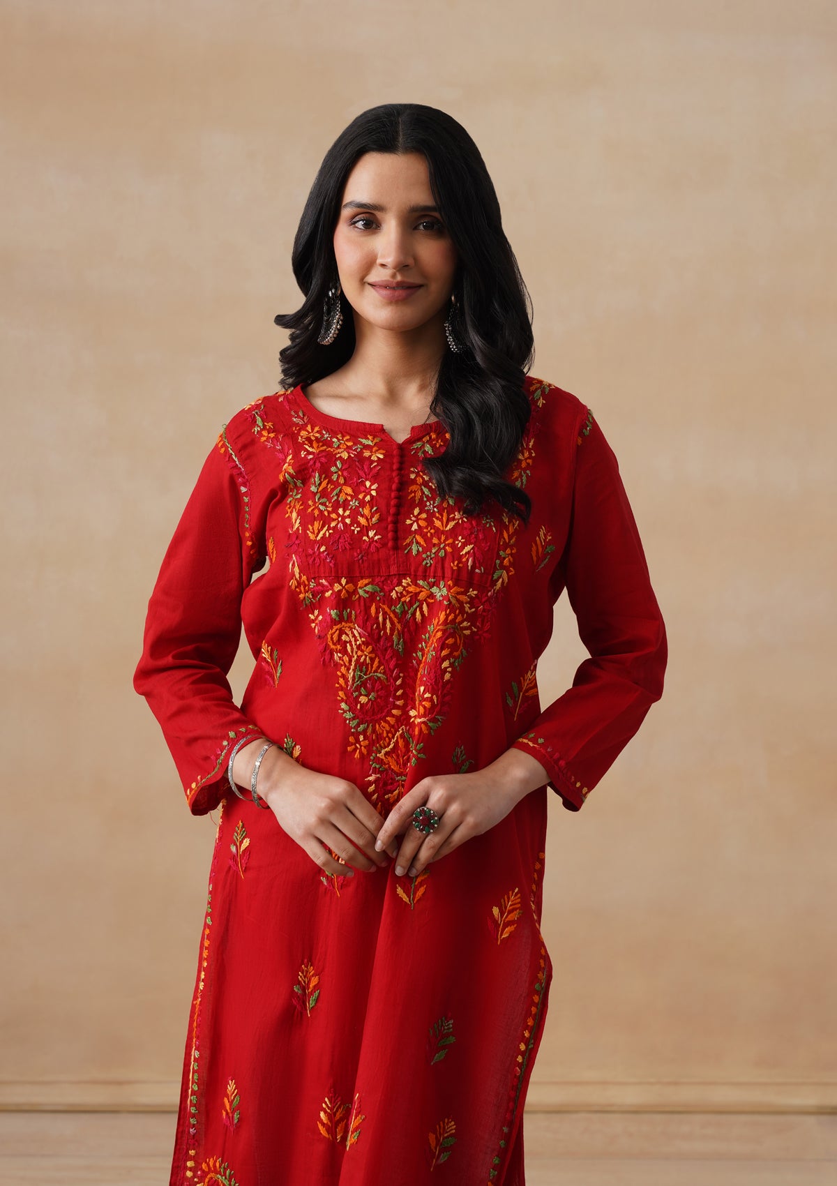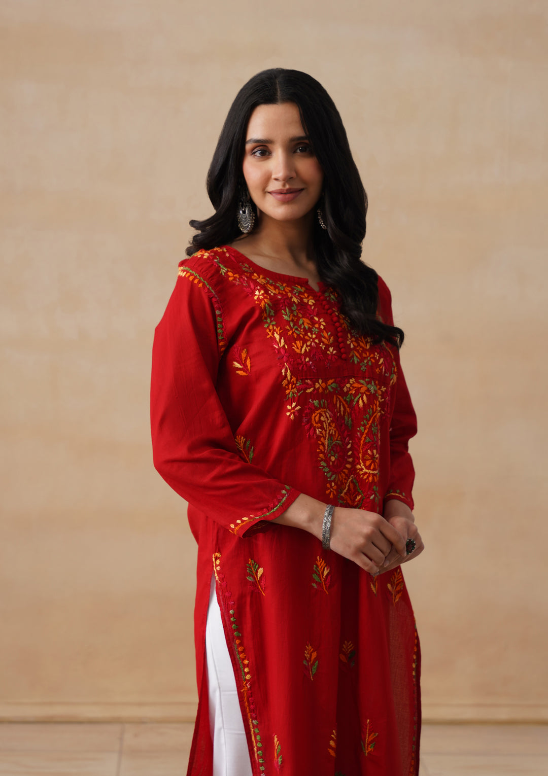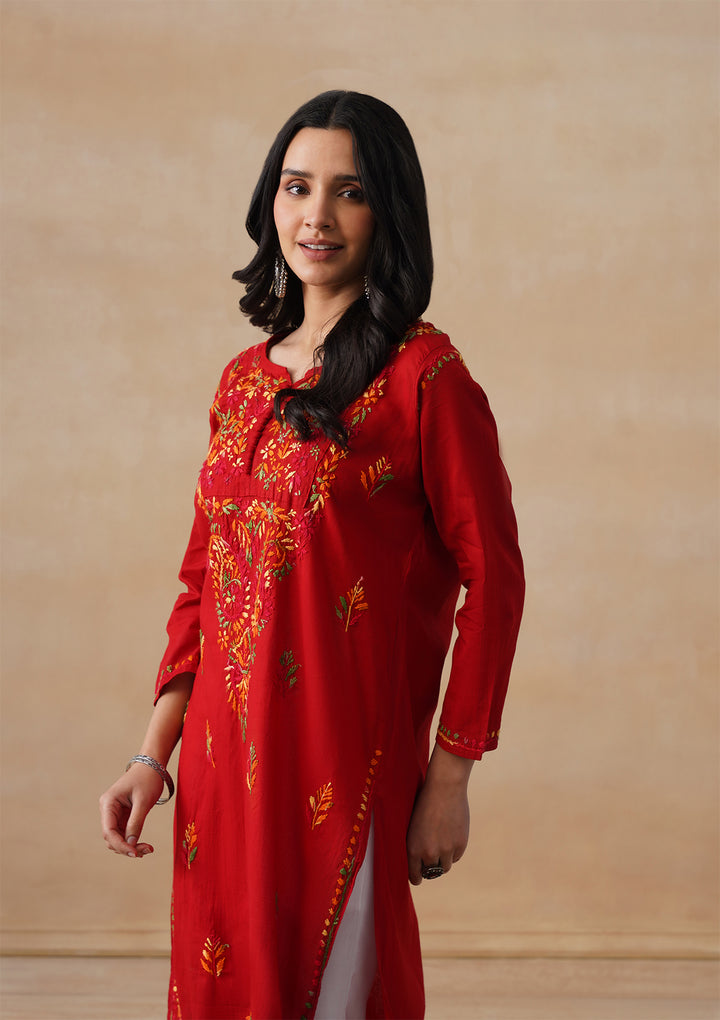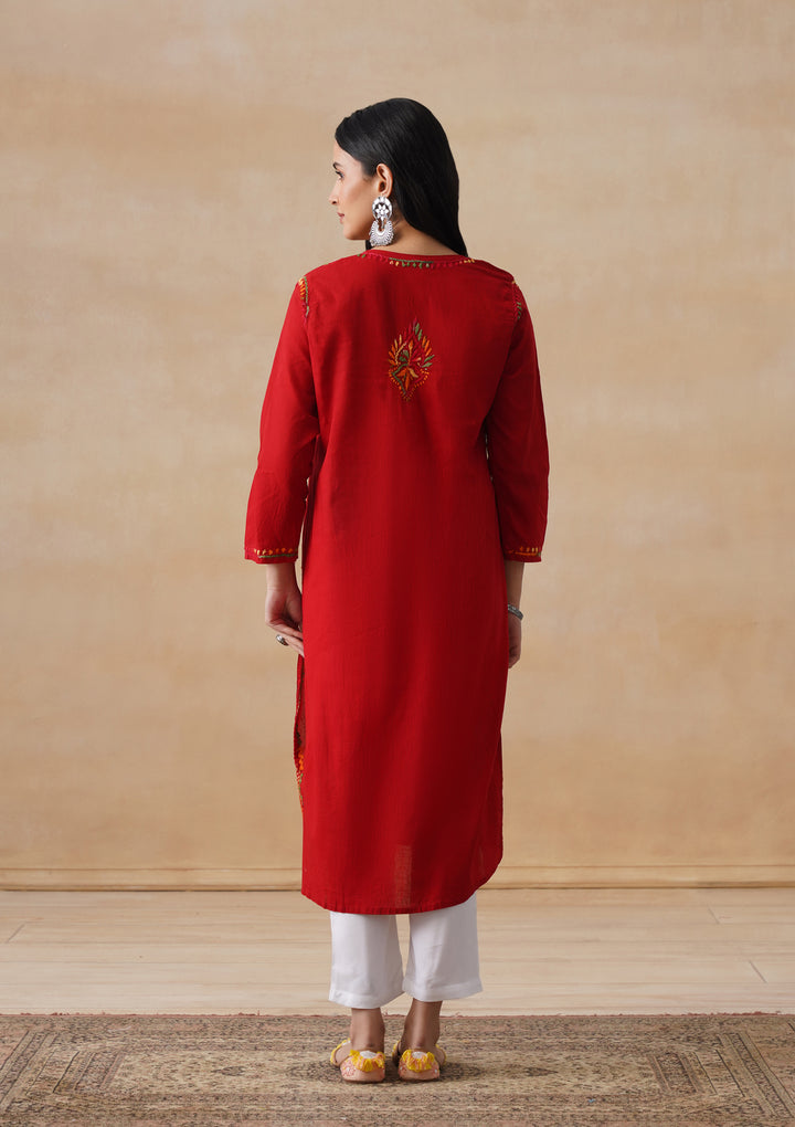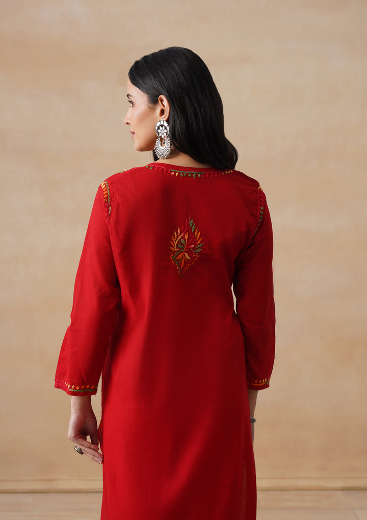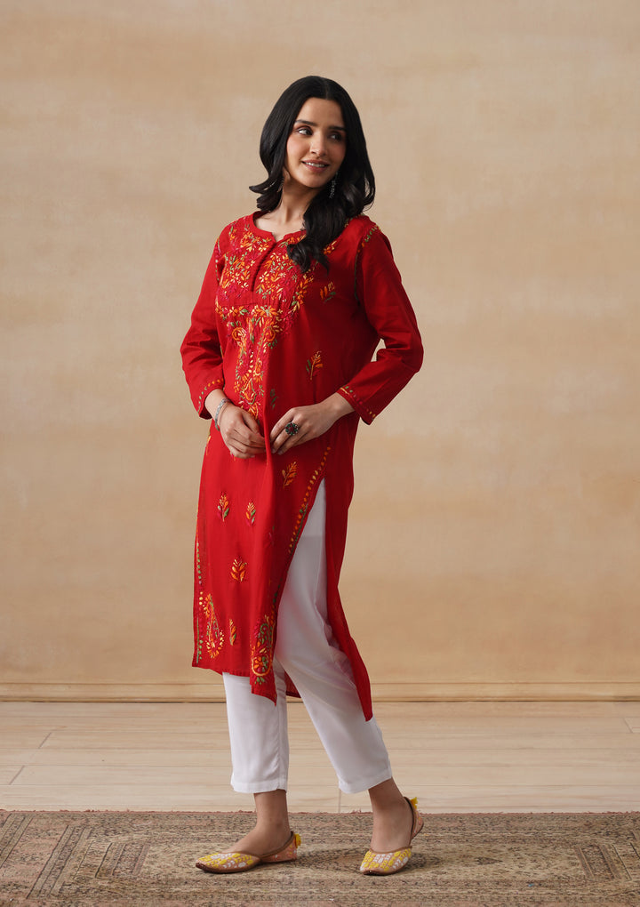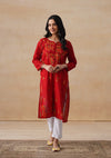 HOC Cotton Chikankari Solid Women's Long Kurta - Red