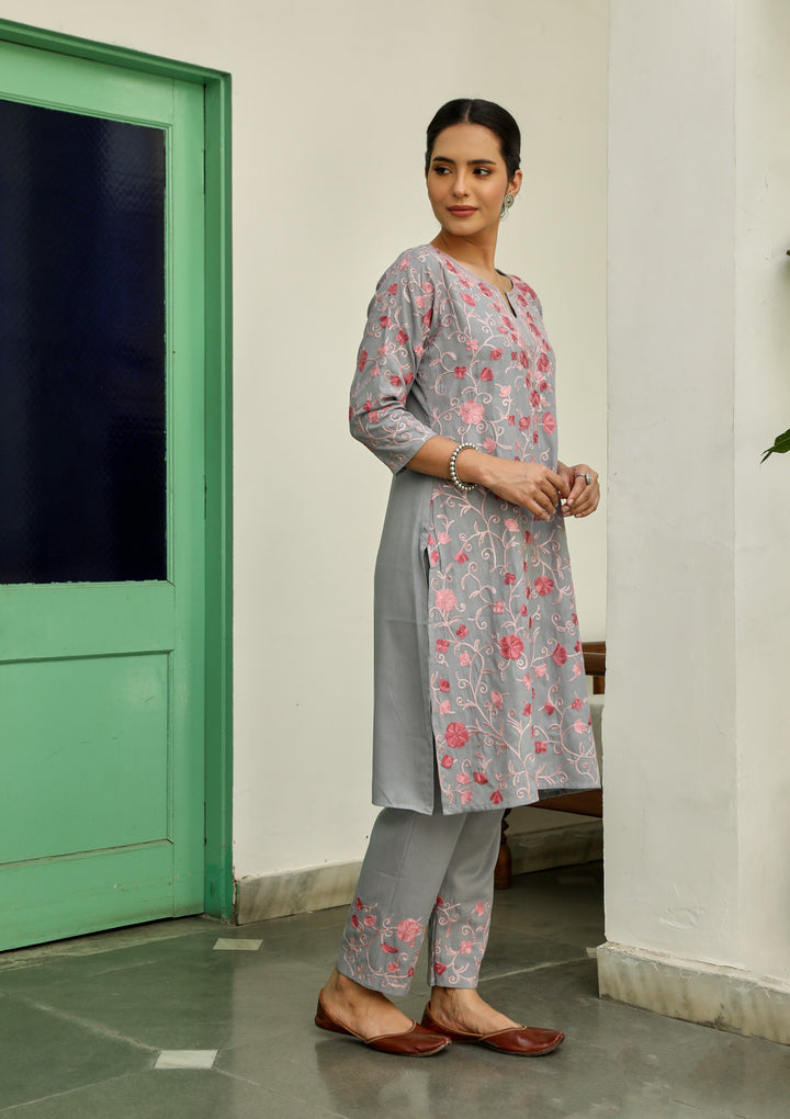 HOC Aari Embroidered Cotton Solid Women's Long Kurta - Purple