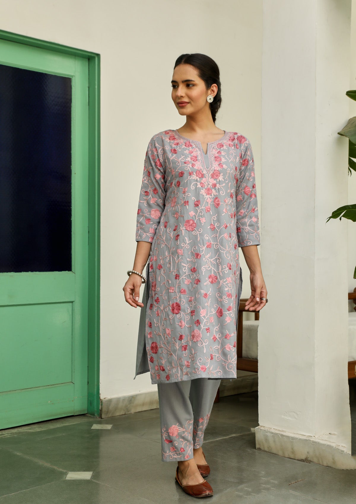 Cotton Chikankari Solid Women's Long Kurta - Pink