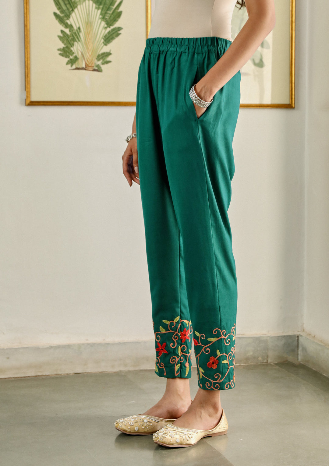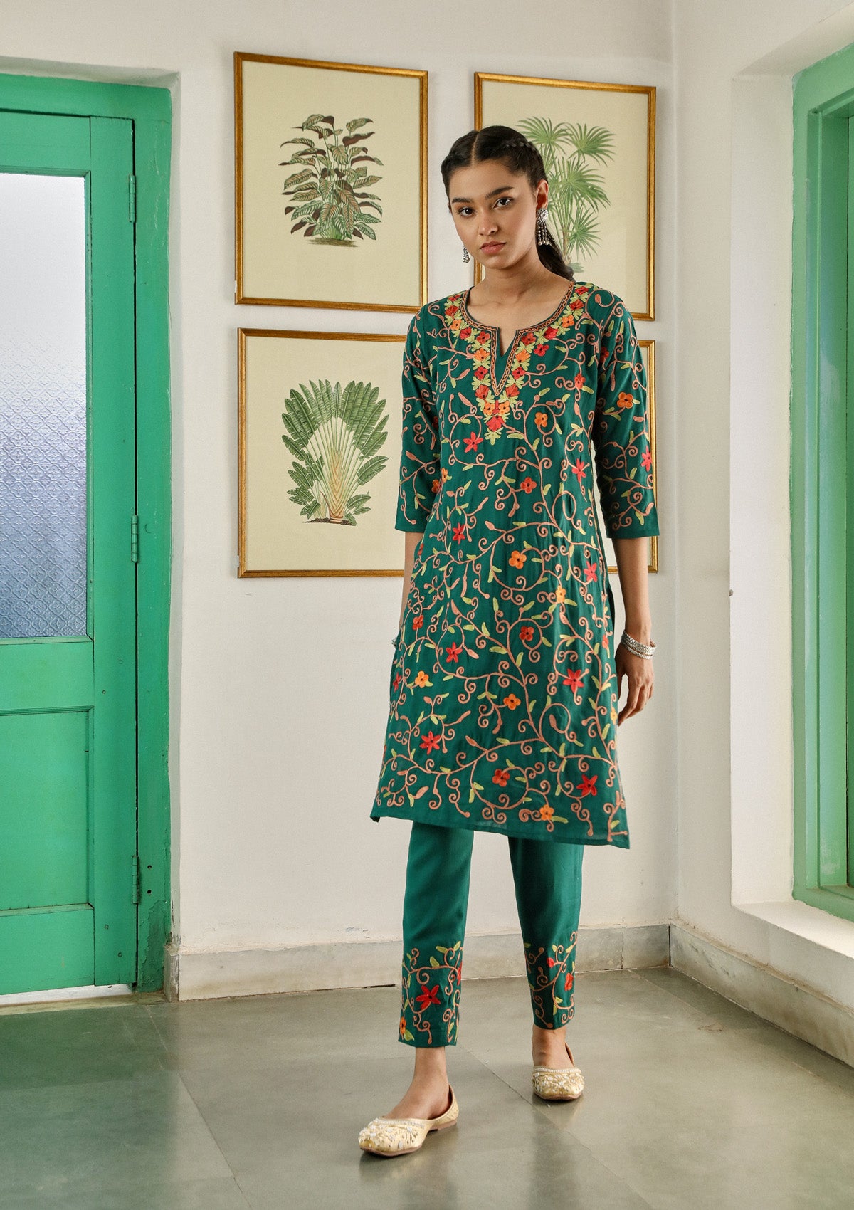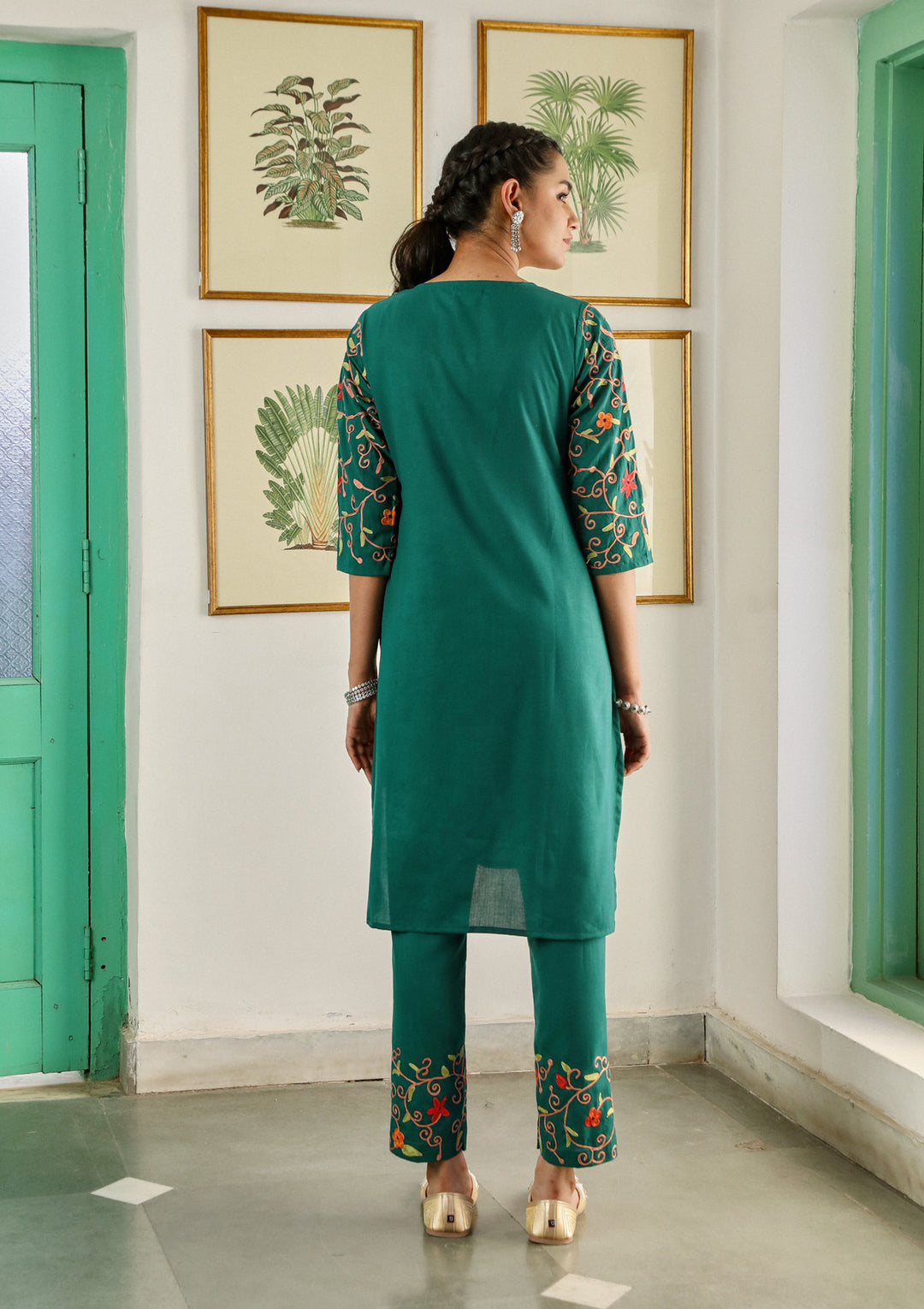 HOC Aari Embroidered Cotton Solid Women's 2PC Long Kurta Set - Teal Green
