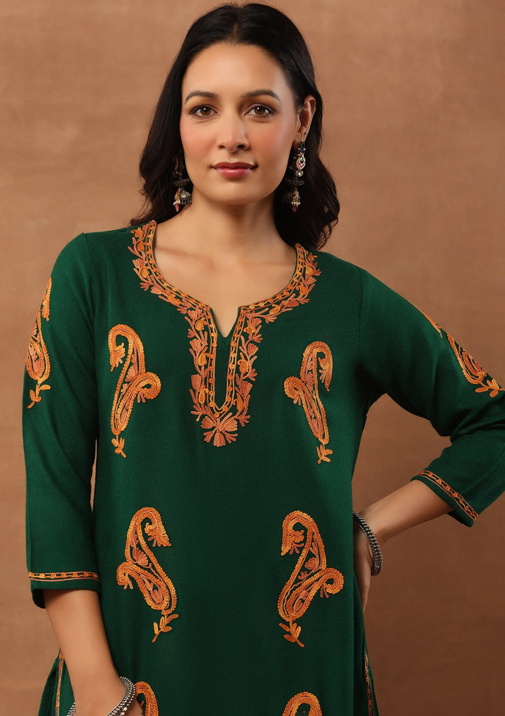 HOC Aari Embroidered Woollen Solid Women's Long Kurta - Green