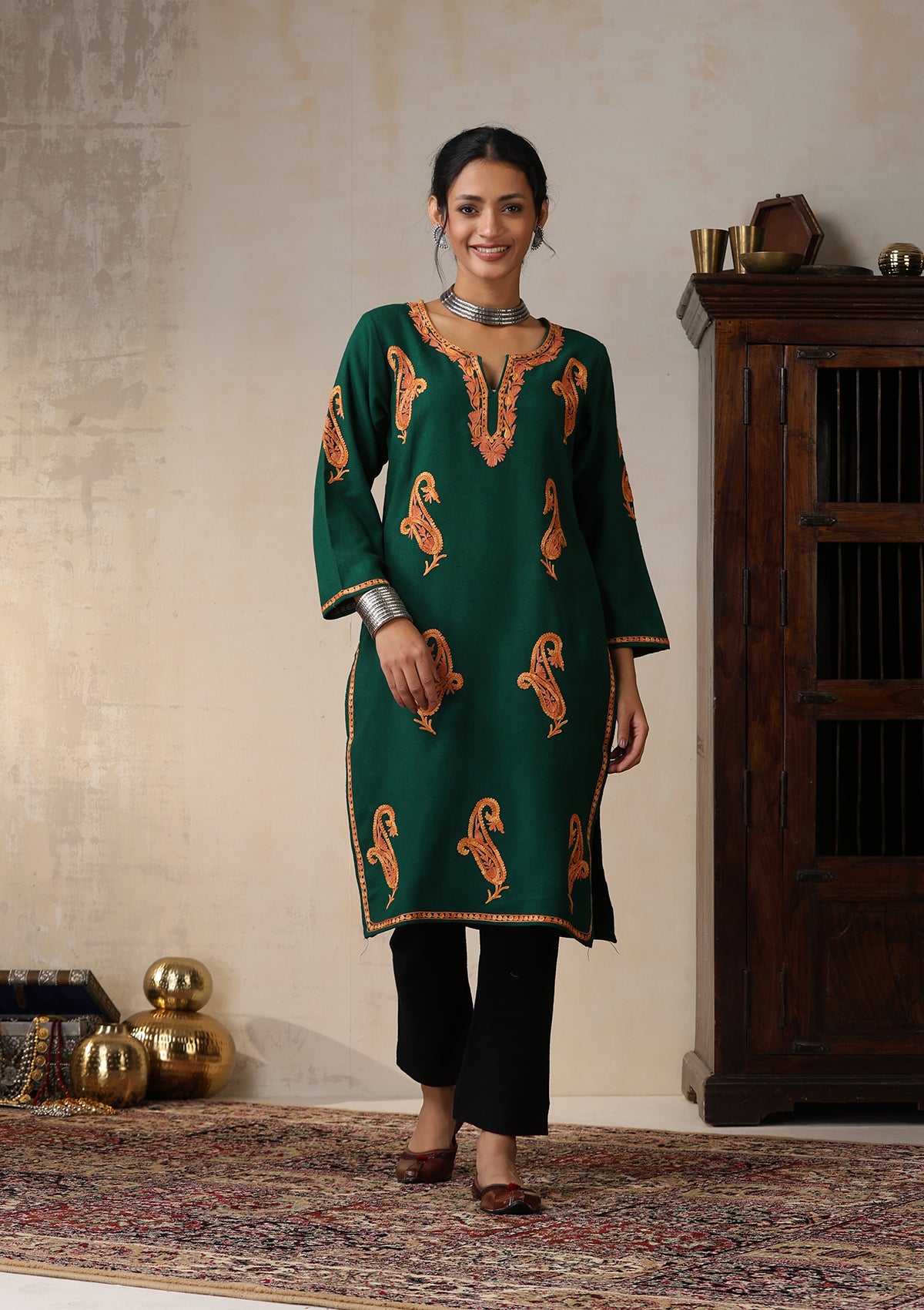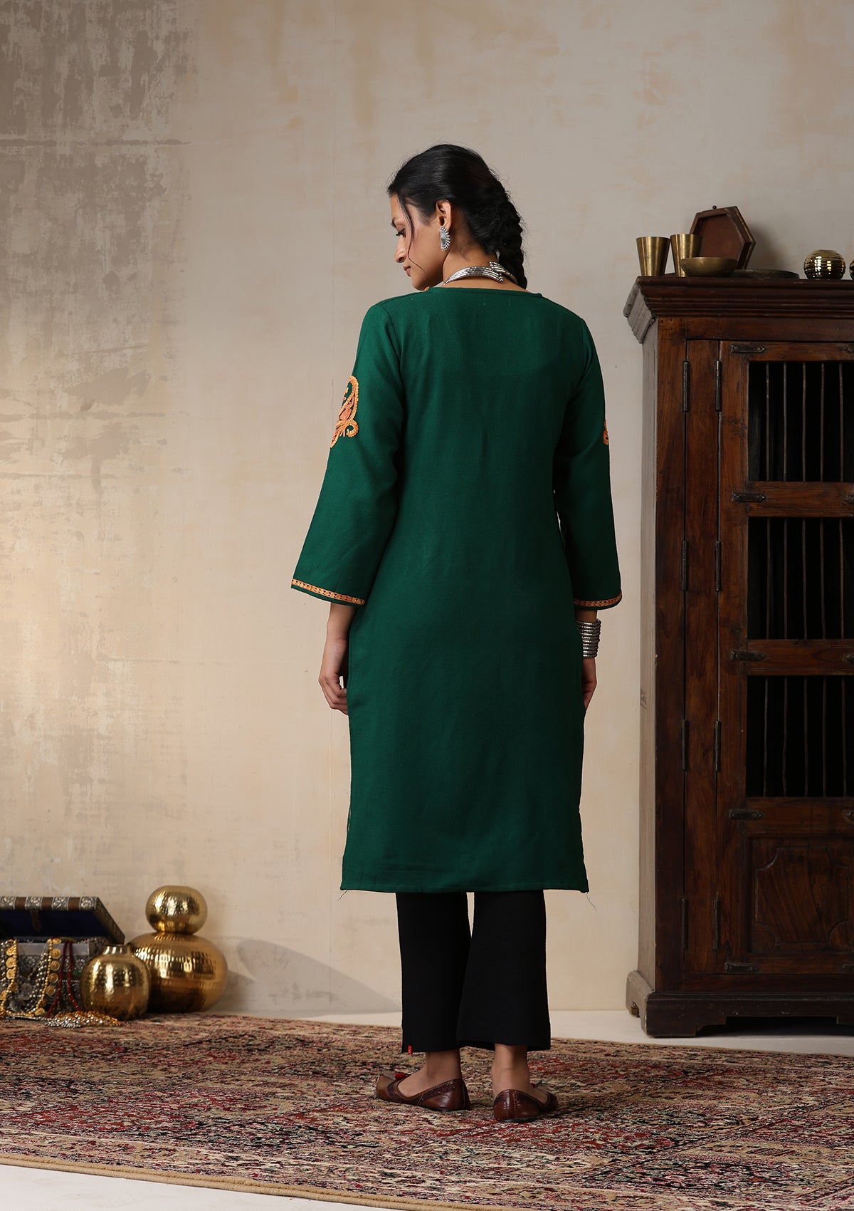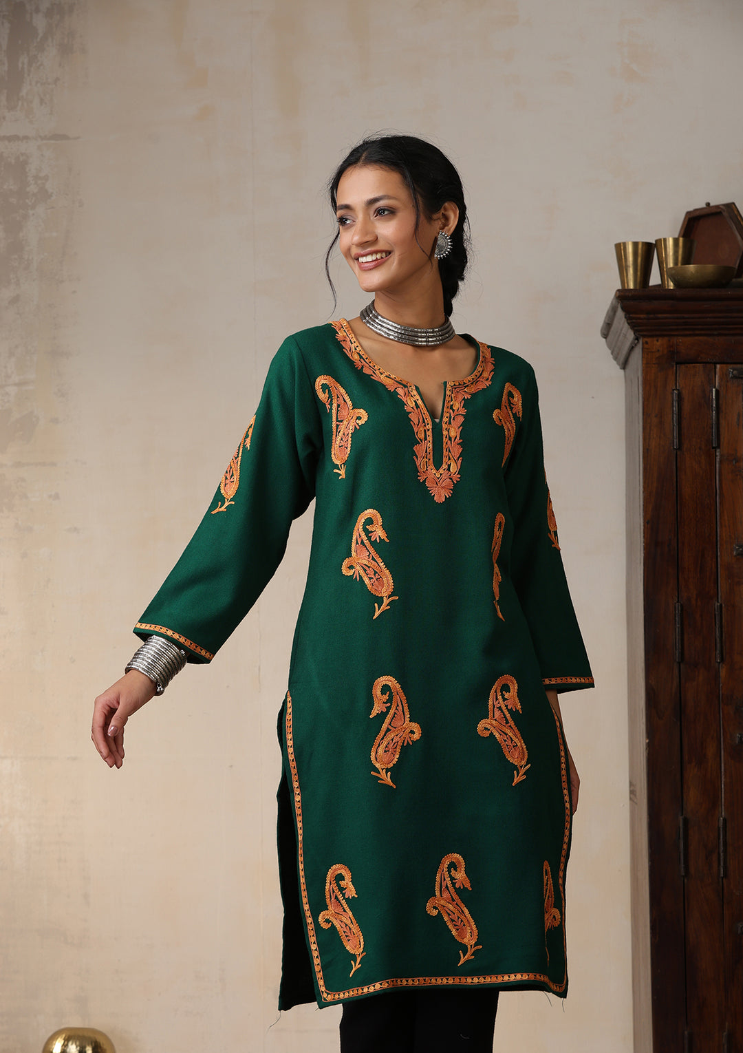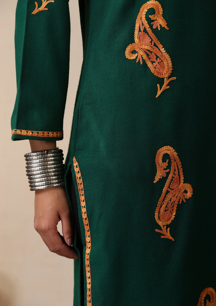 HOC Kashmiri Wool Aari Embroidered Solid Women's Long Kurta - Green