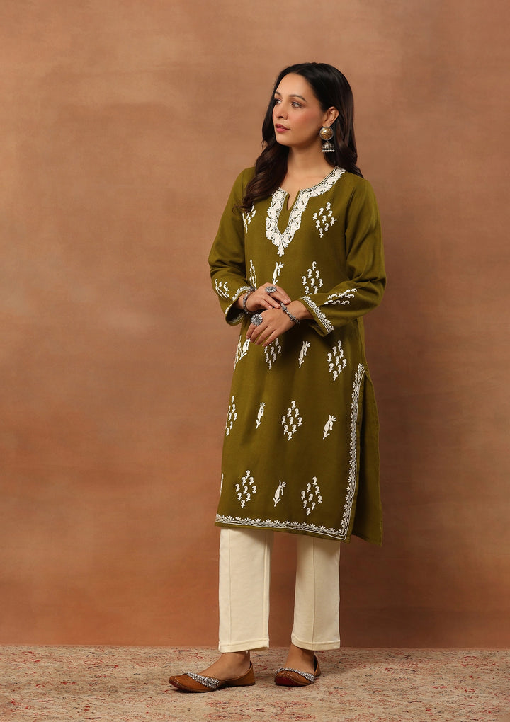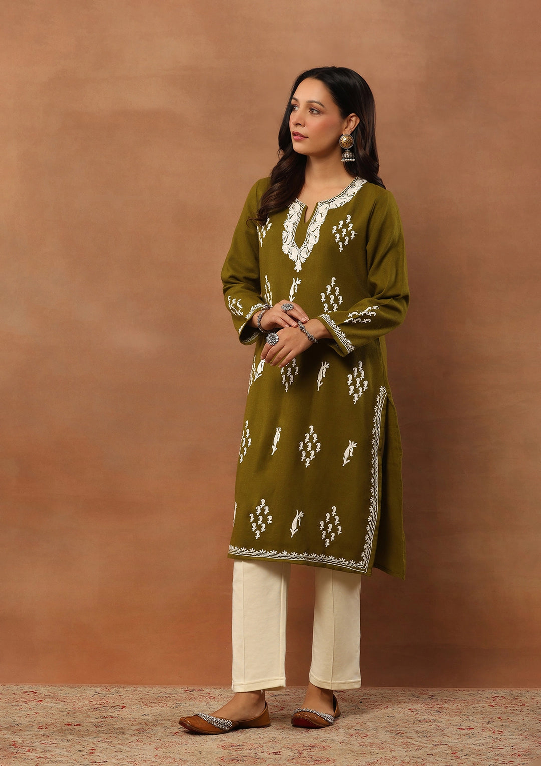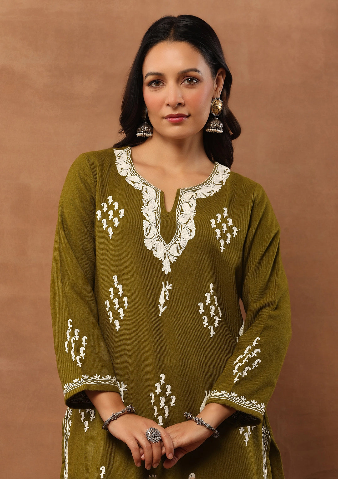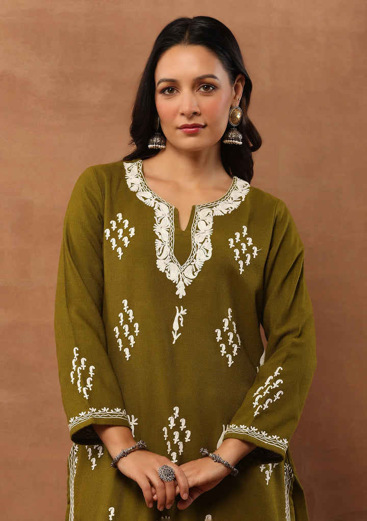 HOC Aari Embroidered Woollen Solid Women's Long Kurta - Olive Green
