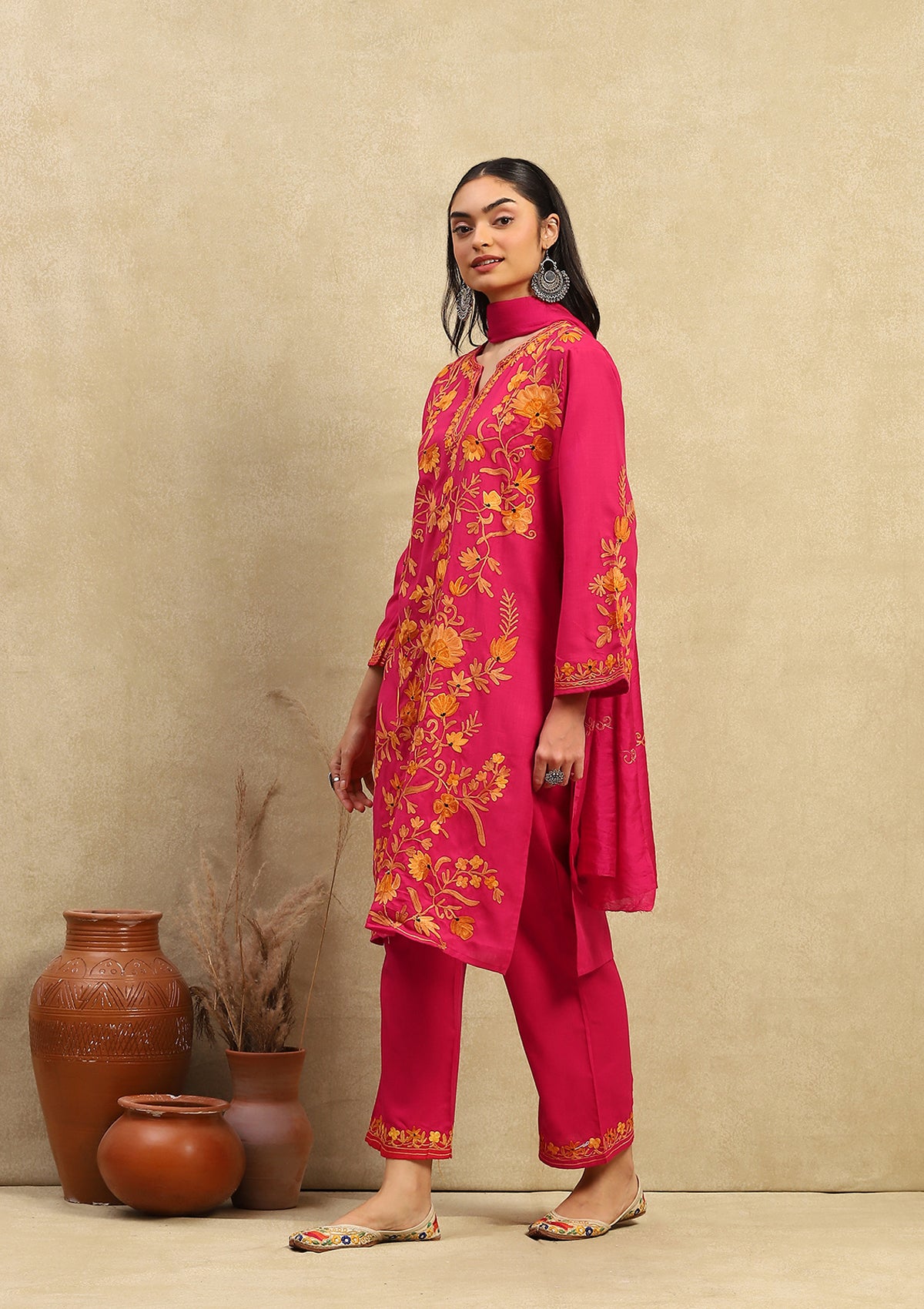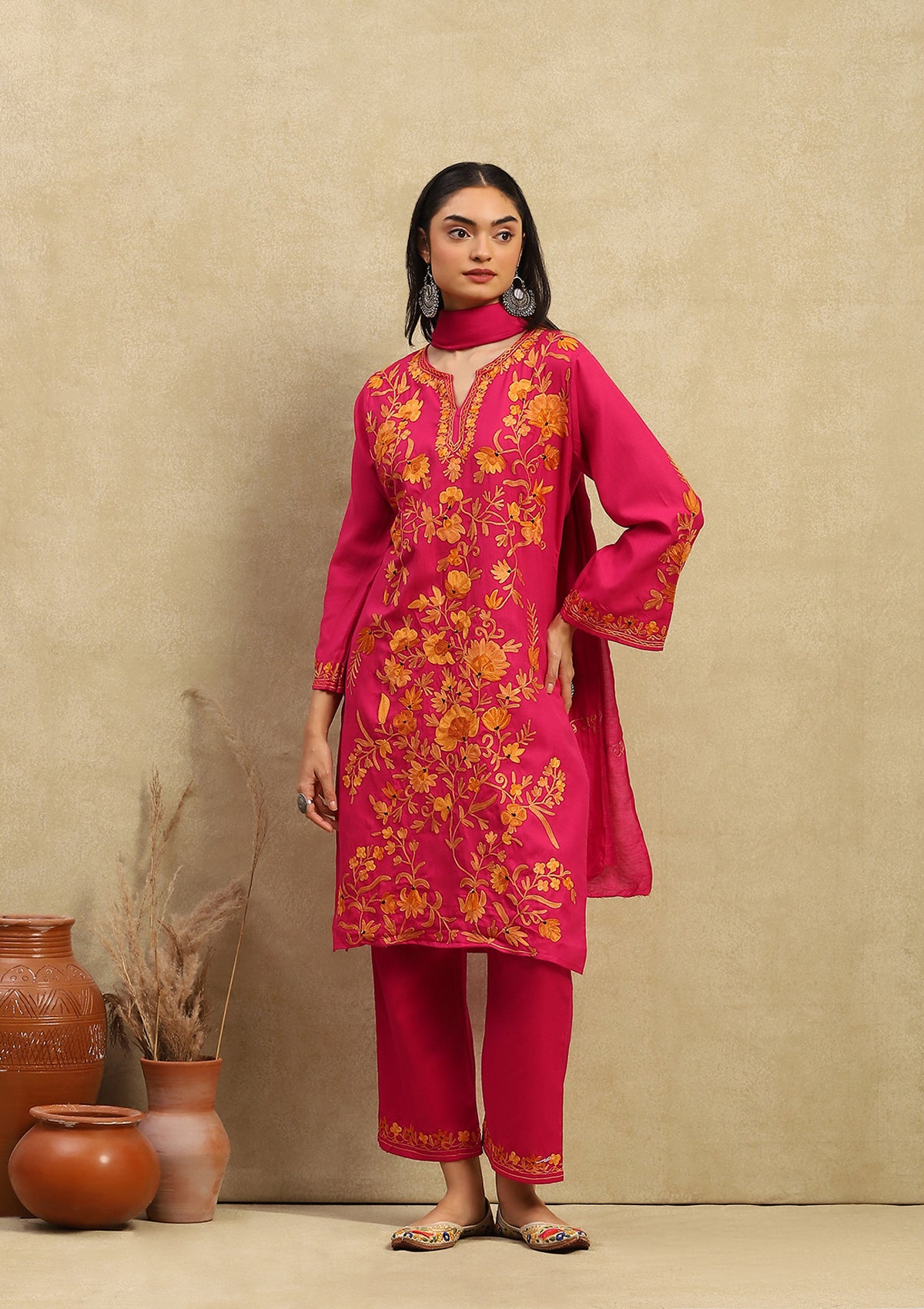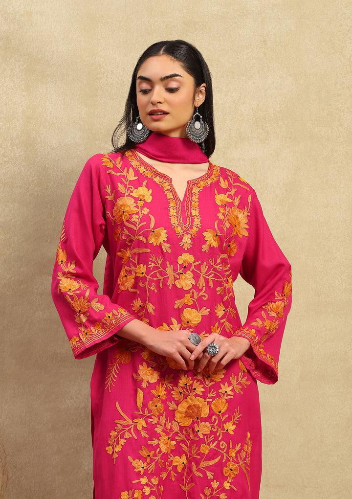 HOC Crafts Cotton Aari Embroidered Solid Women's 3 PC Long Kurta Set with Dupatta - Pink