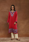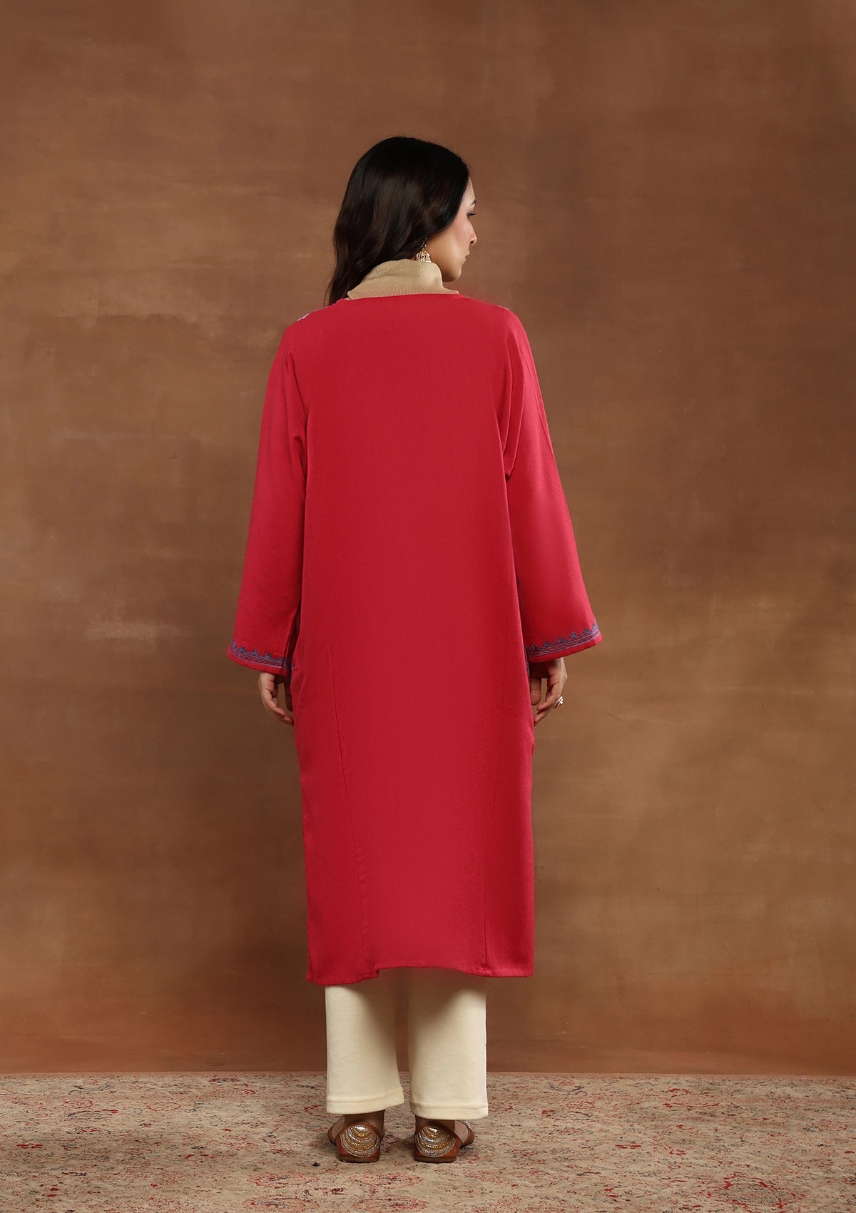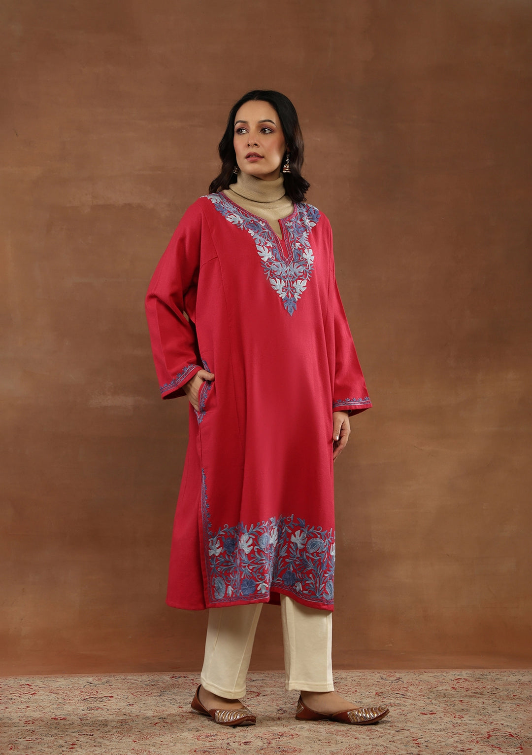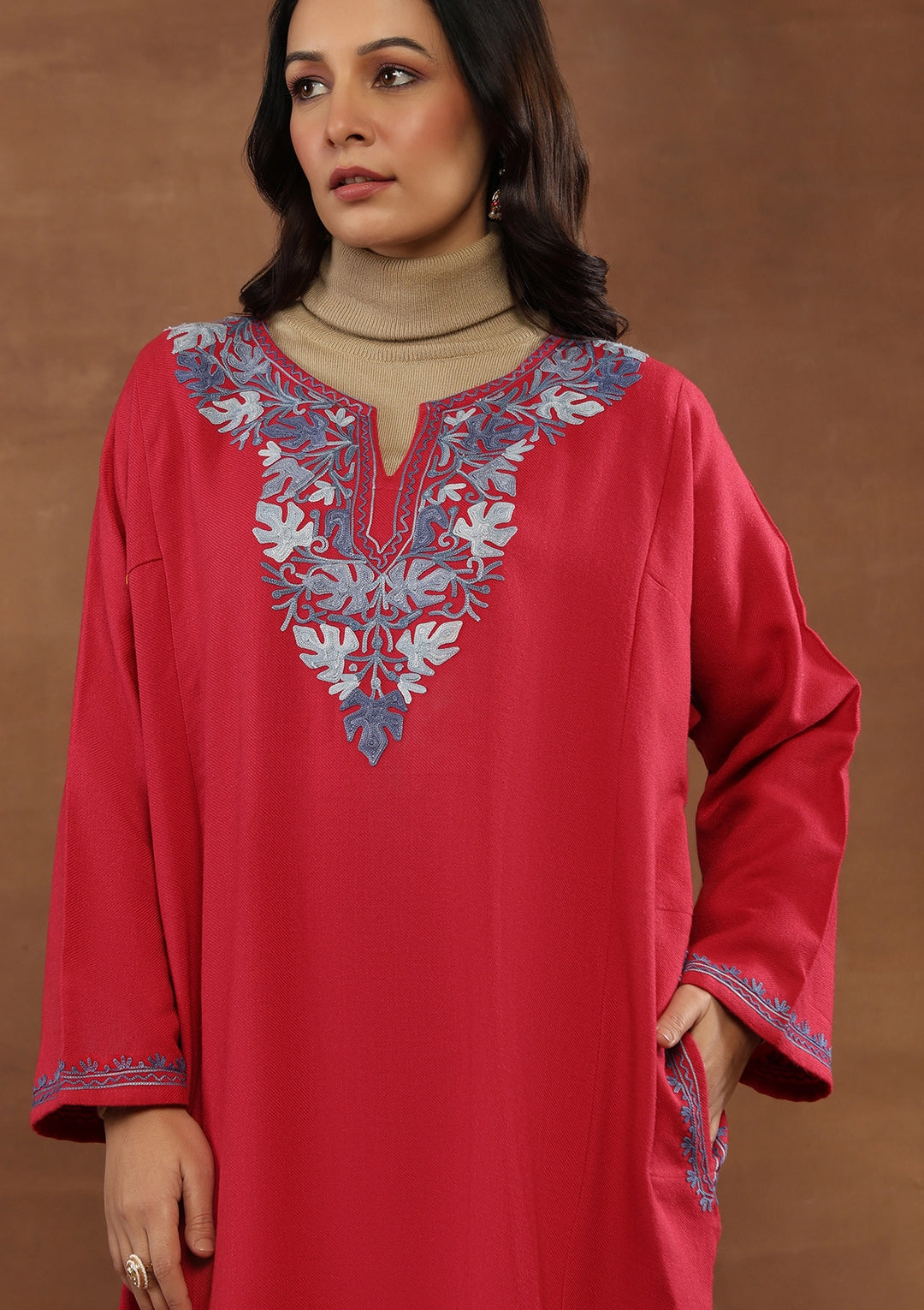 HOC Kashmiri Wool Aari Embroidered Solid Women's Phiran Kurta -Dark Pink