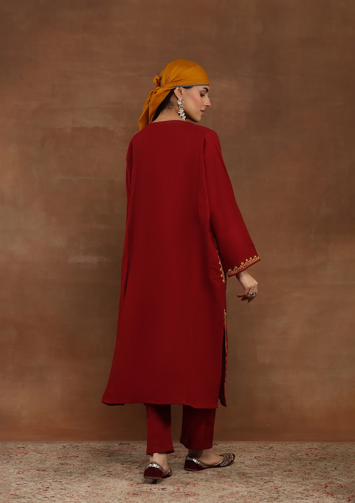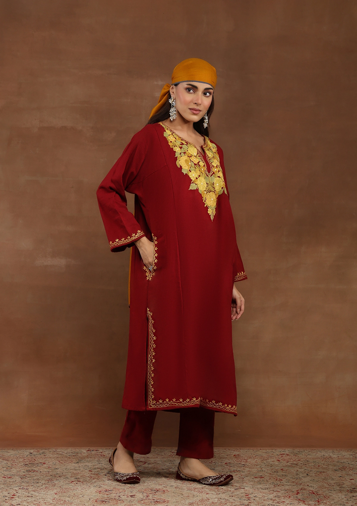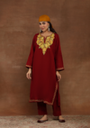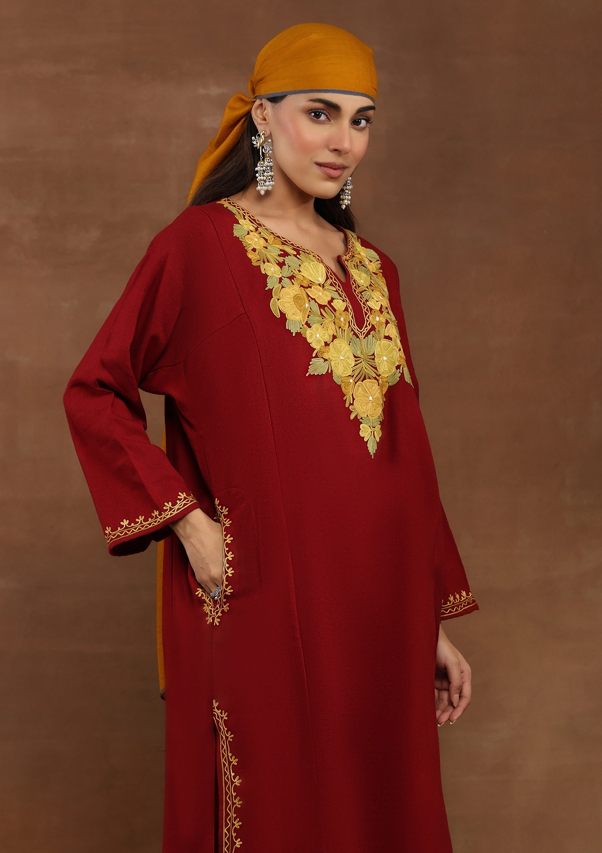 HOC Kashmiri Wool Aari Embroidered Solid Women's Phiran Kurta -Maroon