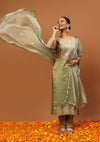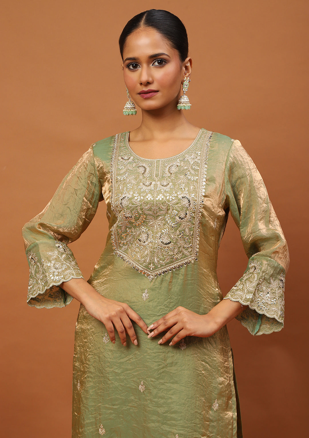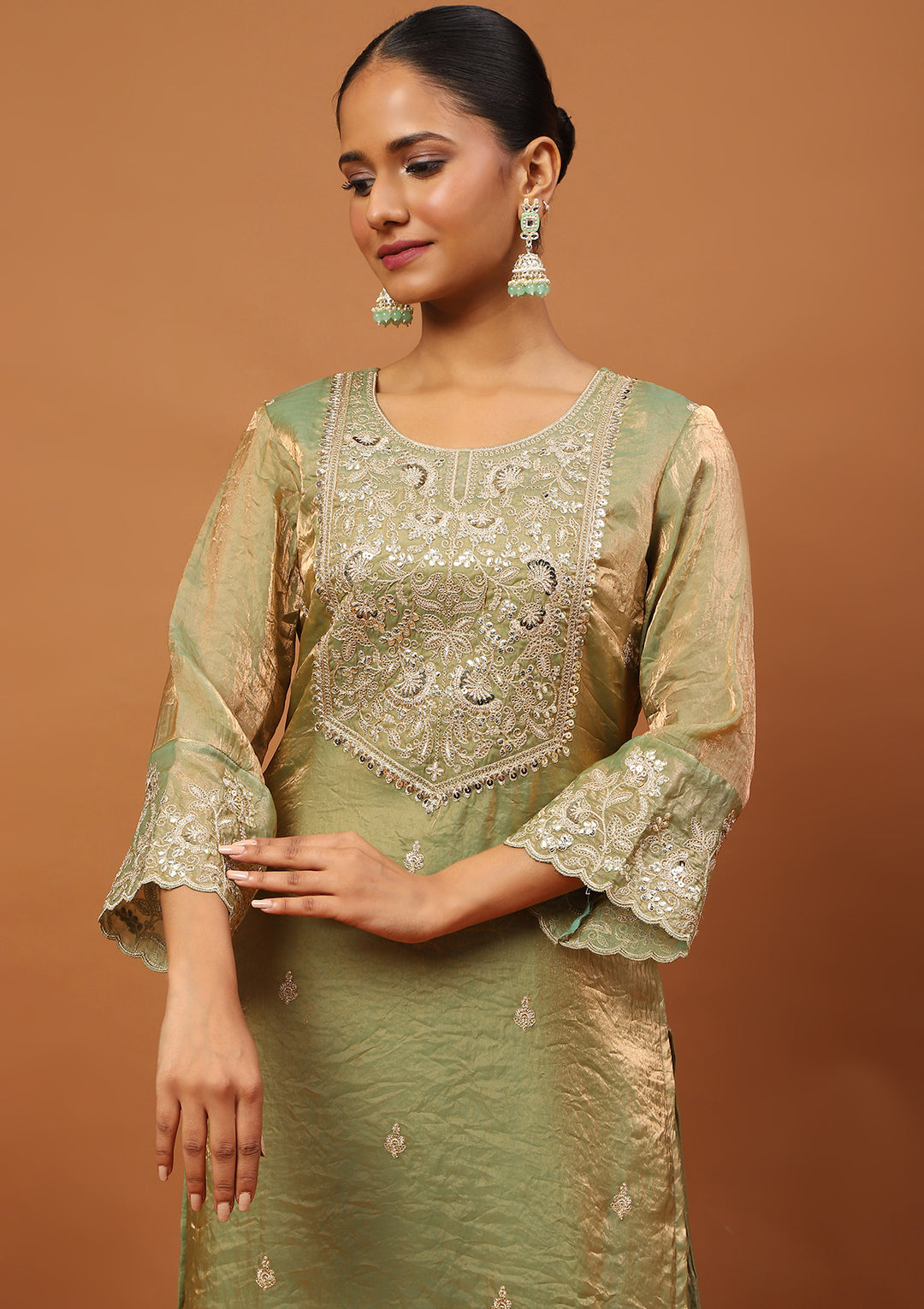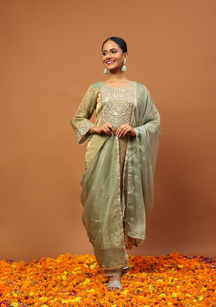 HOC Satin Tissue Silk Zardozi with Sequins Solid Women’s 3 PC Straight Kurta Set - Pista Green