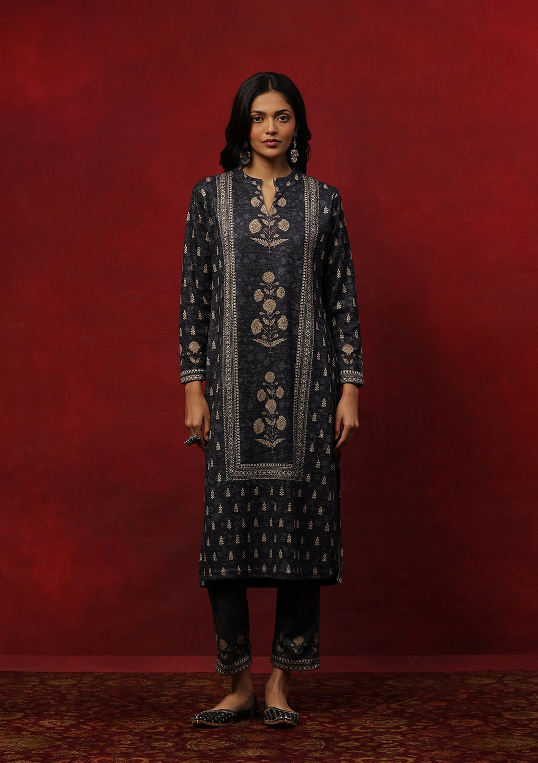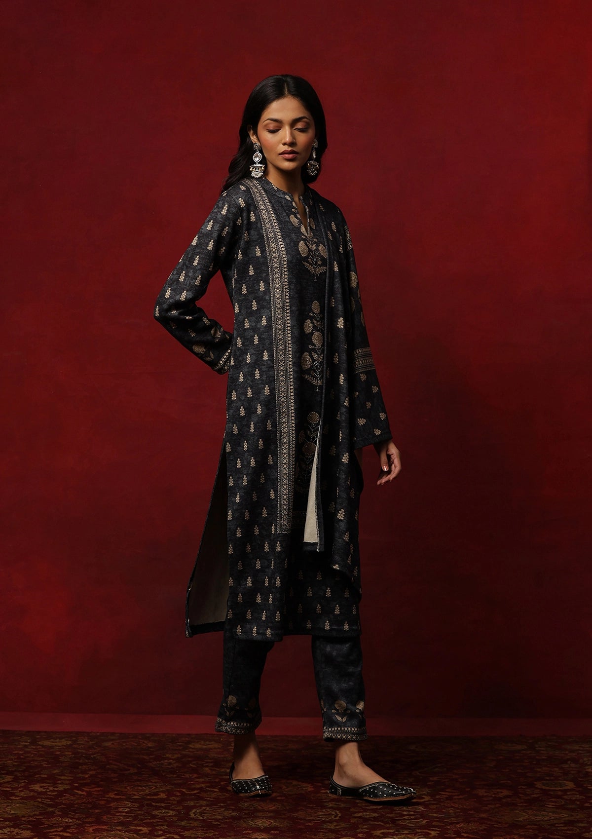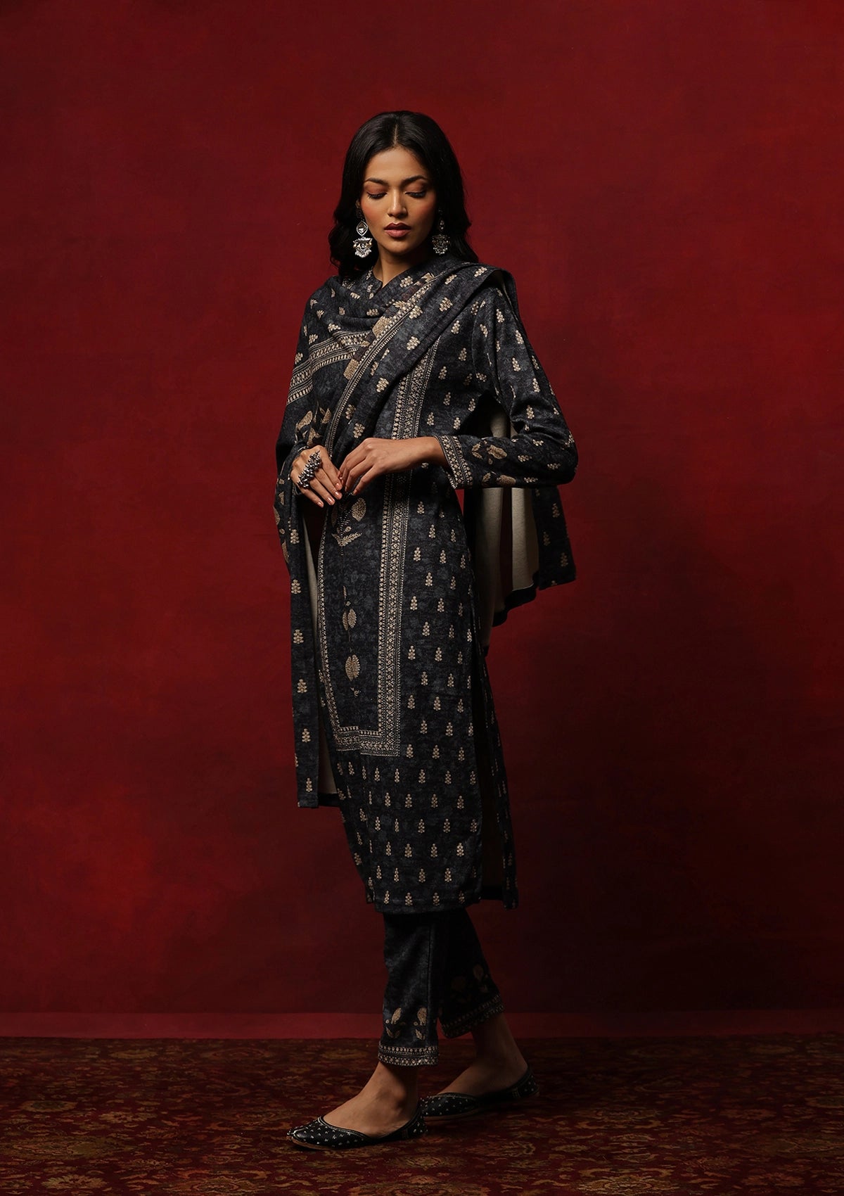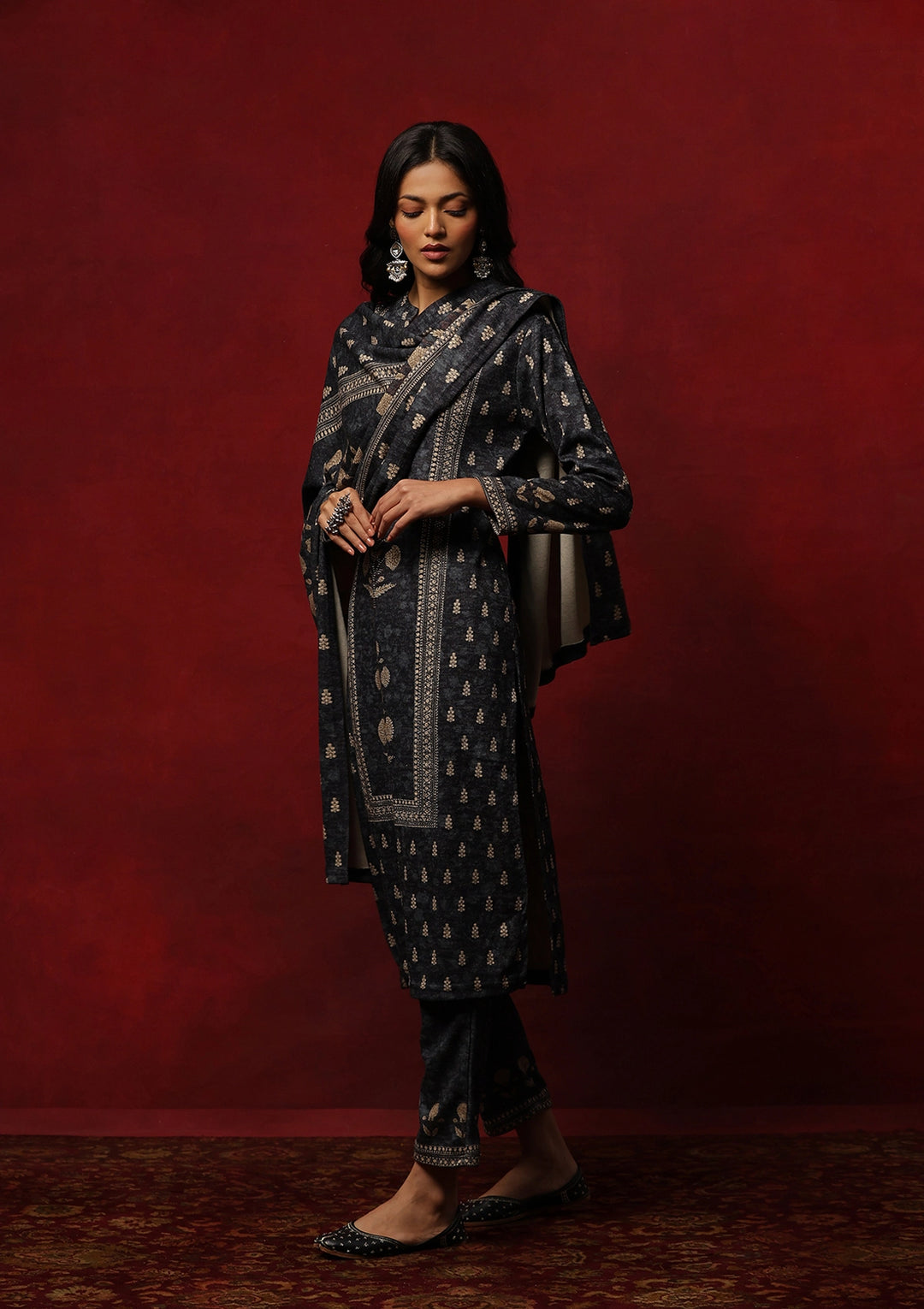 HOC Woollen Hand Embellished Printed Women's 3 PC Kurta Set -Dark Grey