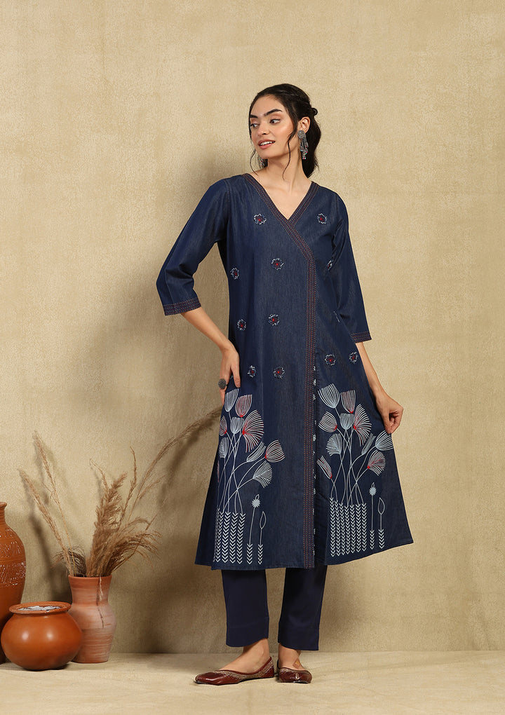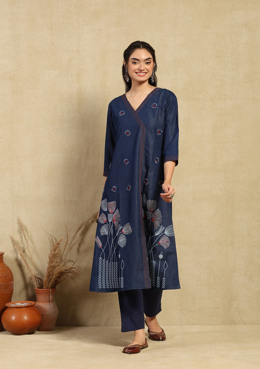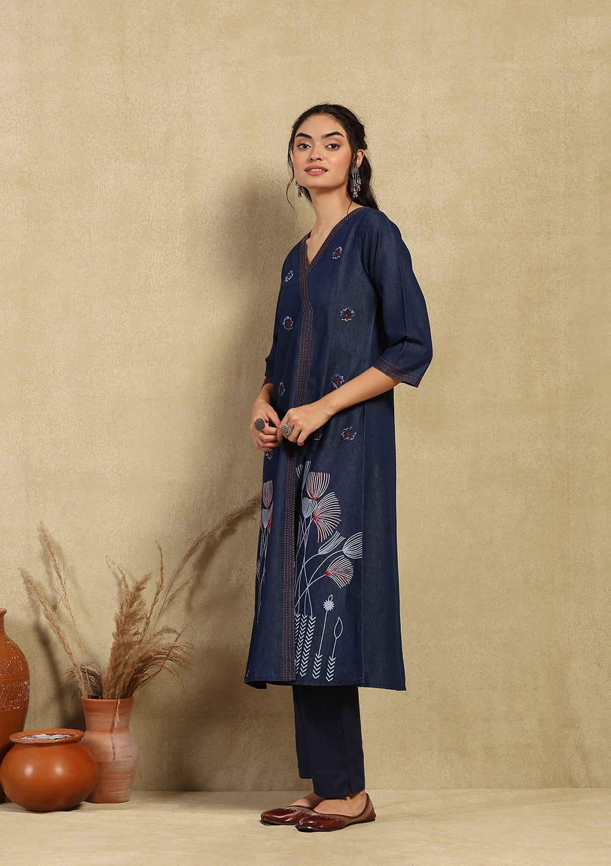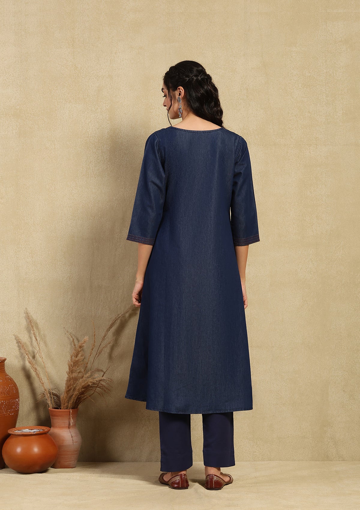 HOC Kantha Denim Printed Women's A-Line Kurta - Dark Blue