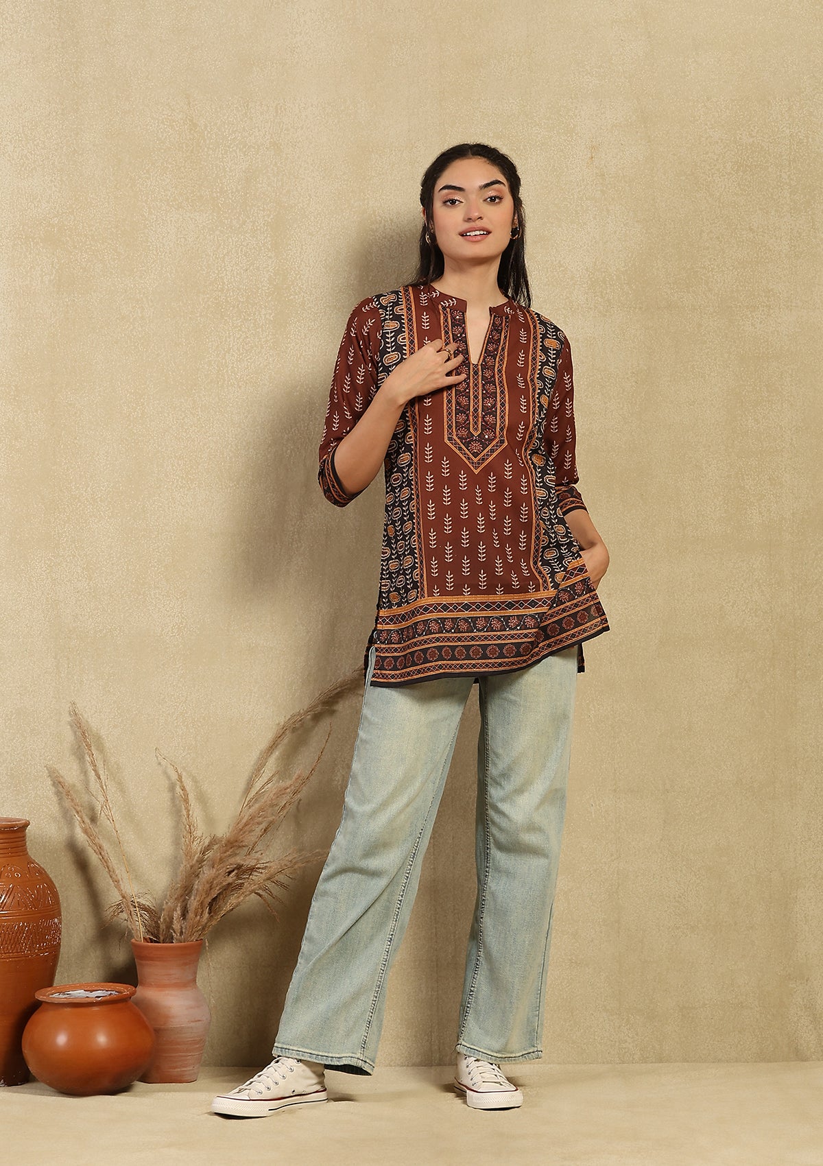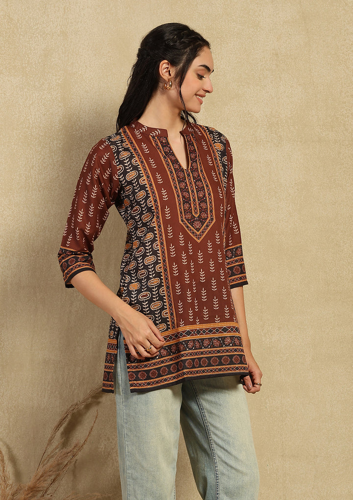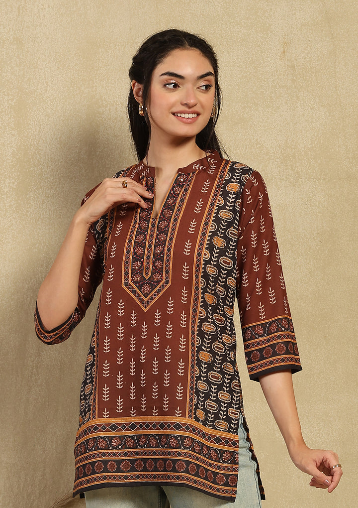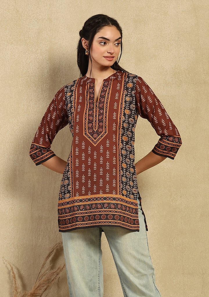 HOC Kashmiri Wool Aari Embroidered Solid Women's Short Kurta - Rust
