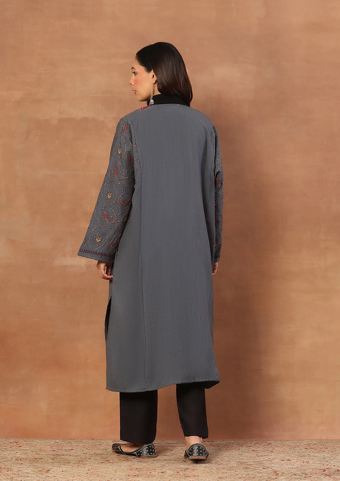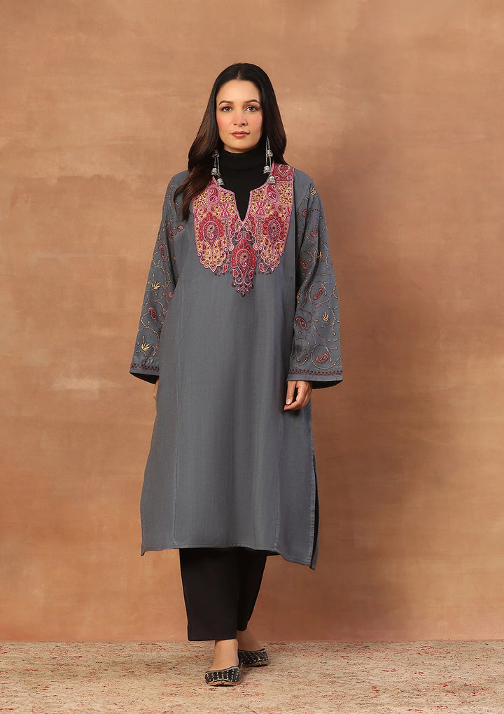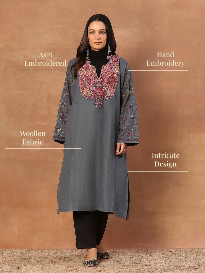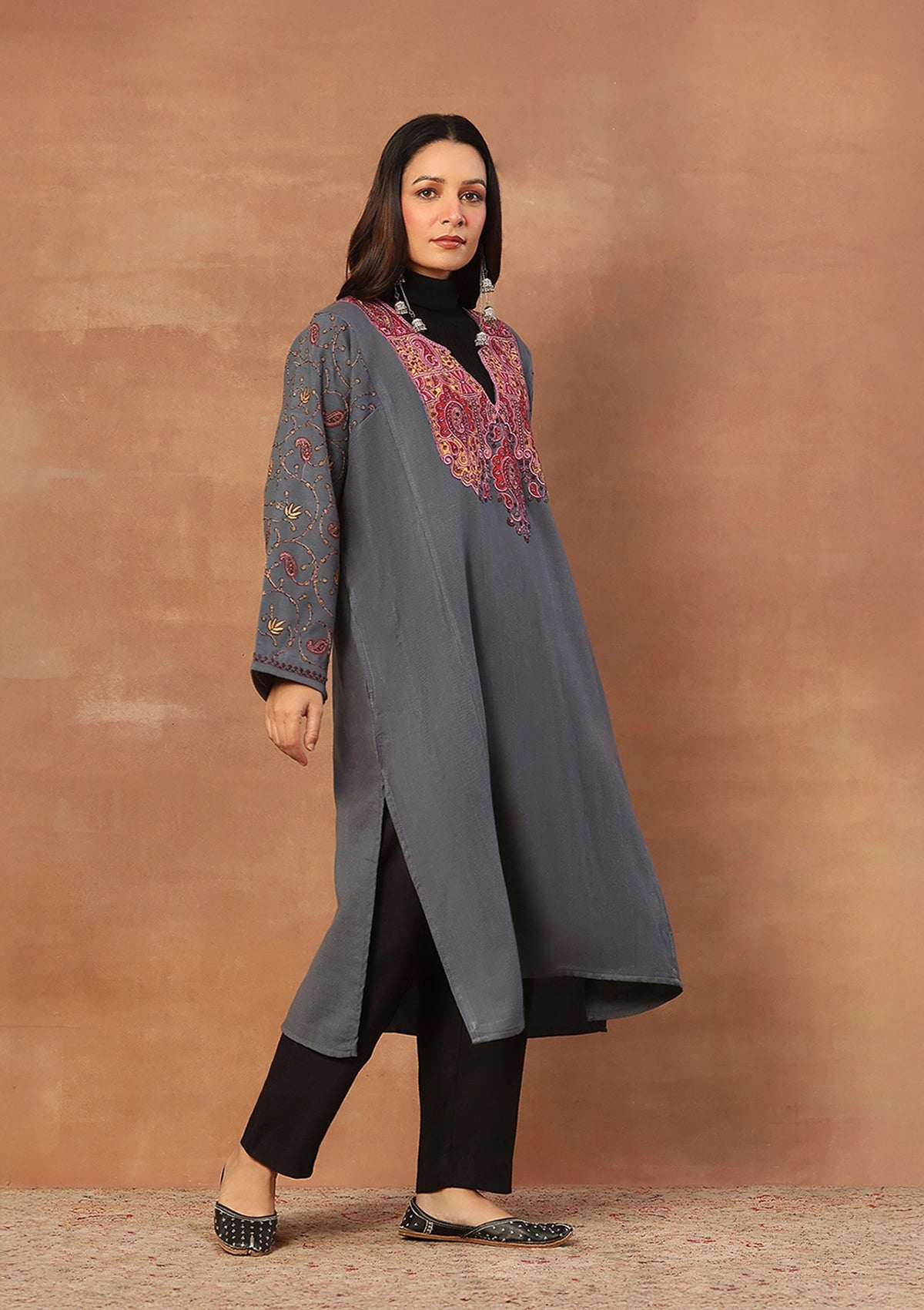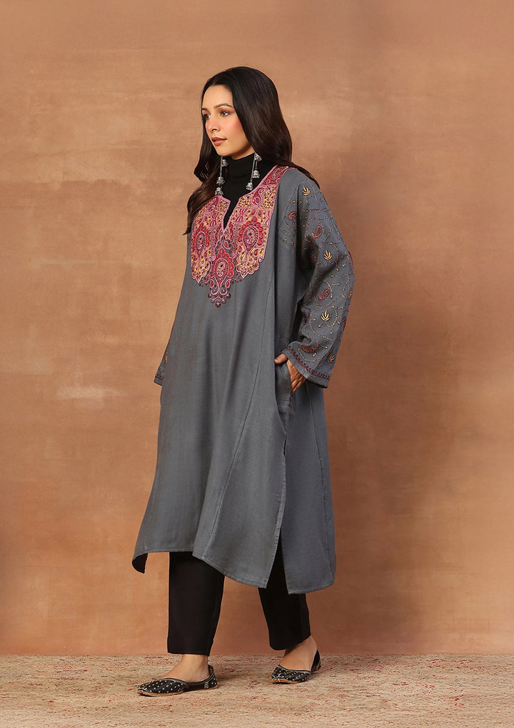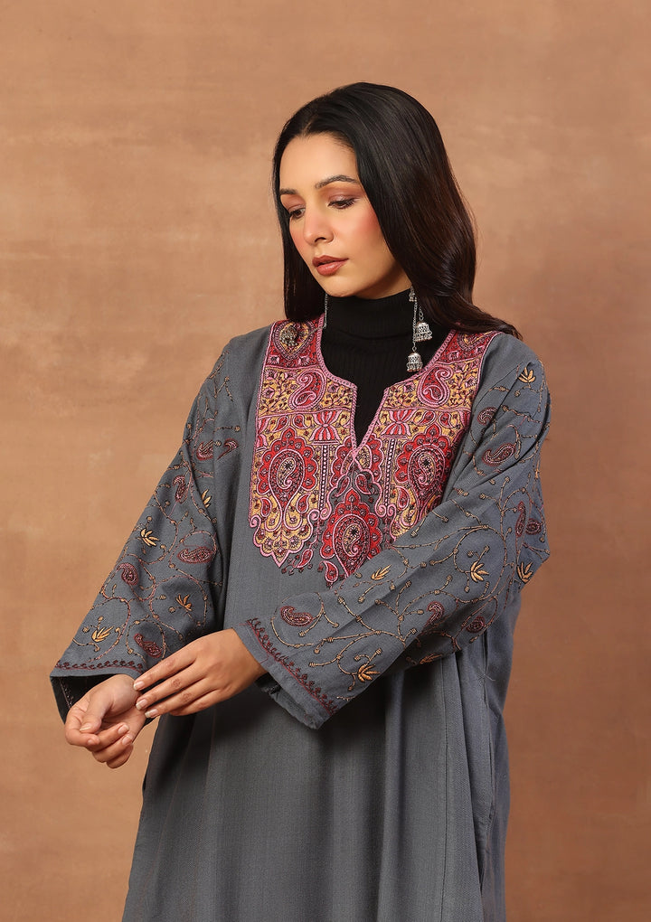 HOC Kashmiri Wool Sozni Solid Women's Long Phiran- Grey