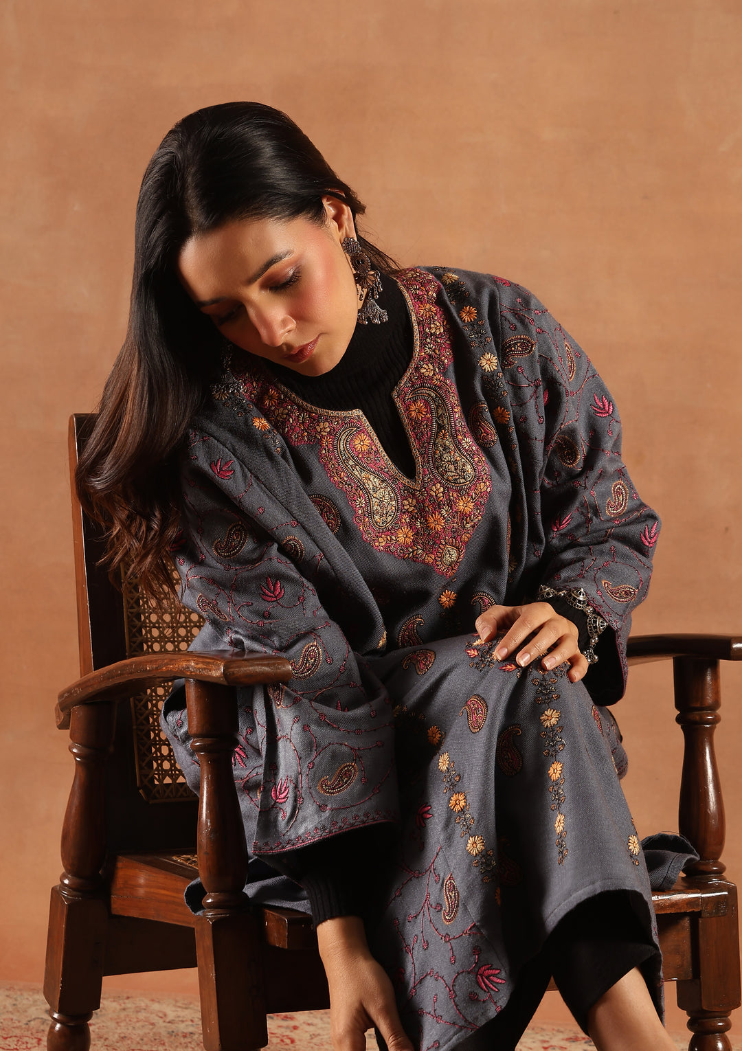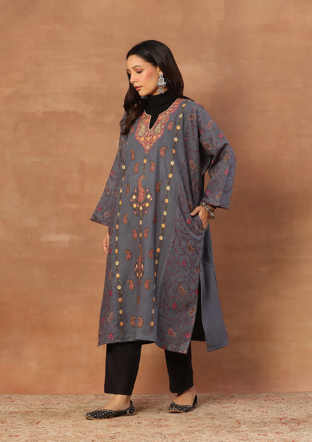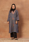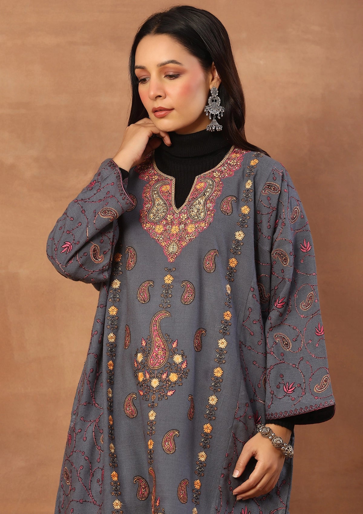 HOC Kashmiri Wool Sozni Solid Women's Long Phiran- Grey