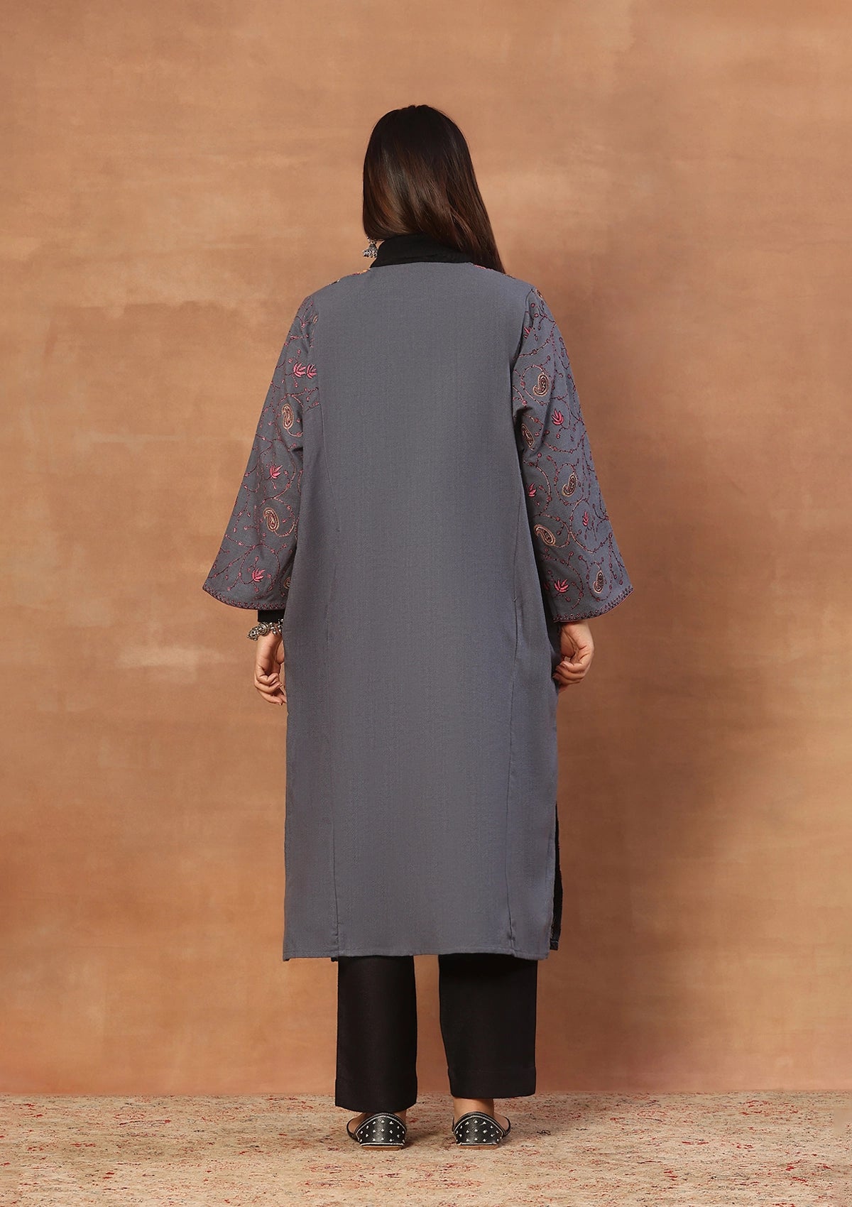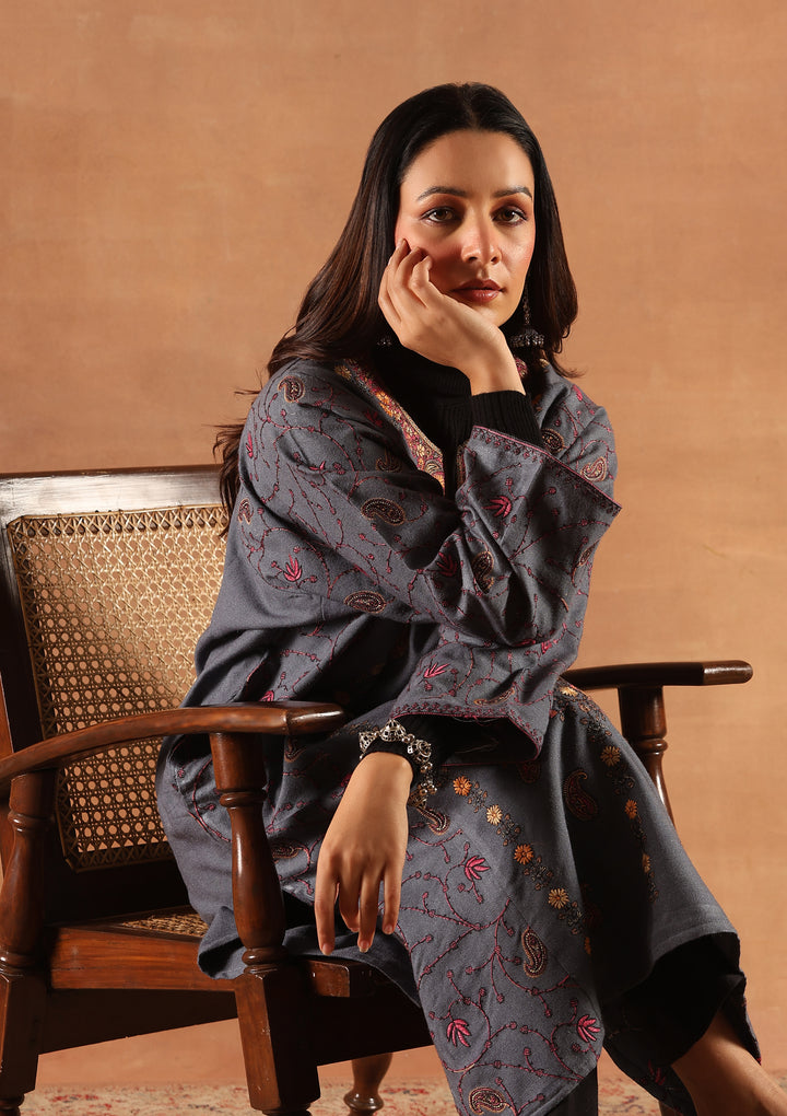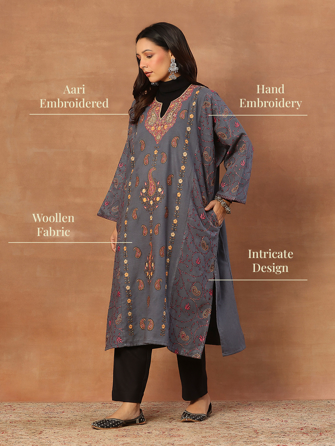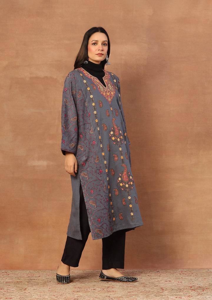 HOC Kashmiri Wool Sozni Solid Women's Long Phiran- Grey