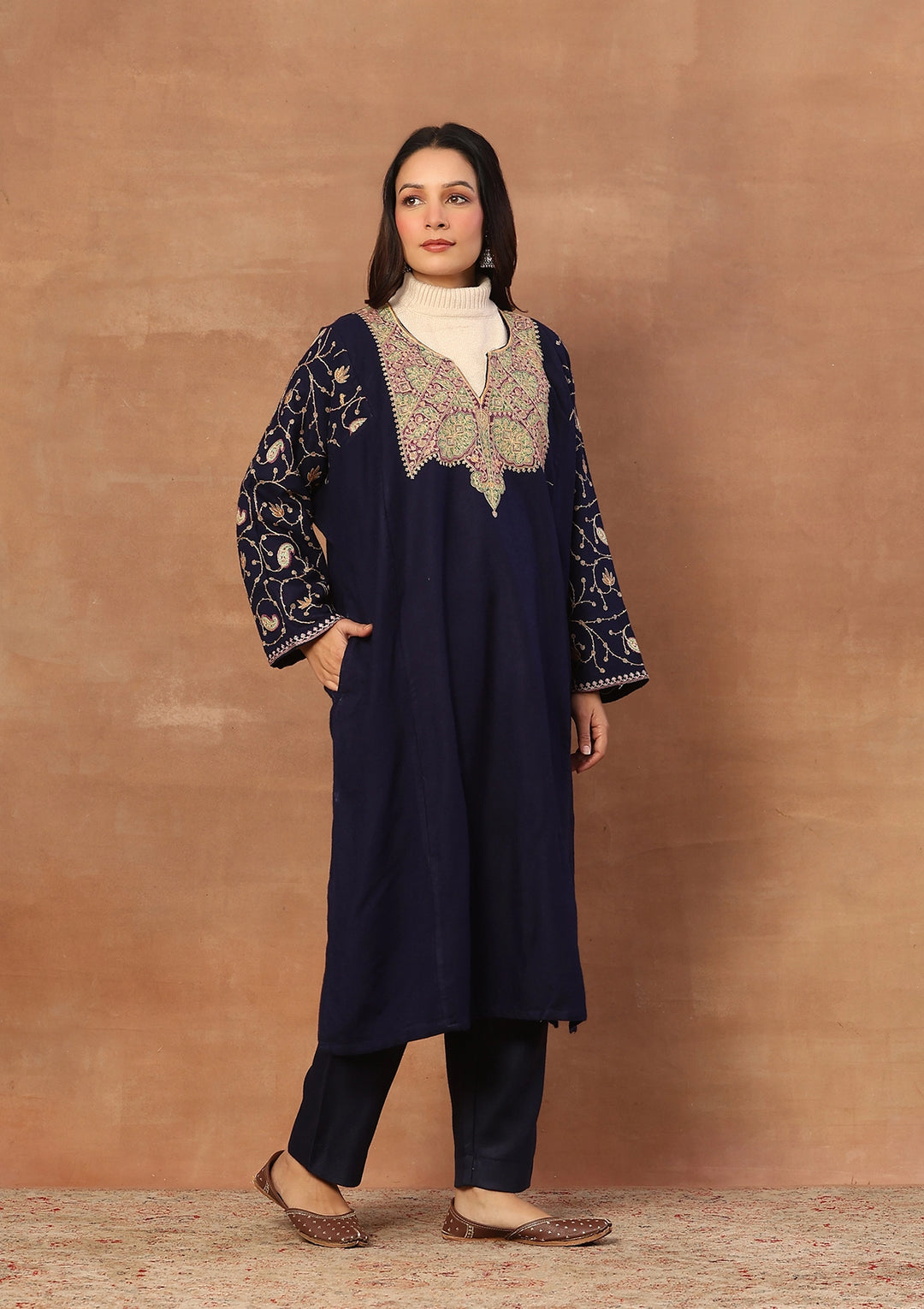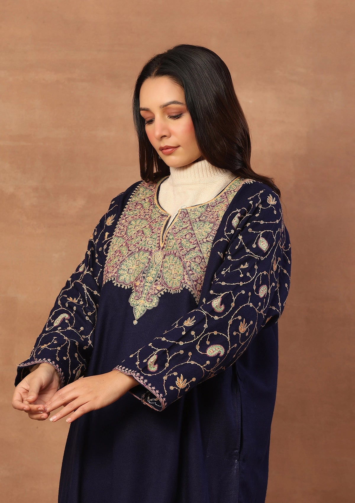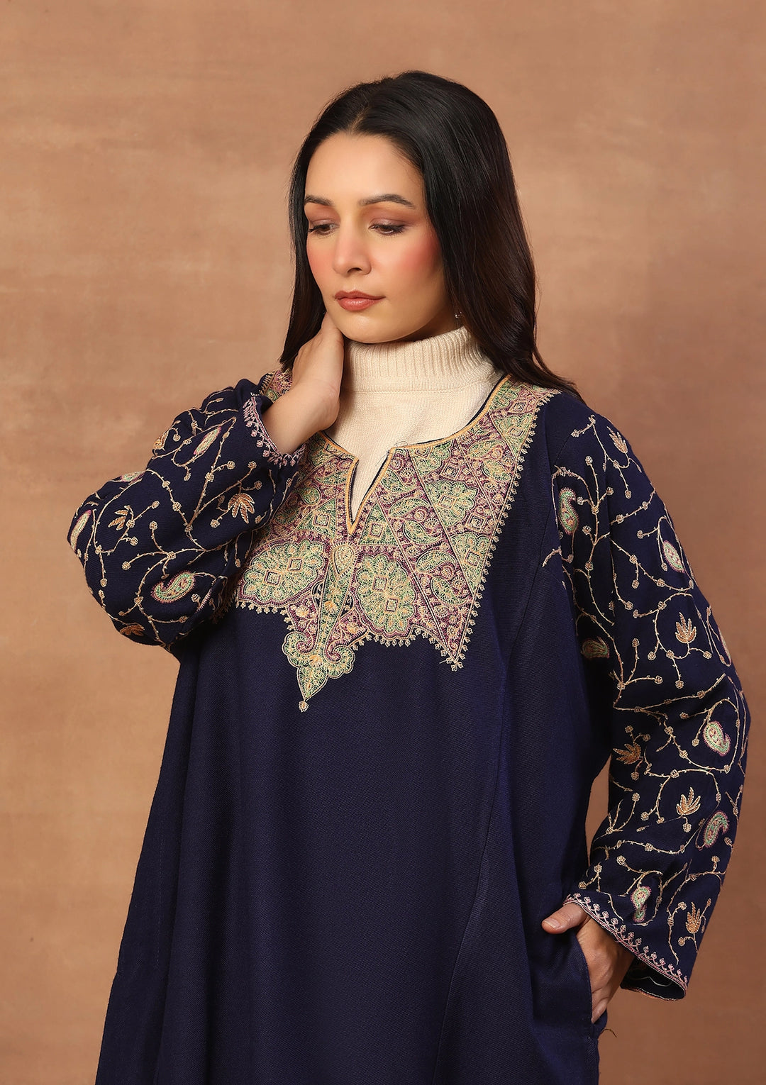 HOC Kashmiri Wool Sozni Solid Women's Long Phiran- Navy Blue