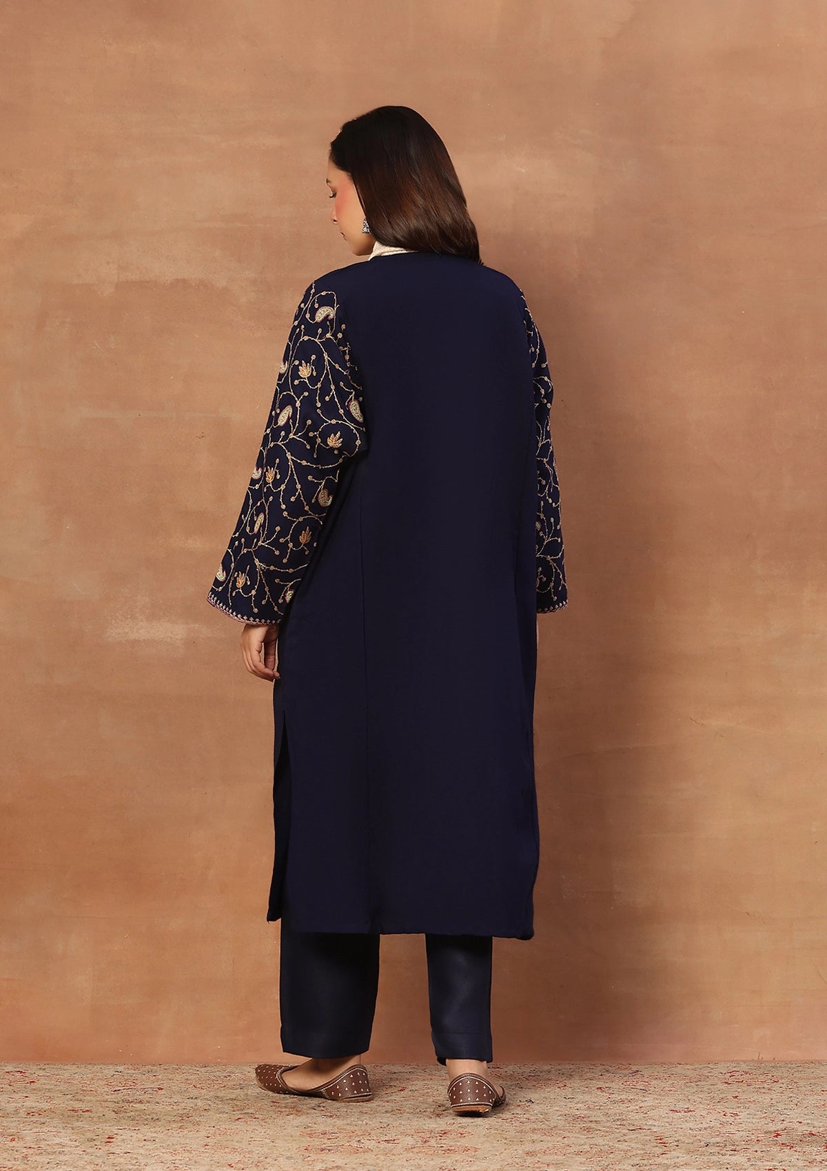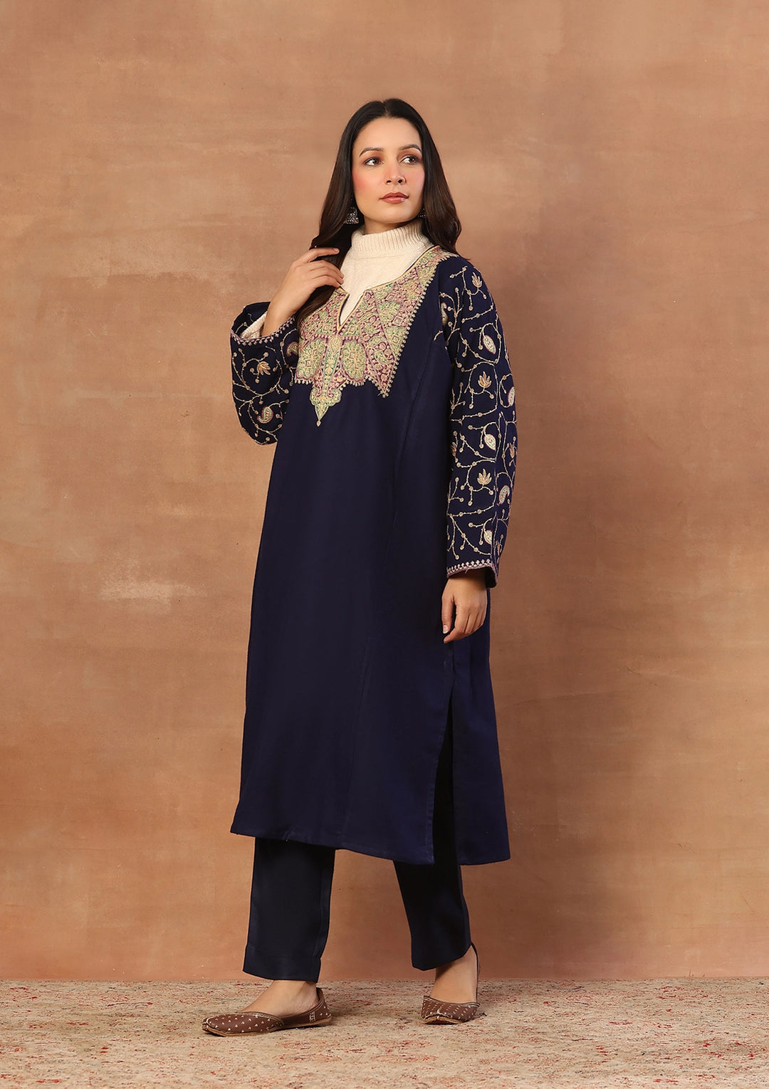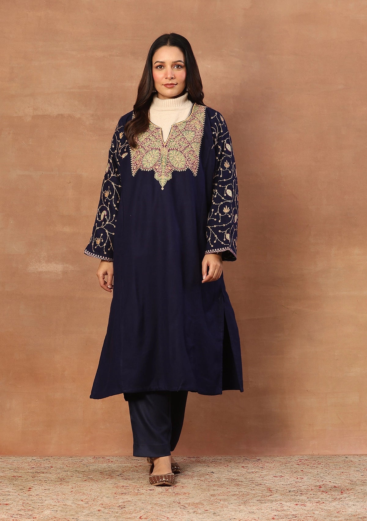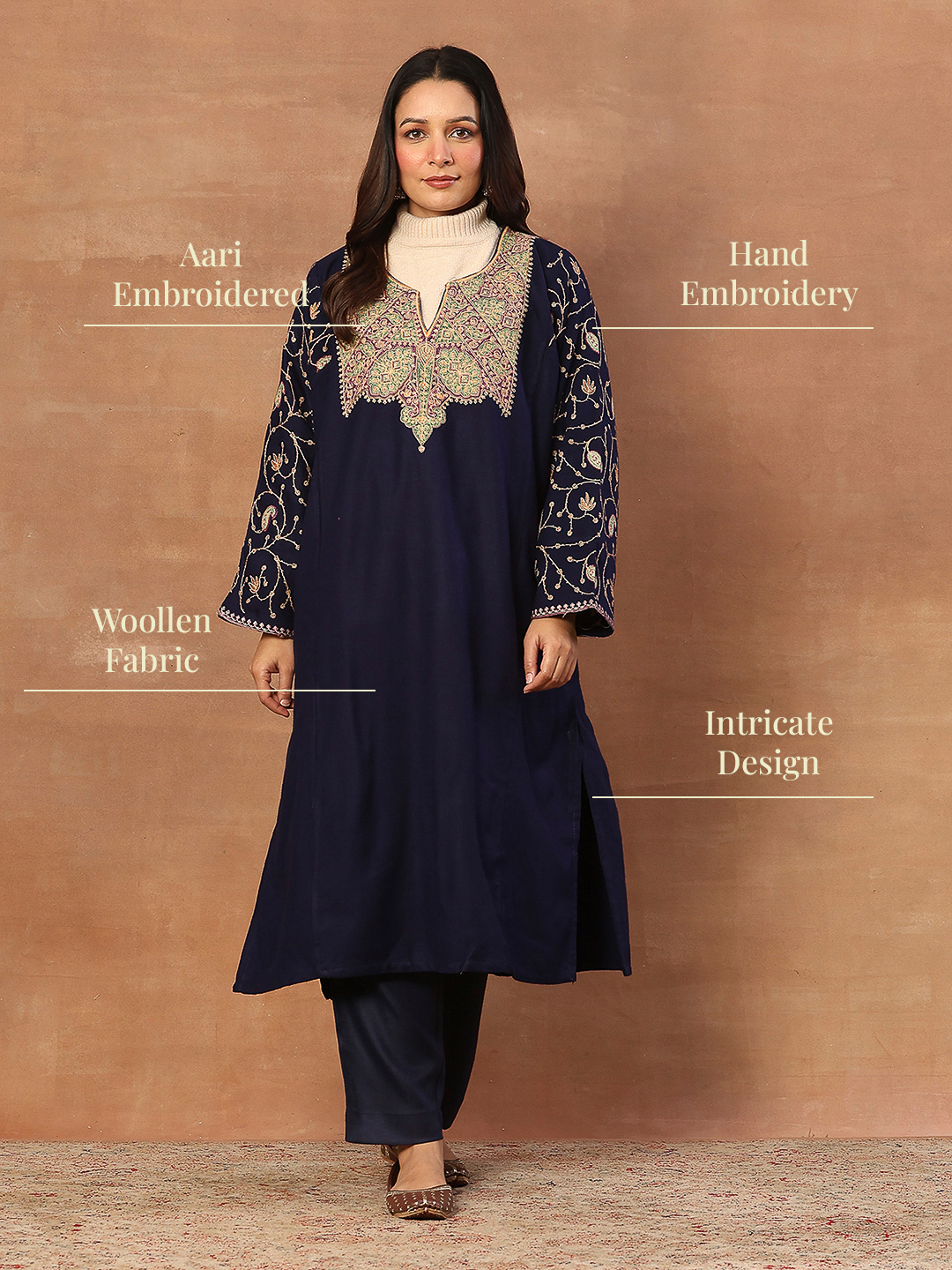 HOC Kashmiri Wool Sozni Solid Women's Long Phiran- Navy Blue