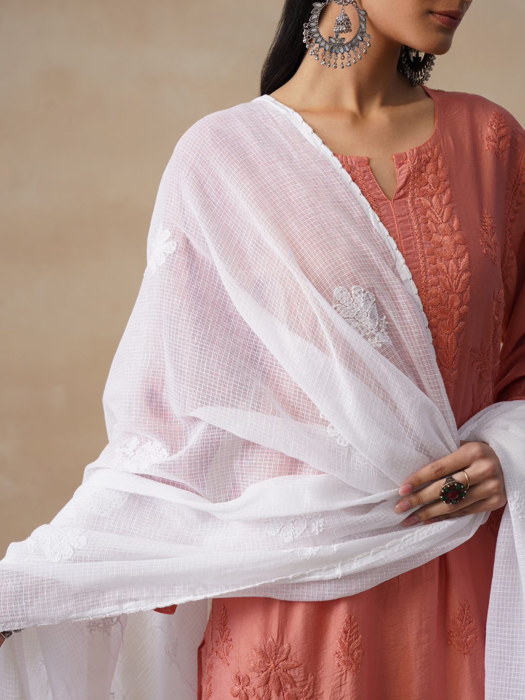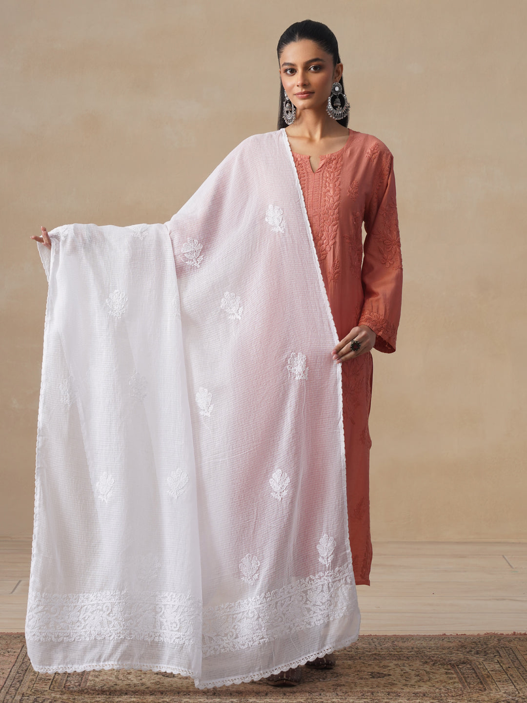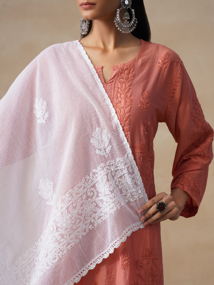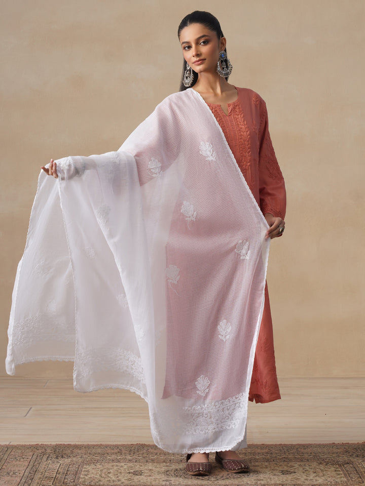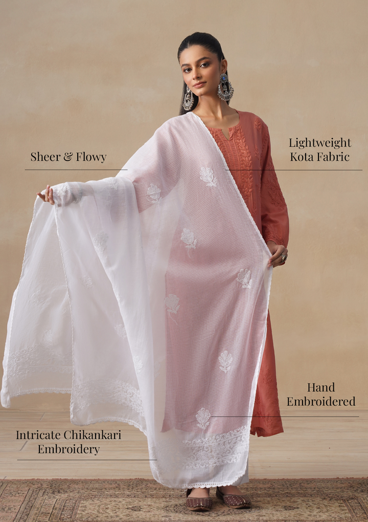 HOC Kota Chikankari Solid Women's Dupatta - White