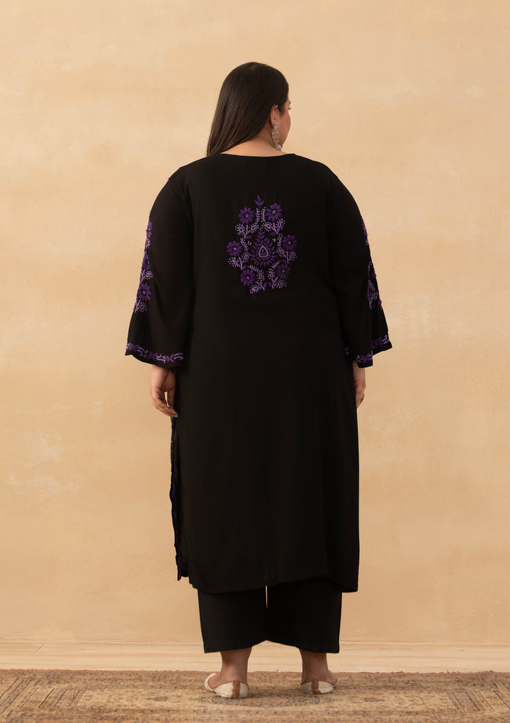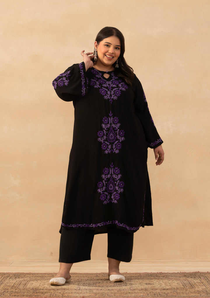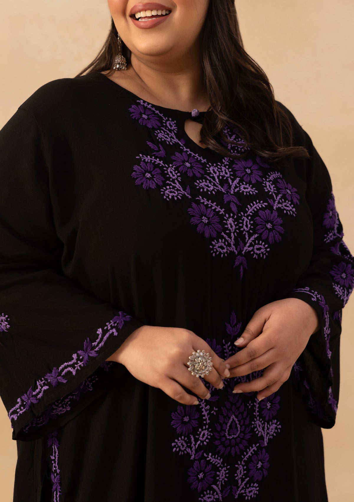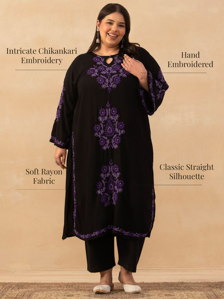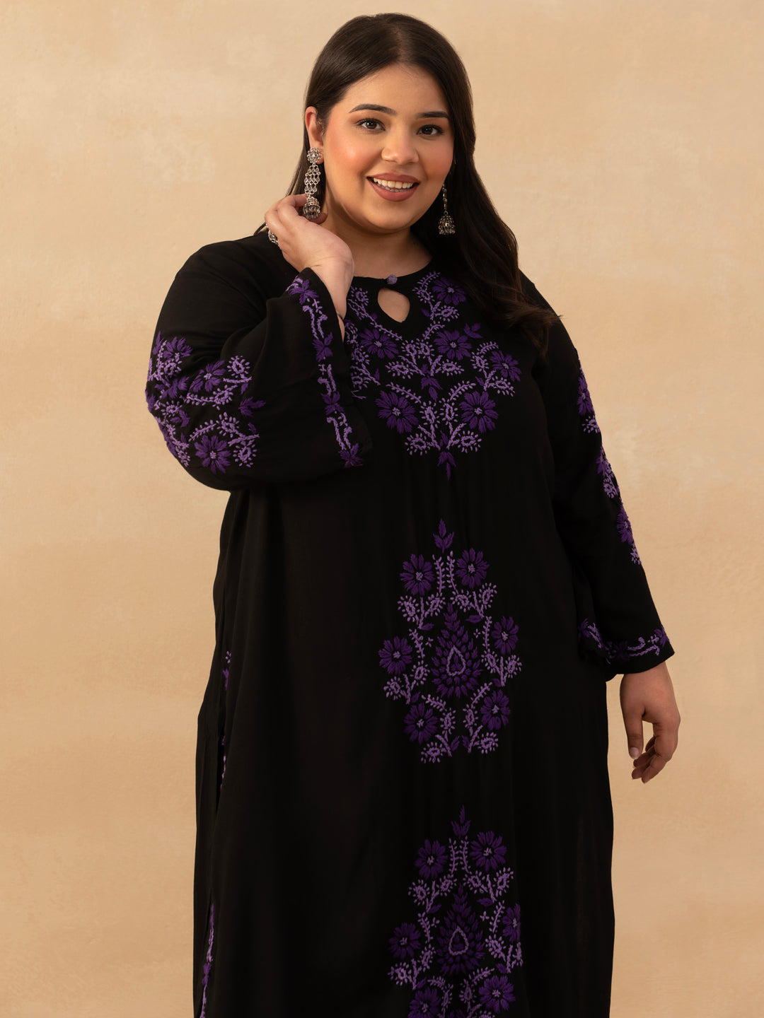 HOC Rayon Chikankari Solid Women's Long Kurta - Black