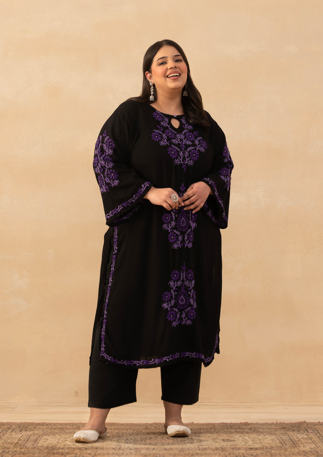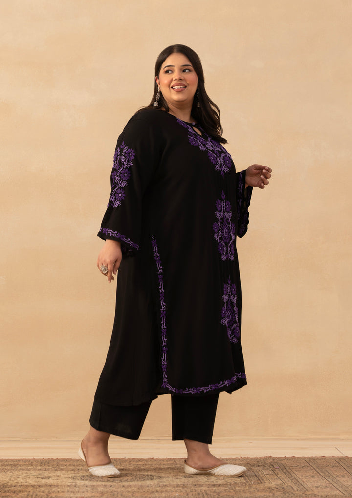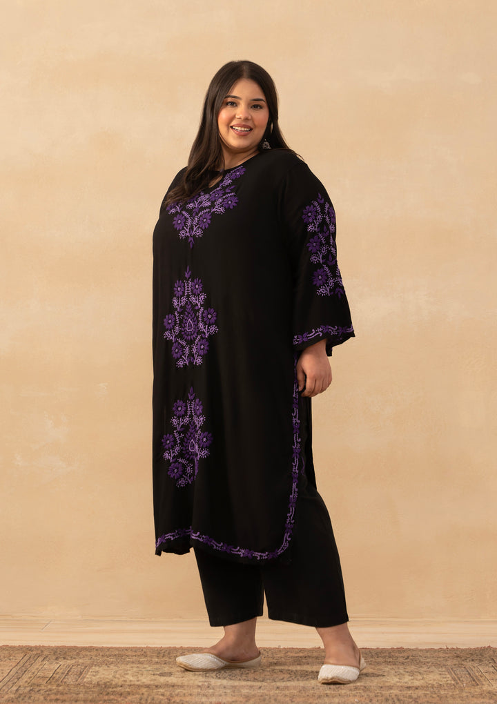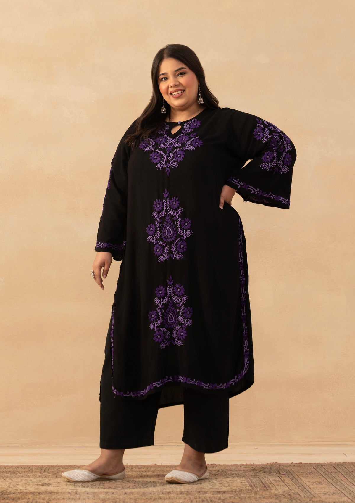 HOC Rayon Chikankari Solid Women's Long Kurta - Black